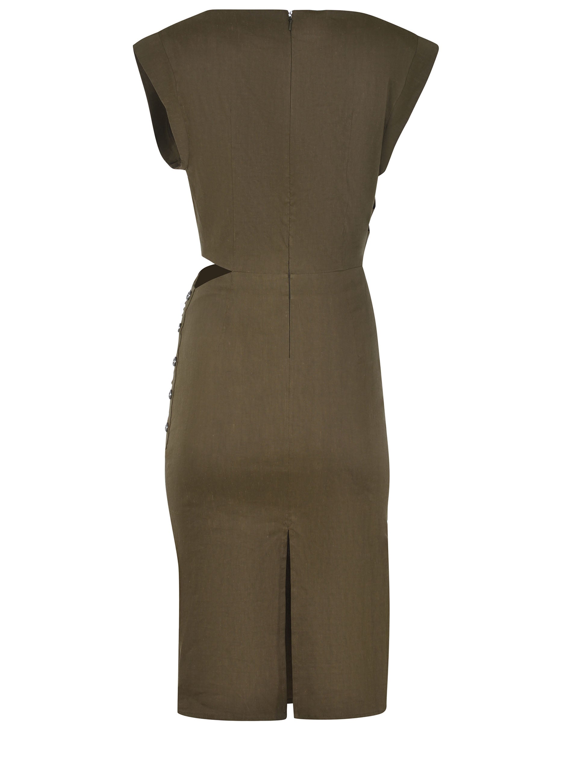 Pinko "Cielo" dress made of Olive Green linen blend. Sleeveless. Cut-out on the side. Contrasting side button details in silver metal. Invisible zip closure in the center back. Central slit on the back. 55% linen 42% viscose 3% elastane Made in Italy
