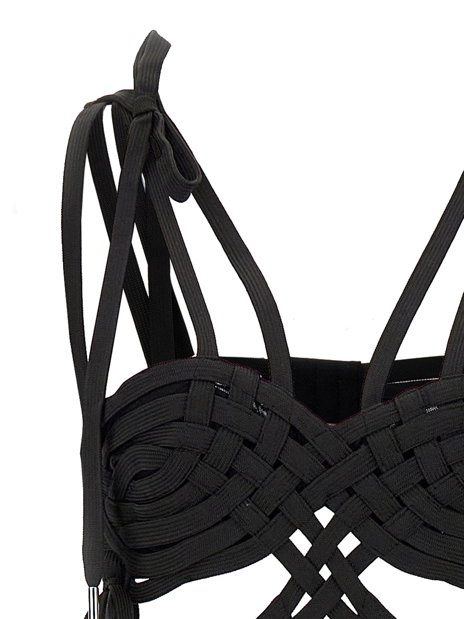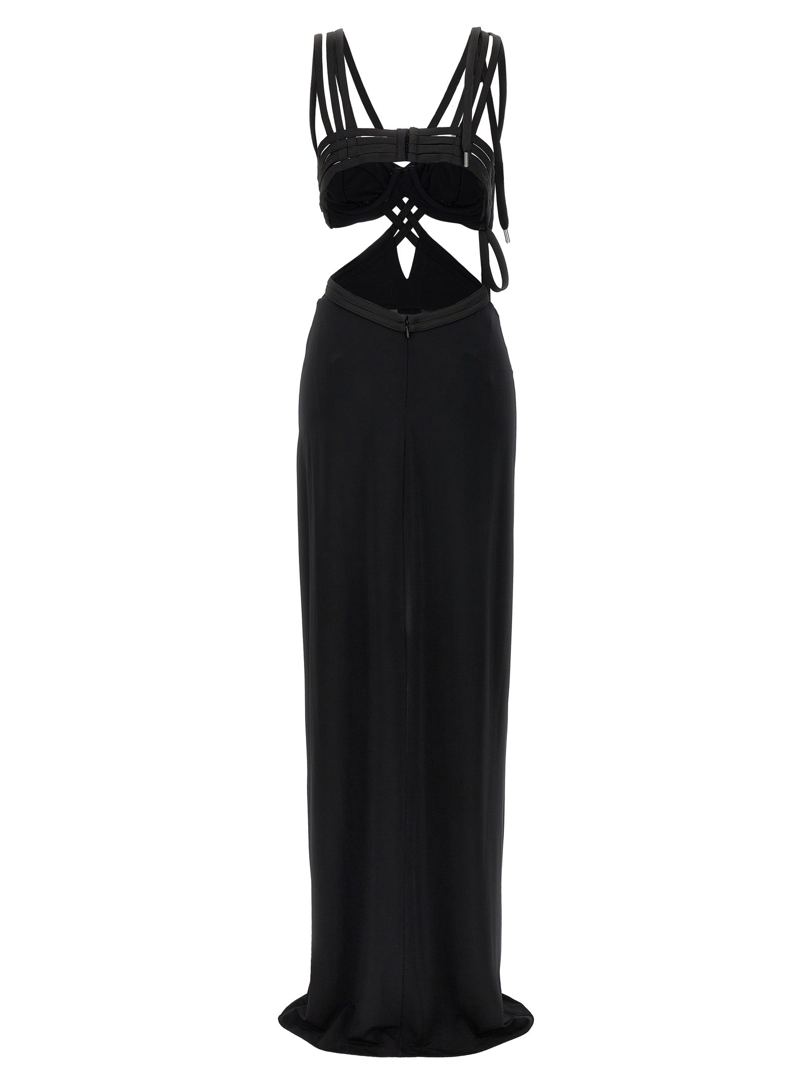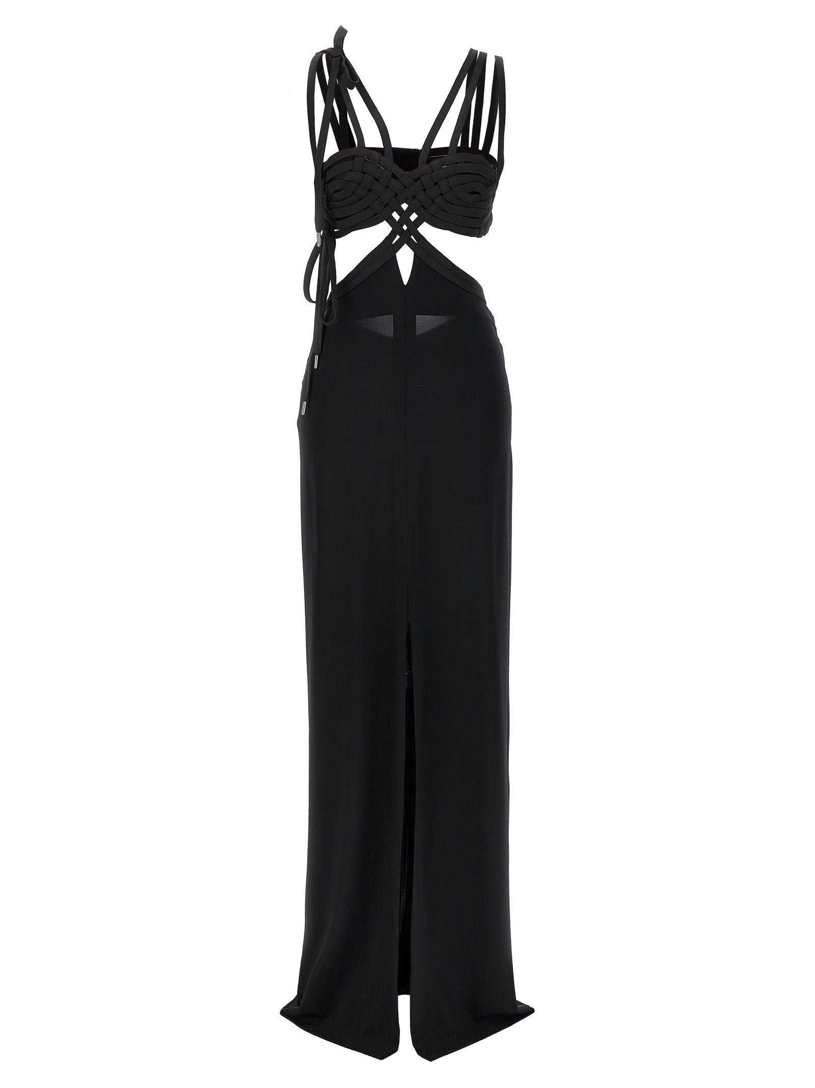 Long, sleeveless 'Era Glaciale' dress in stretch viscose jersey with corset with applied strings, thin straps, back hook closure, front split.