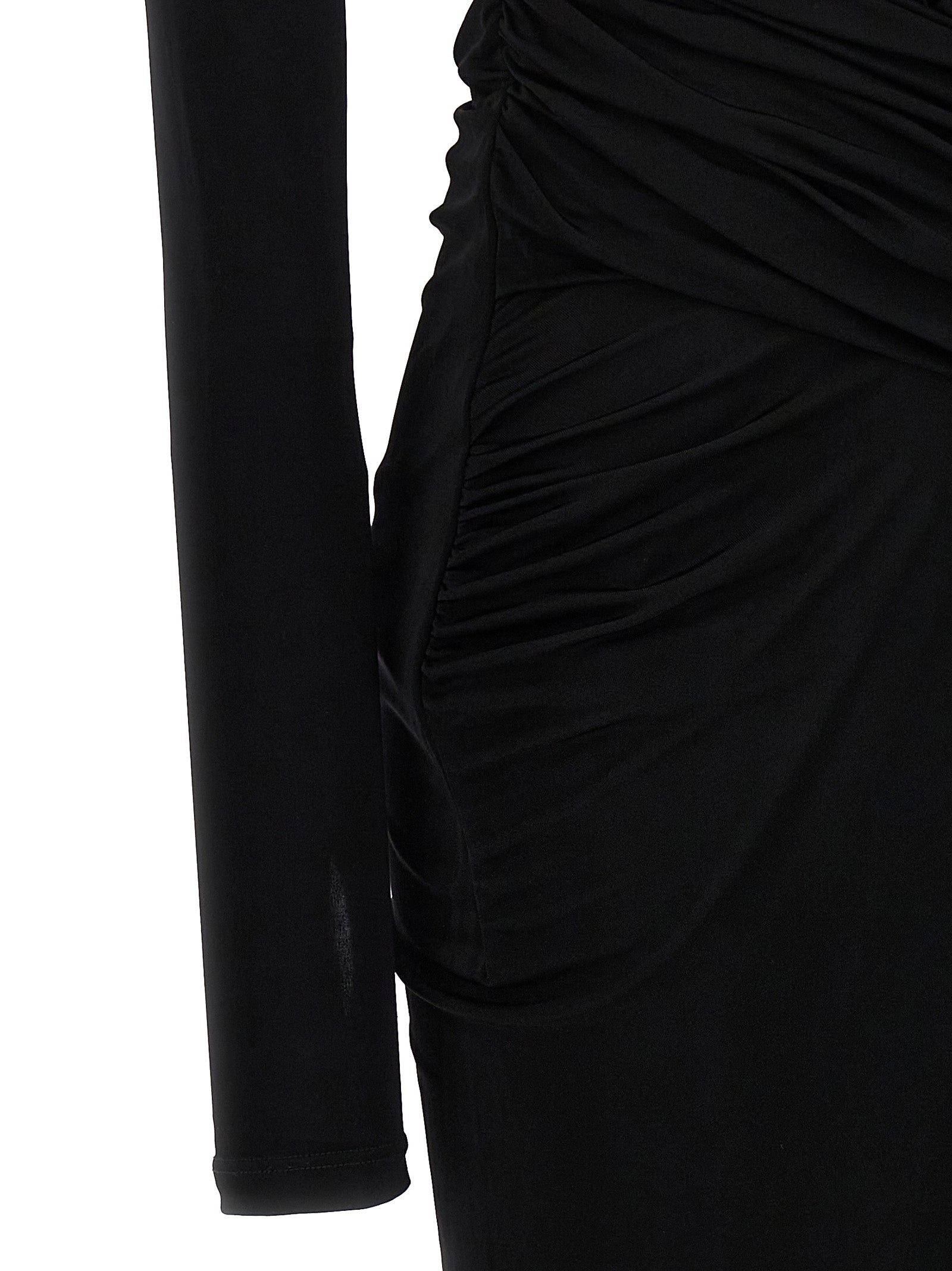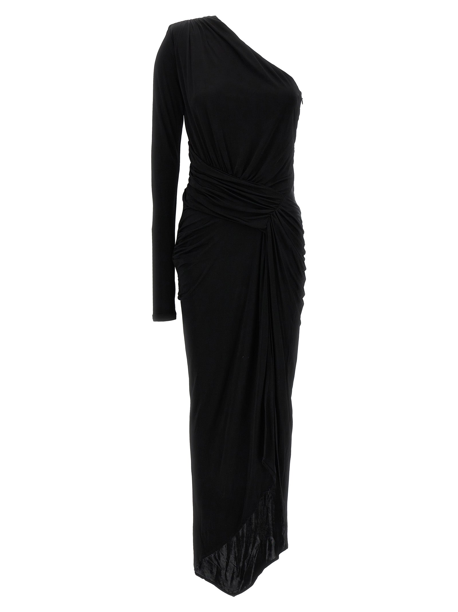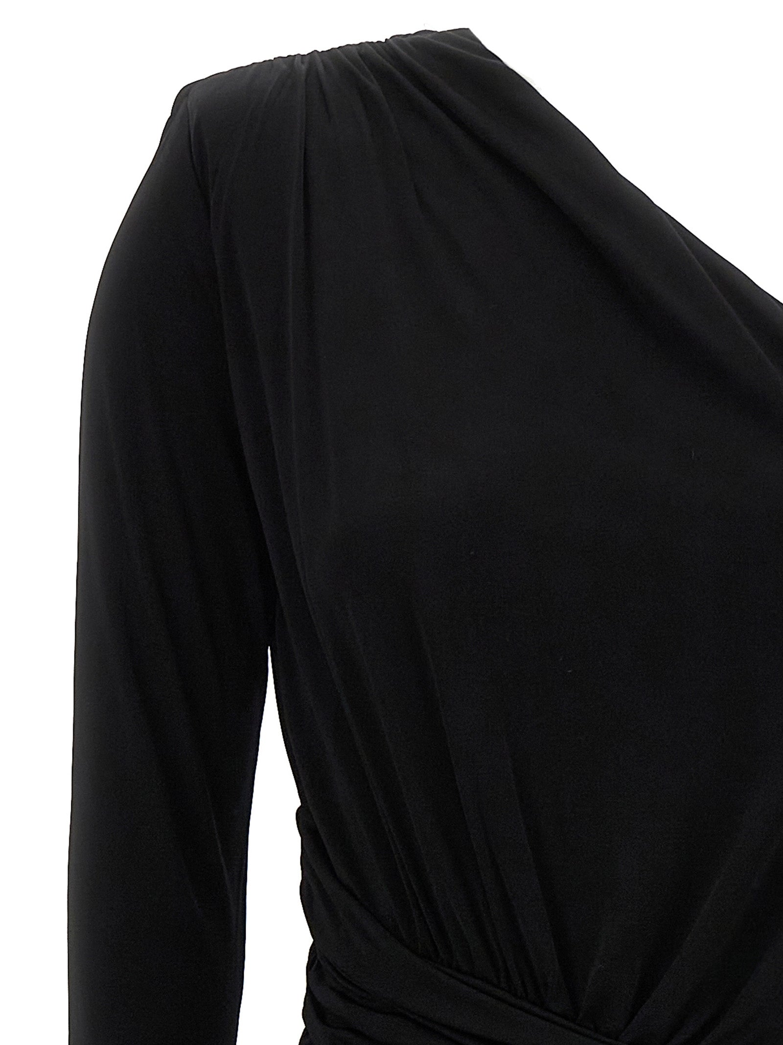 'Furnari' dress in draped shiny jersey, one-shoulder style with padded shoulder strap, long sleeves and side zip closure.