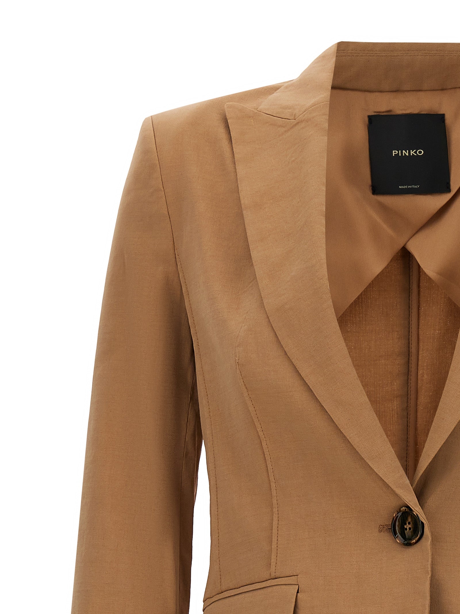 'Ghera' single-breasted blazer in stretch viscose blend linen with single button closure.