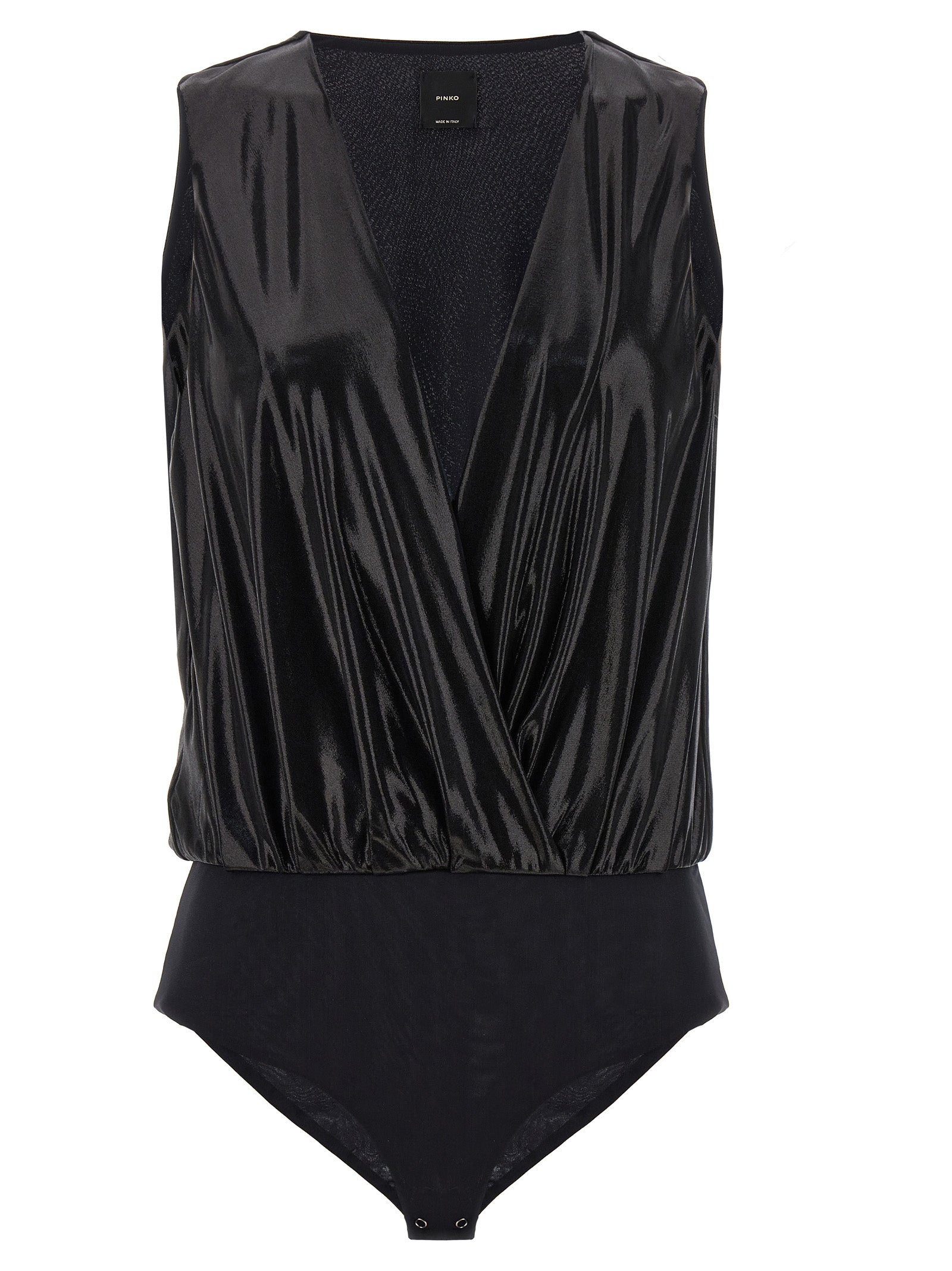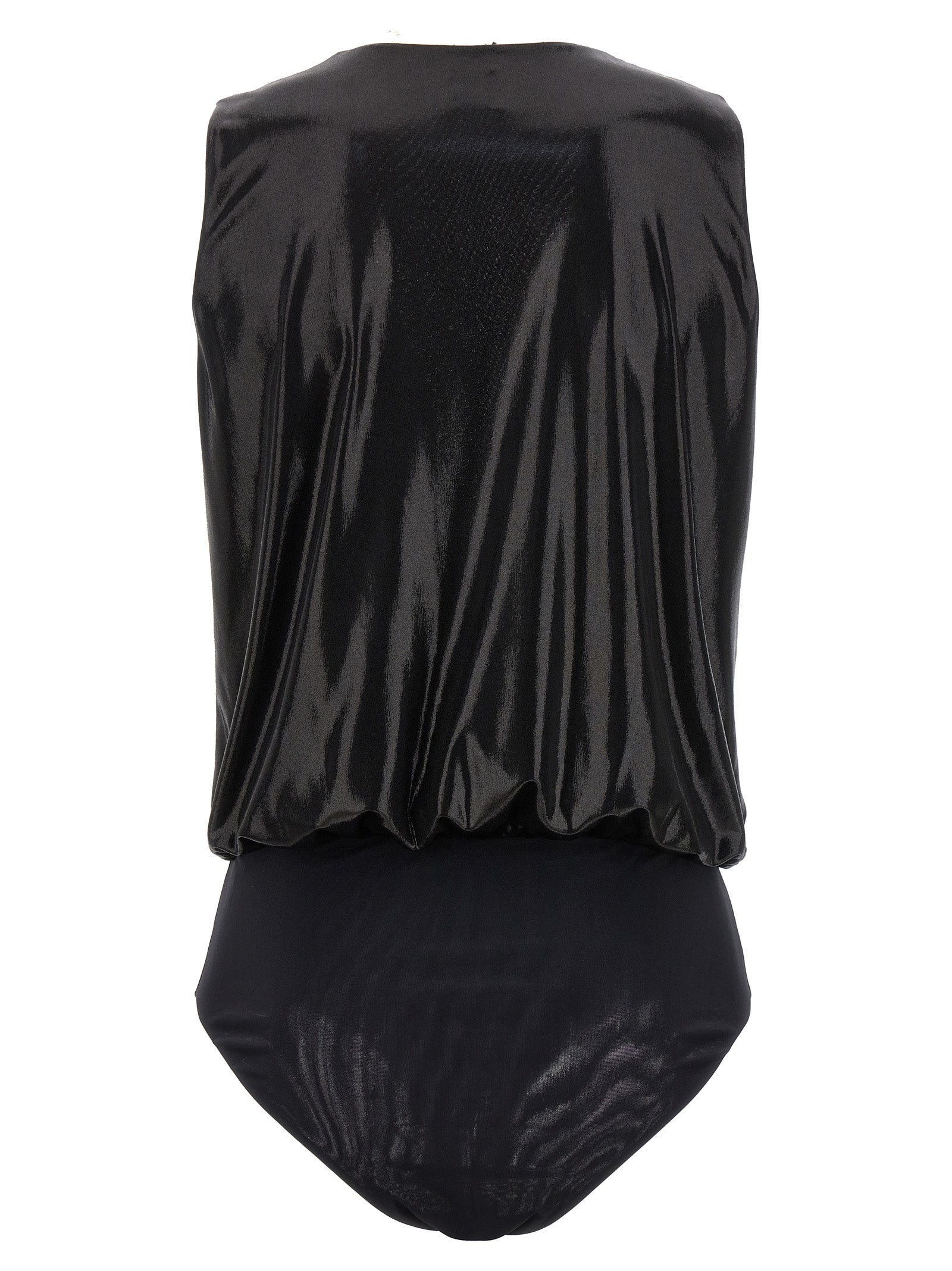 'Sassalloro' sleeveless style bodysuit in laminated fabric with V-neck.Laminated jersey 'Sassalloro' bodysuit, v-neck, sleeveless pattern.