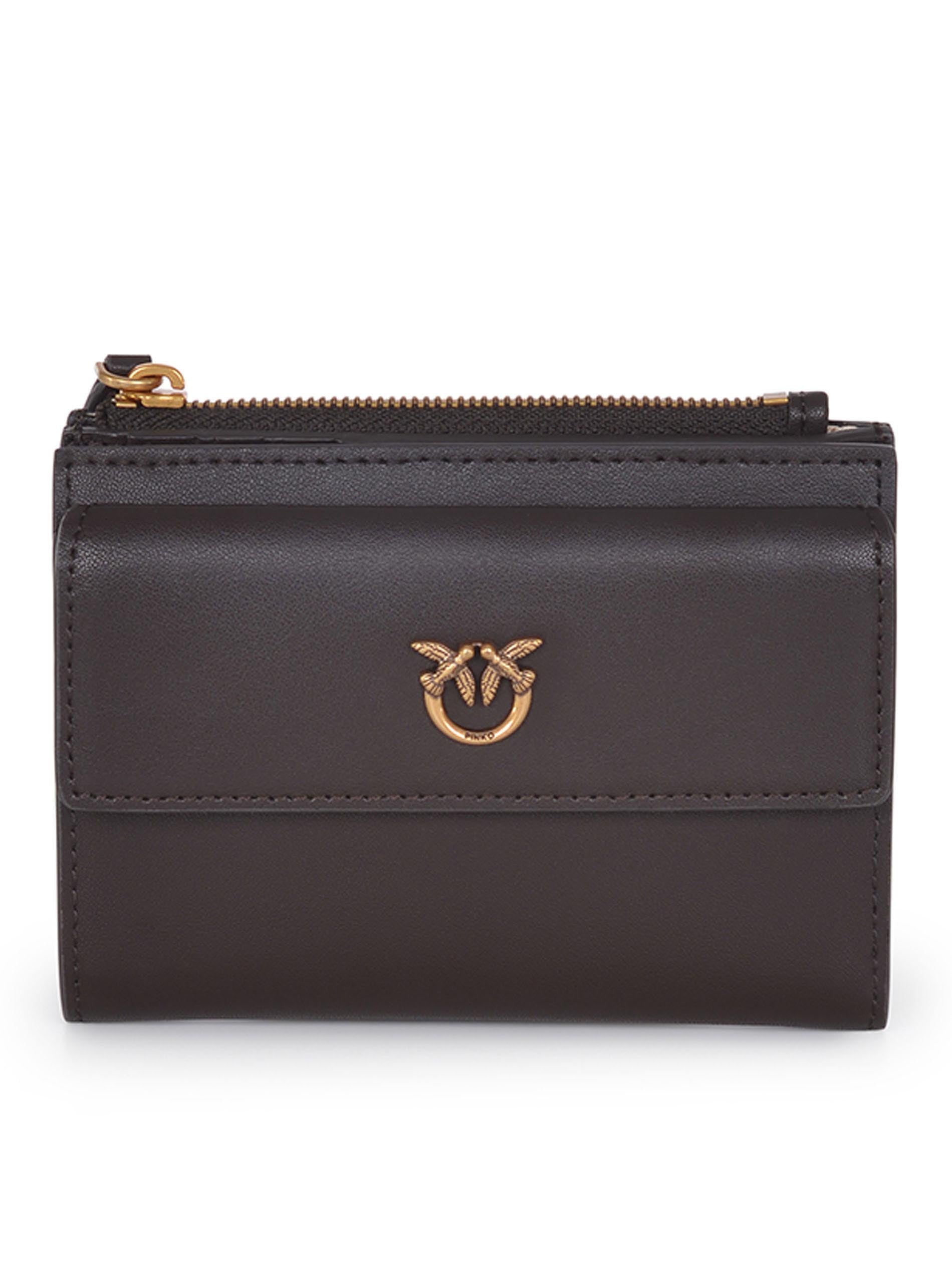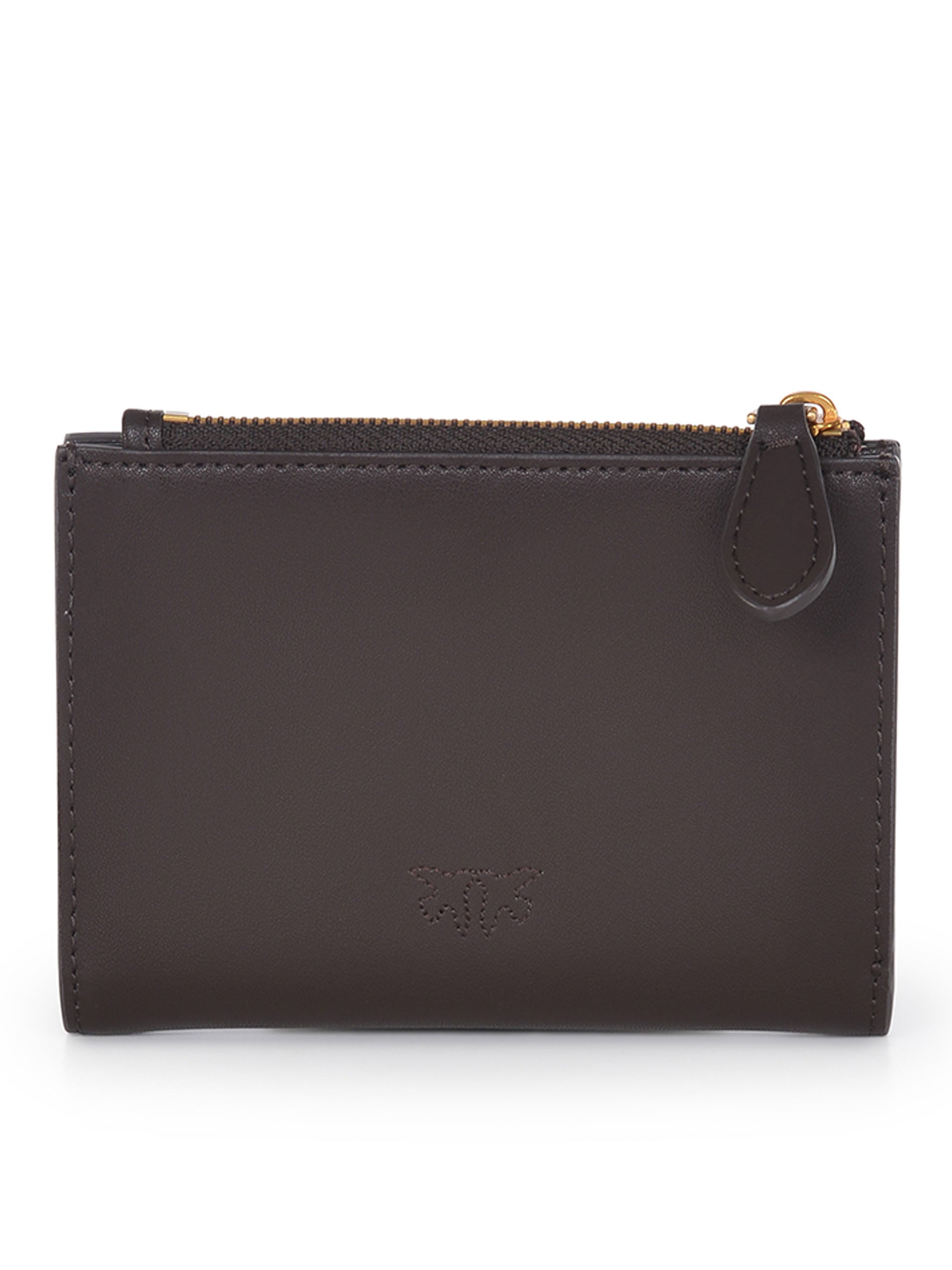 Pinko wallet "Compact" made of dark brown leather. Rectangular shape. Interior with compartments for banknotes and cards. Exterior includes two coin pockets with zip closure and a flap personalized with a small metal plate logo "Love Birds". Central snap button. "Love Birds" logo embroidered on the back. Height: 9 cm Width: 3 cm Length: 13 cm 100% leather.