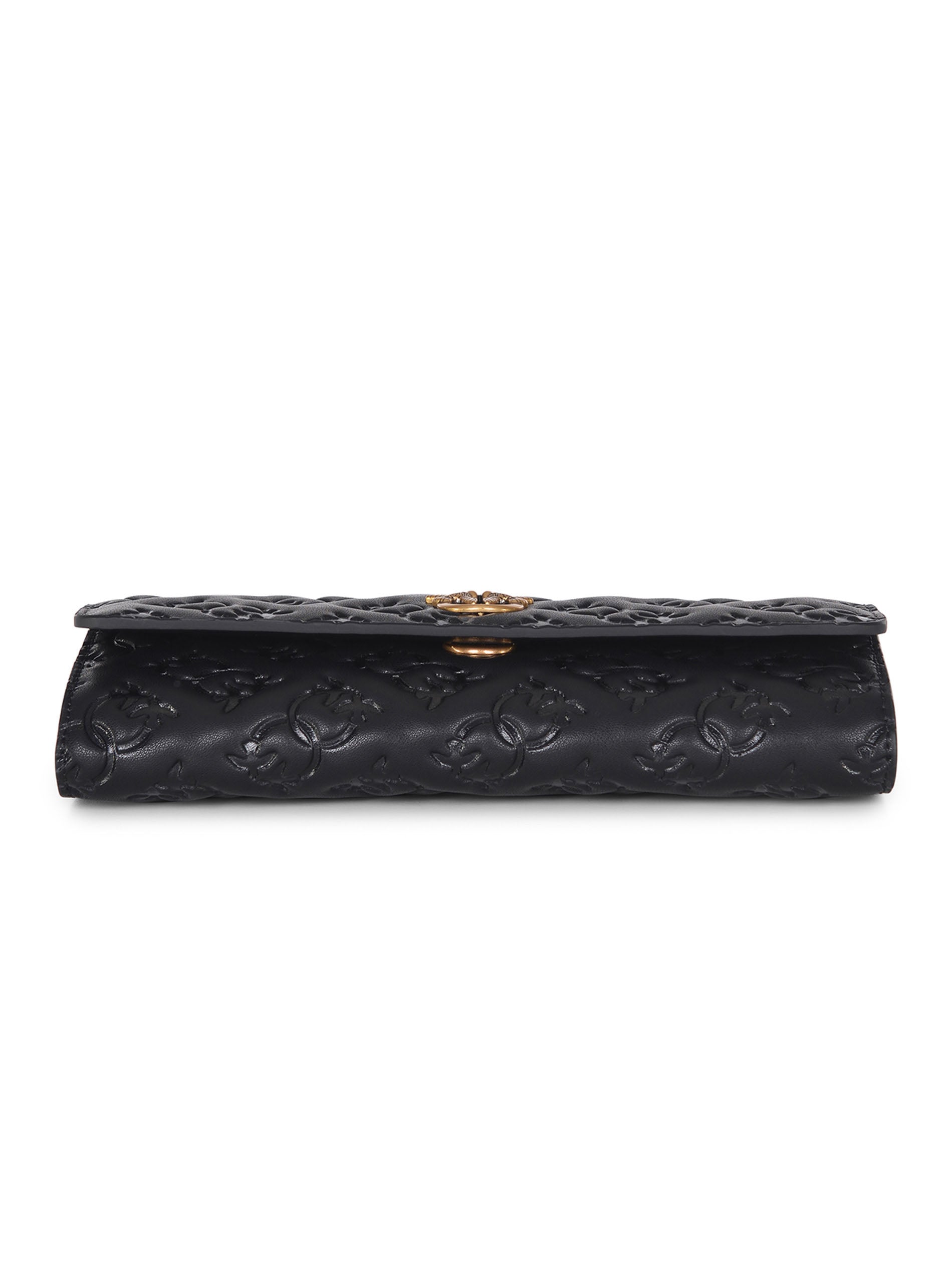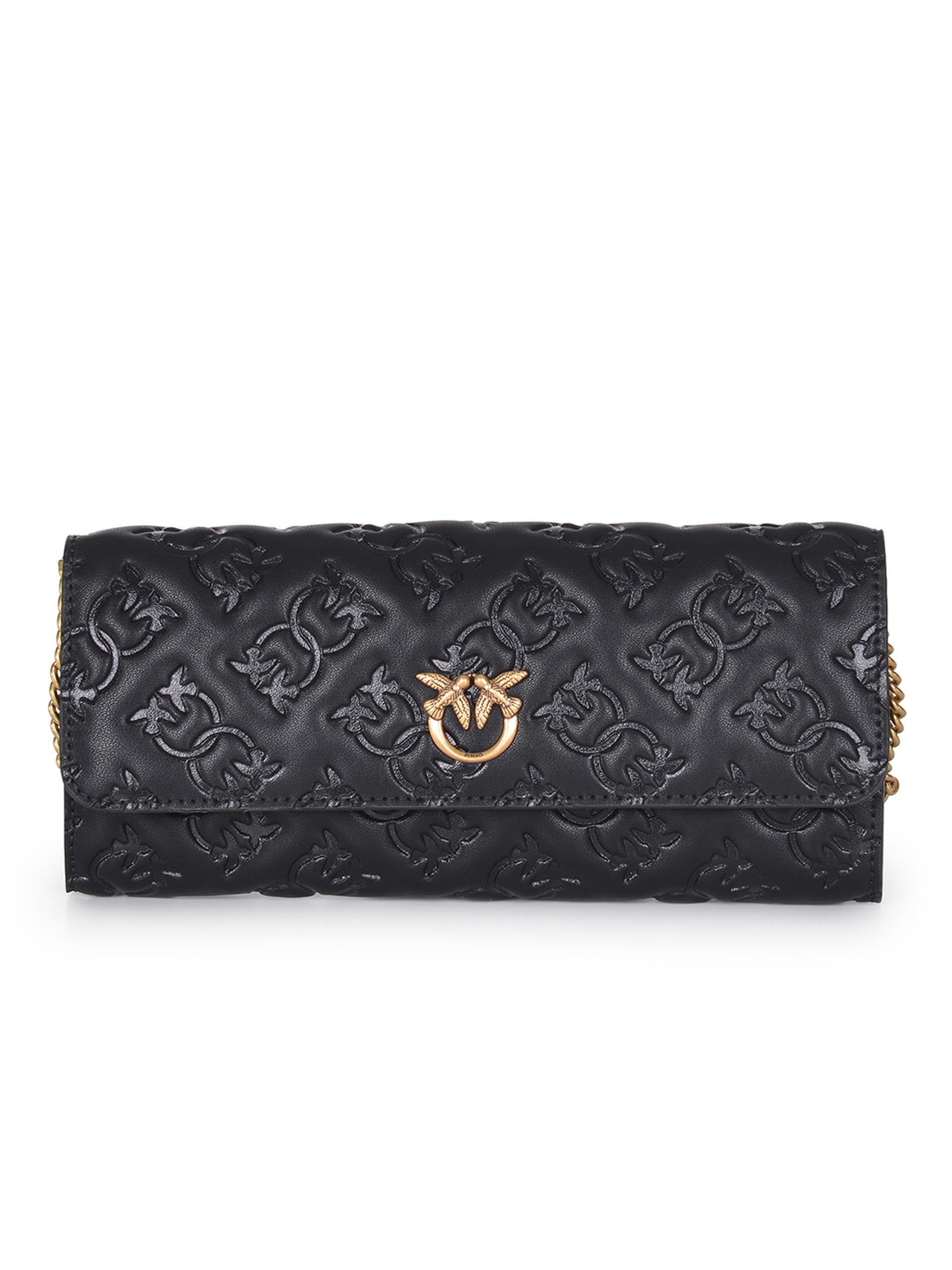 Pinko wallet 'Love Tiny Birds' made of black leather. Tone-on-tone all-over embossed logo. Gold metal inserts. Rectangular designer. Closure with 'Love Birds Diamond Cut' logo. Lined interior. Card slots. Zip pocket. Gold chain shoulder strap, which combines an adjustable and removable leather shoulder pad. Measurements Height 9cm, Width 4cm, Length 20cm. Lining 100% Polyester, 100% Leather.