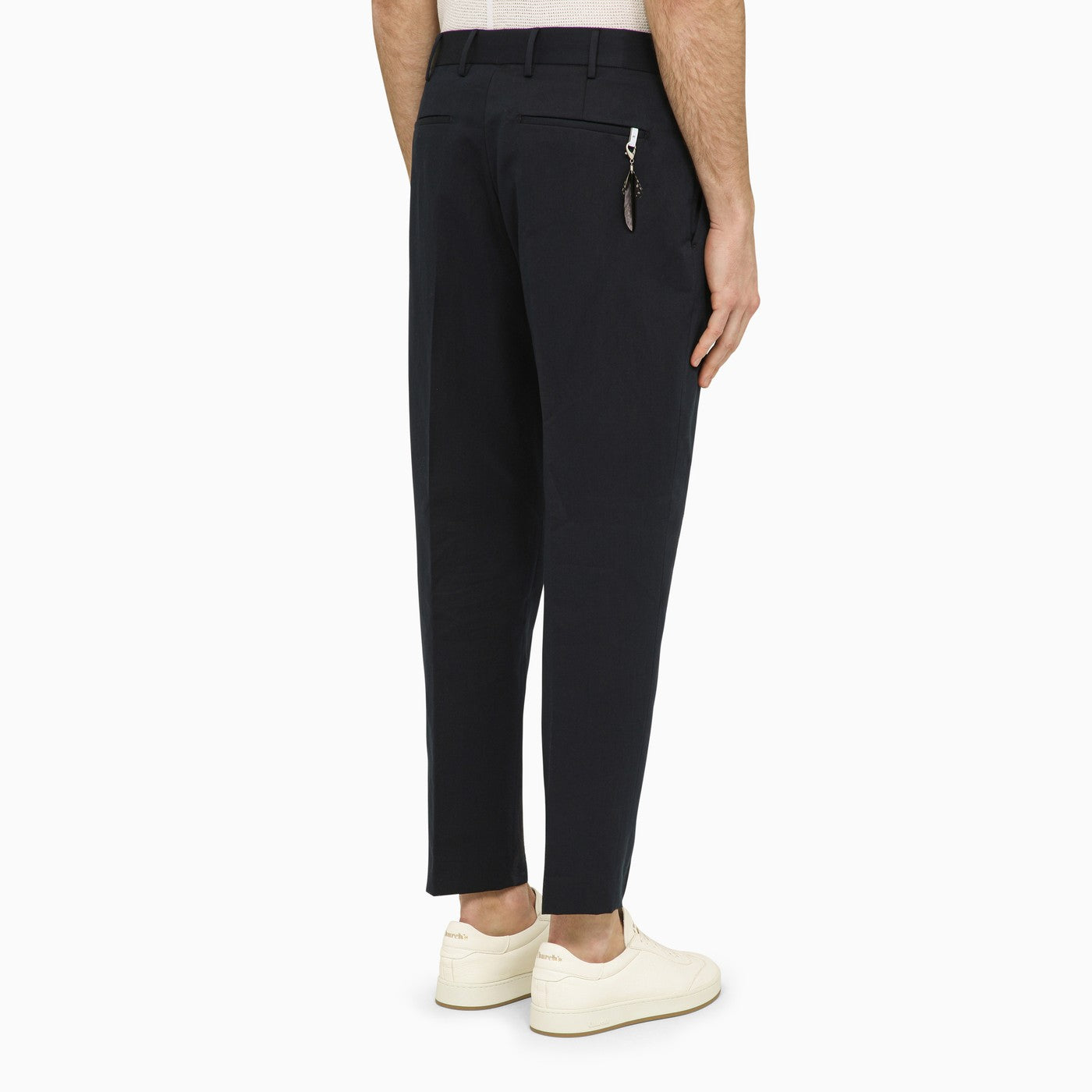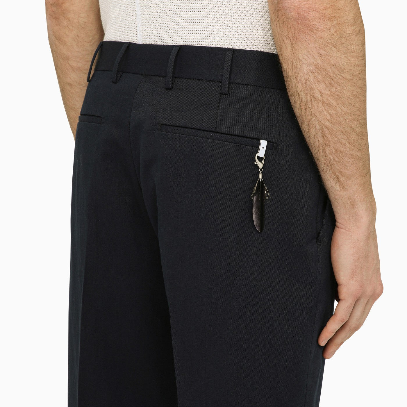 Navy blue cotton and linen slim trousers from PT Torino featuring a front zip and hook fastening, belt loops, two side welt pockets, two back welt pockets and a removable feather charm on the back.