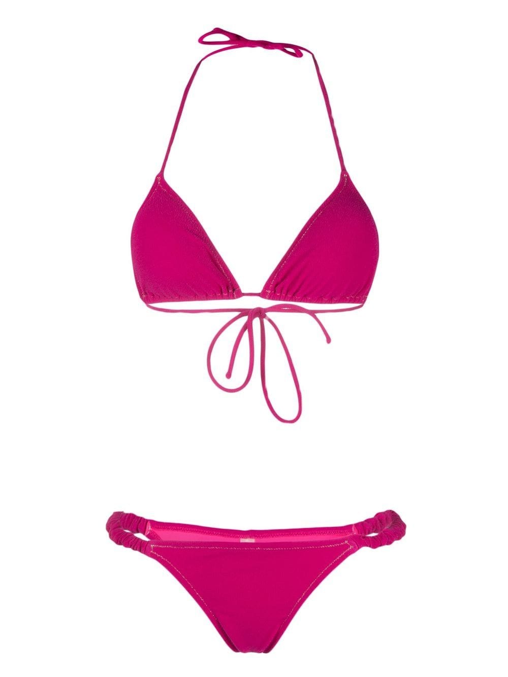Scrunchie triangle bikini from REINA OLGA featuring fuchsia pink, triangle cup, halterneck tie fastening, rear tie fastening and classic bottoms. Be mindful to try on swimwear over your own garments..