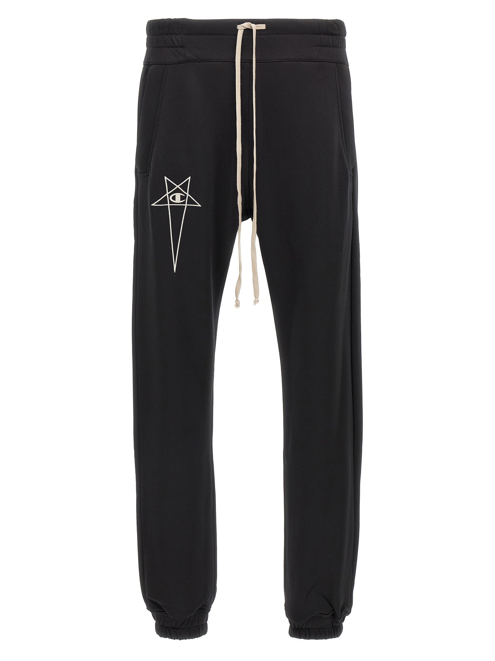 Champion x Rick Owens cotton blend joggers with contrast front logo embroidery, back logo patch, adjustable drawstring elastic at the waist, pockets, elastic ankle cuffs. SUSTAINABLE: product made from sustainable materials.