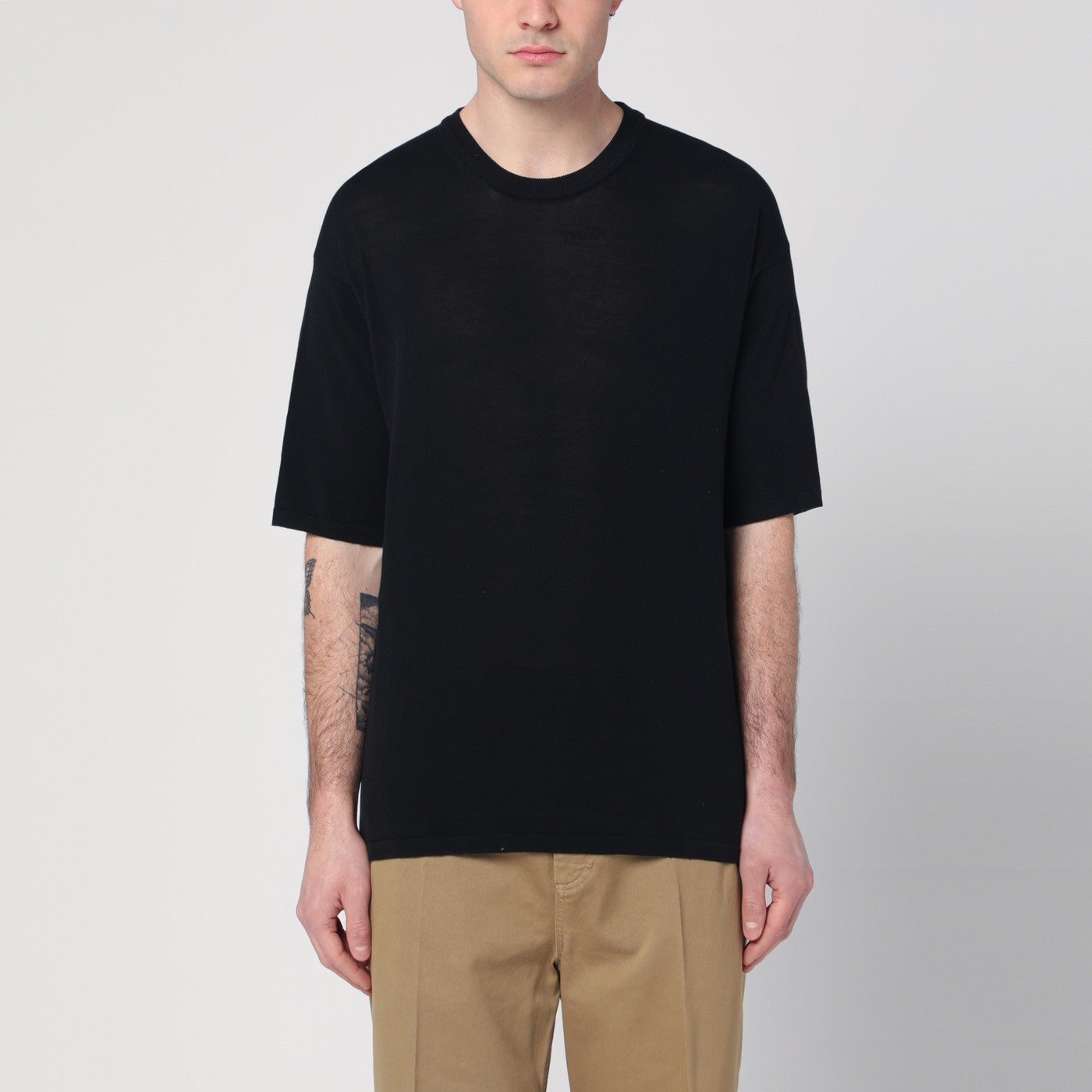 Roberto Collina's black cotton sweater, characterized by short sleeves and a ribbed crew neck.
