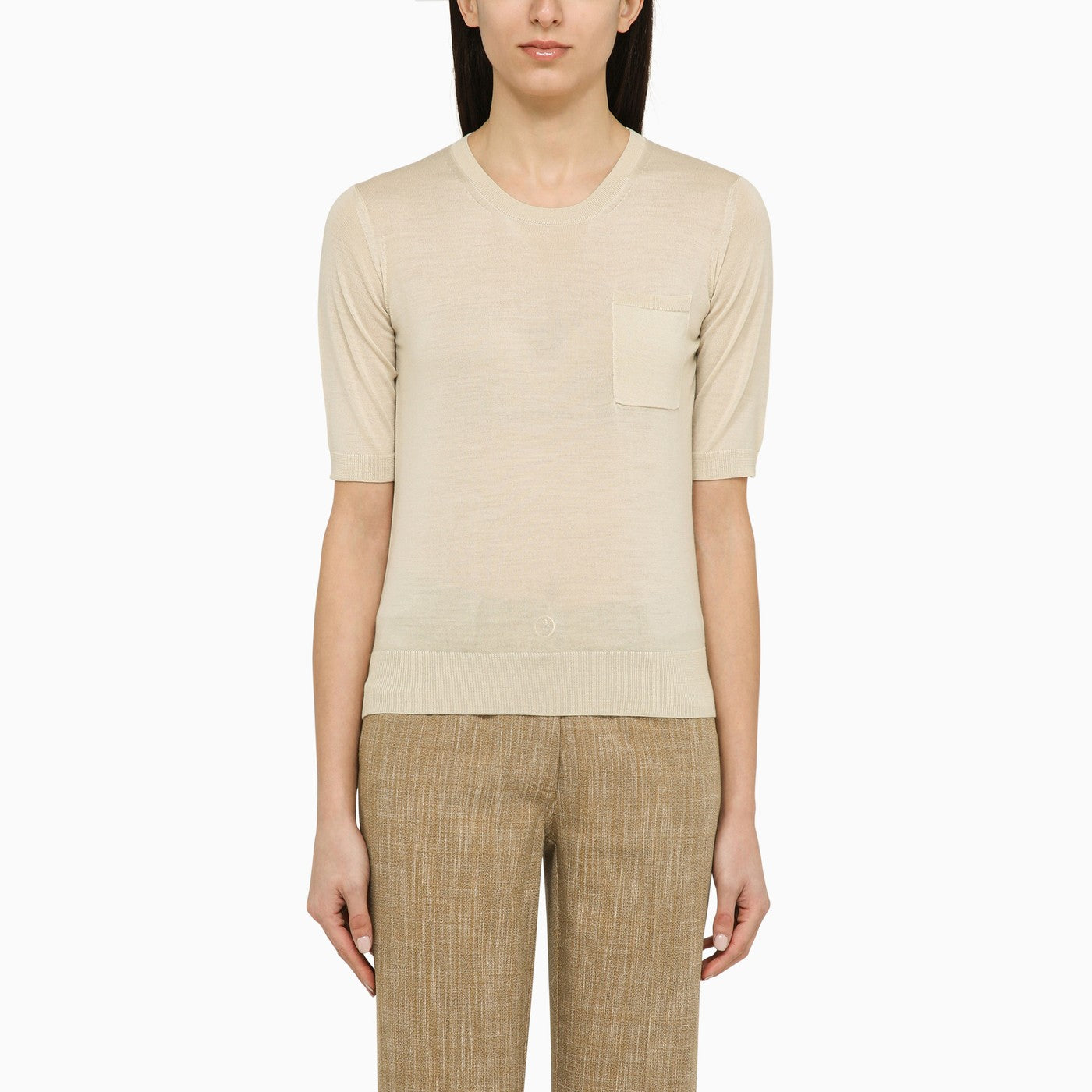 Cream-coloured wool crew-neck sweater from Roberto Collina featuring short sleeves, ribbed edges and front patch pocket.