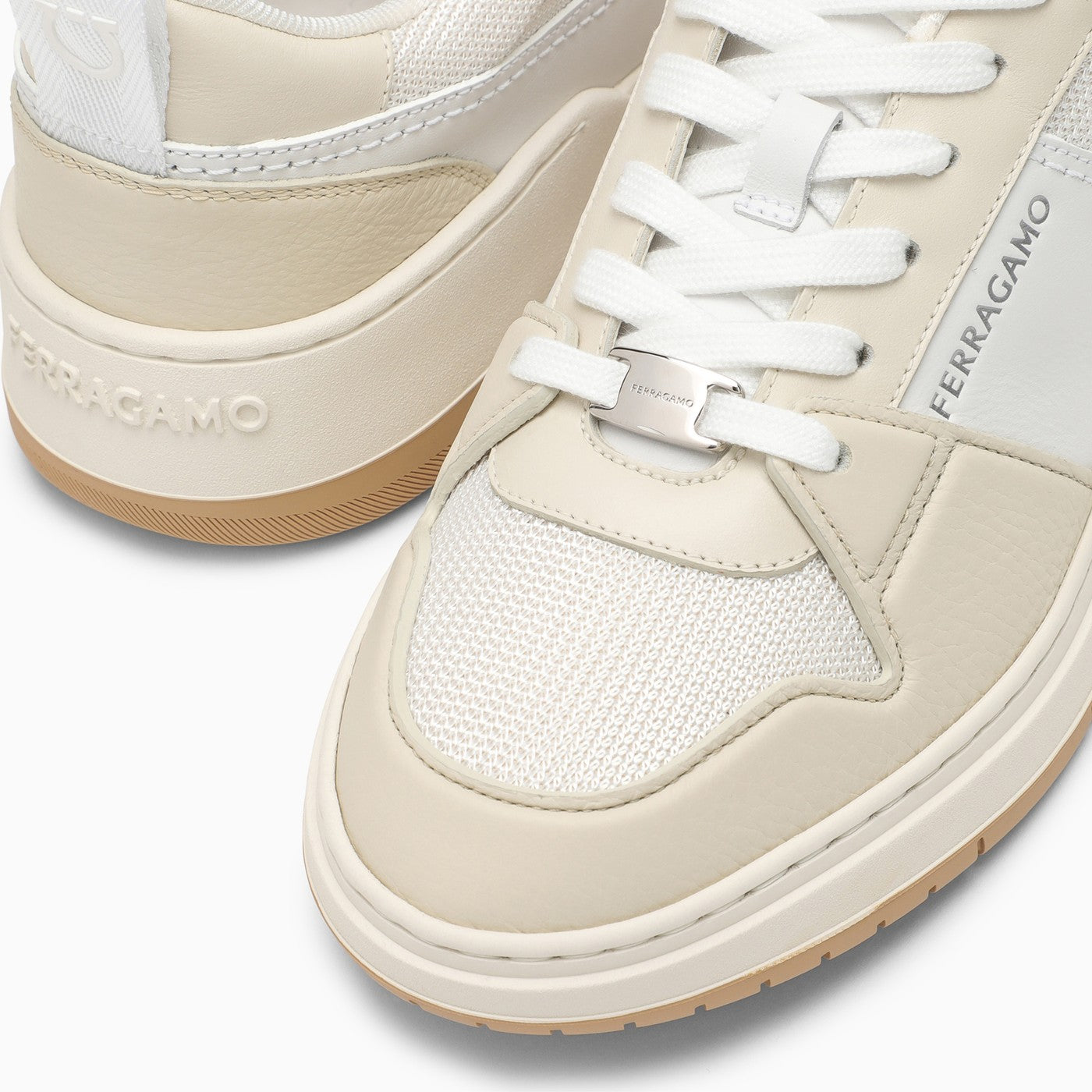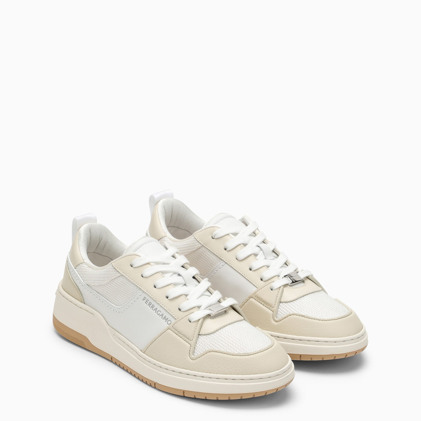 Low trainer with a smooth calfskin and breathable white technical fabric upper by Ferragamo, featuring a lace-up closure, round toe, side lettering logo and rubber sole with embossed lettering logo.