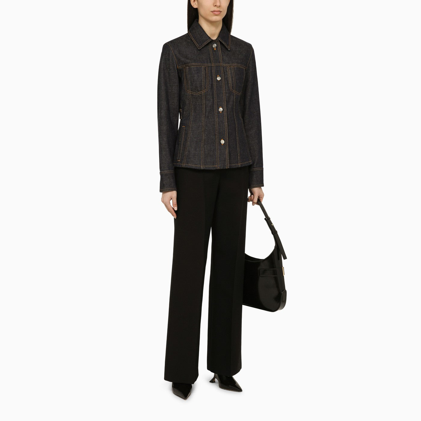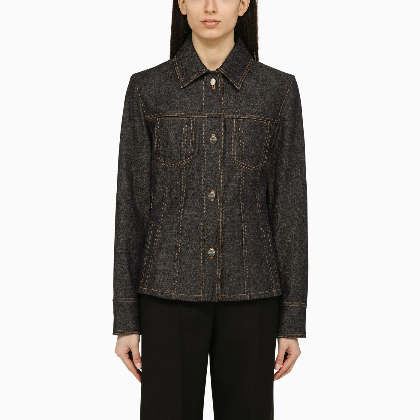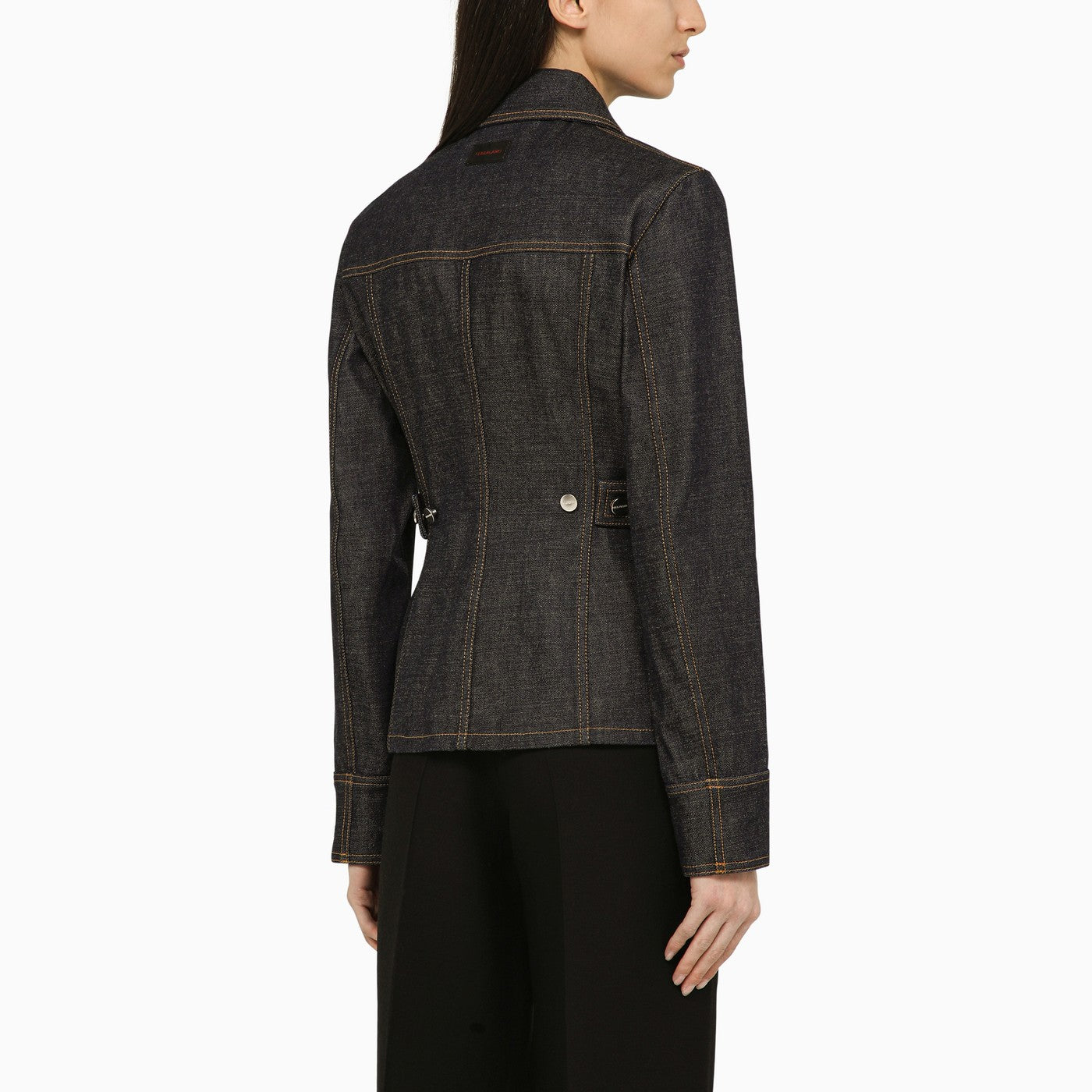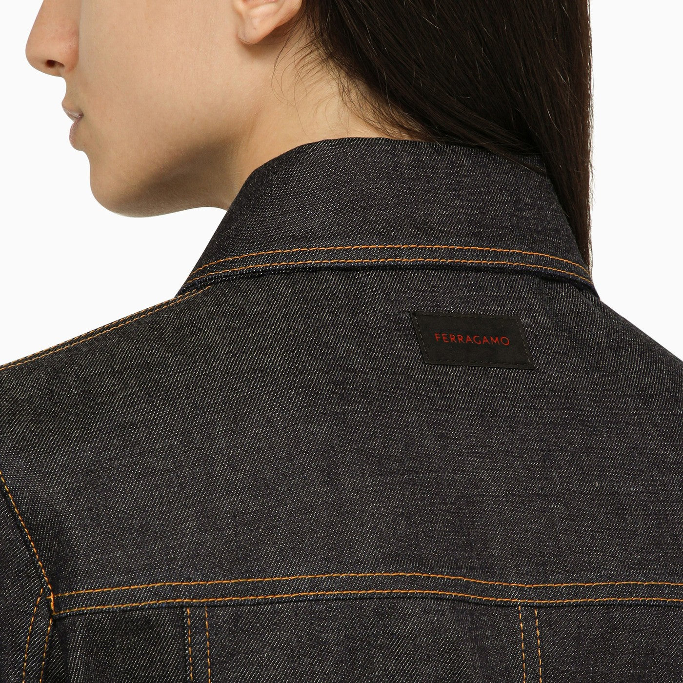 Dark cotton denim single-breasted jacket from Salvatore Ferragamo featuring a pointed collar, a front button fastening, two welt pockets, two patch pockets on the chest and a logo patch on the back.