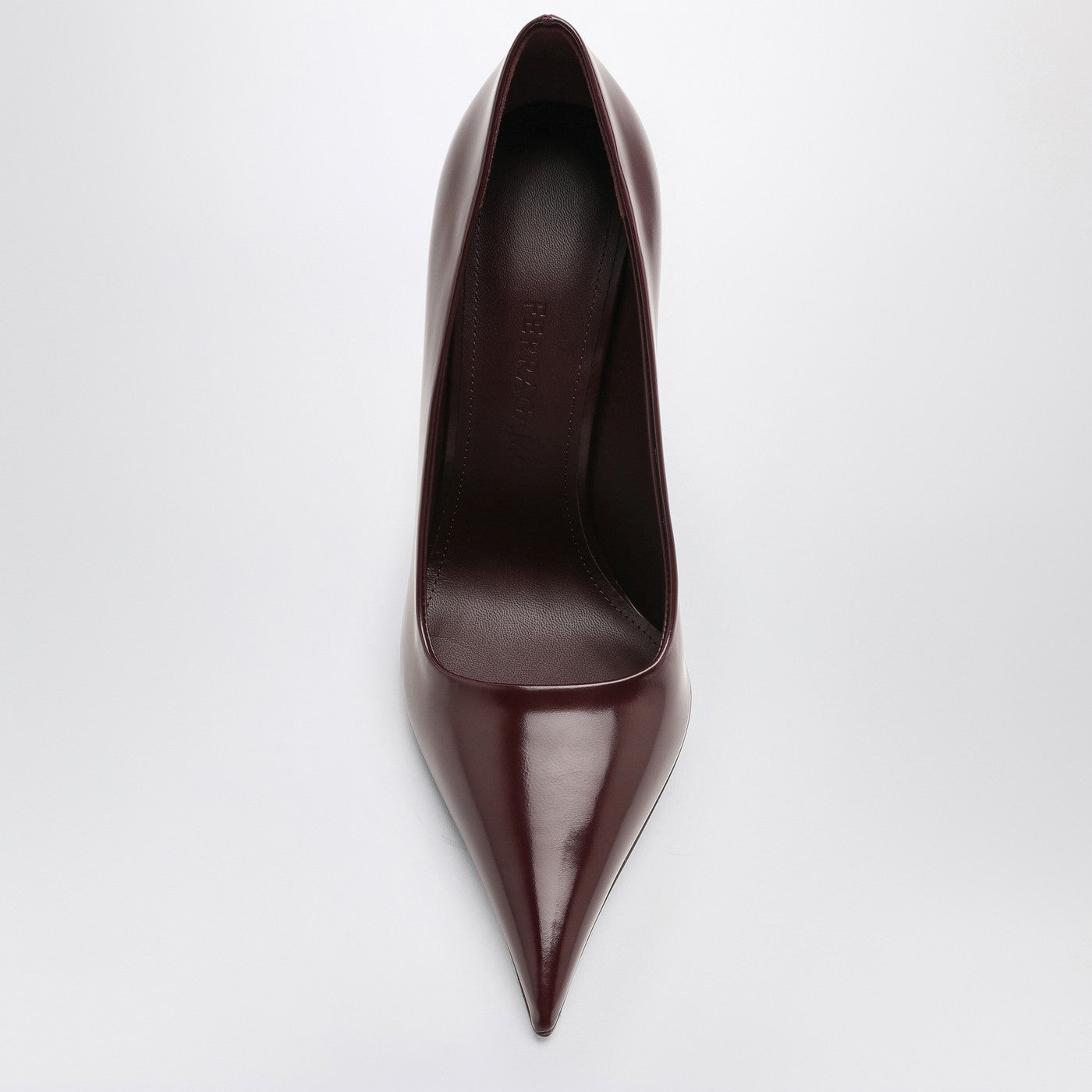 Burgundy patent leather pumps by Ferragamo featuring a pointed toe design, a contoured high heel and a leather sole.