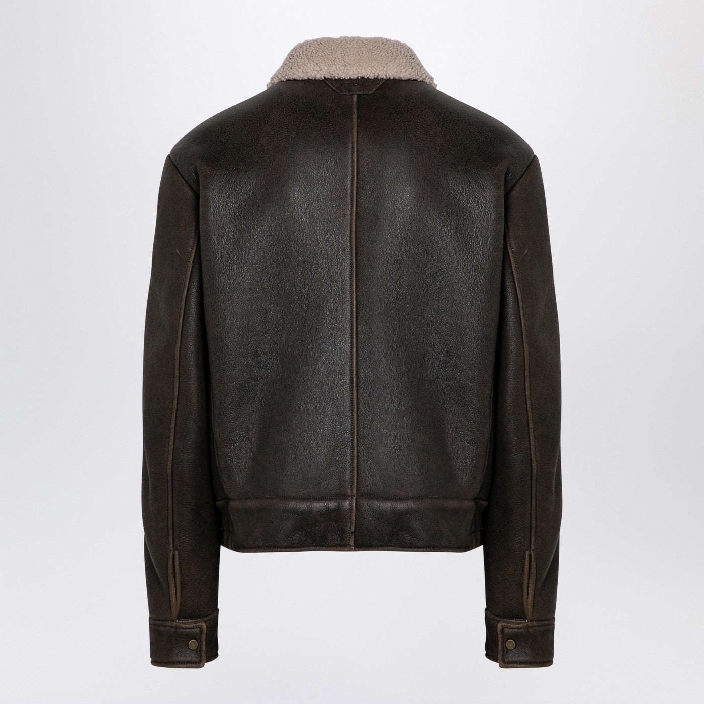 Asphalt-coloured leather short sheepskin coat by Salvatore Santoro, features a contrasting collar, long sleeves with buttoned cuffs, a front zip and snap fastening, two patch flap pockets on the front and an elasticated hem.
