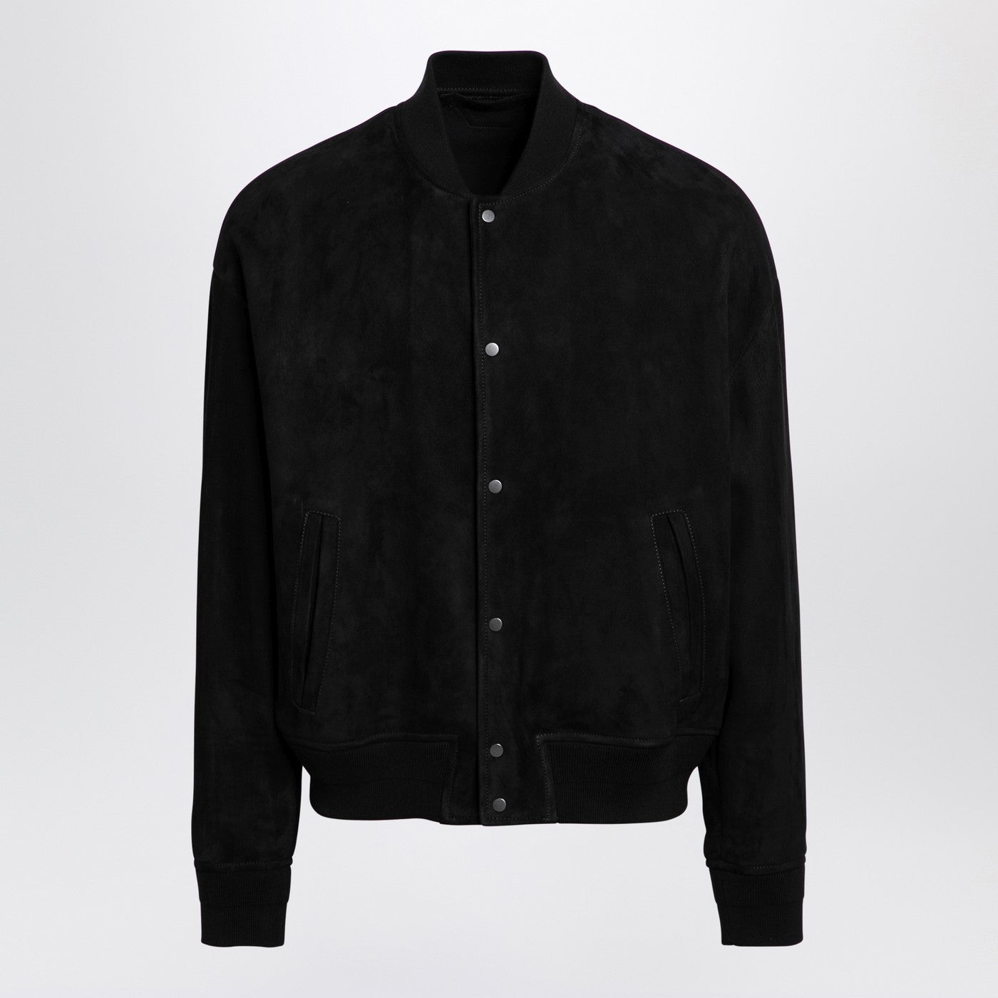 Black suede bomber jacket by Salvatore Santoro, features long sleeves, a front button fastening, two side welt pockets and ribbed knit edges.