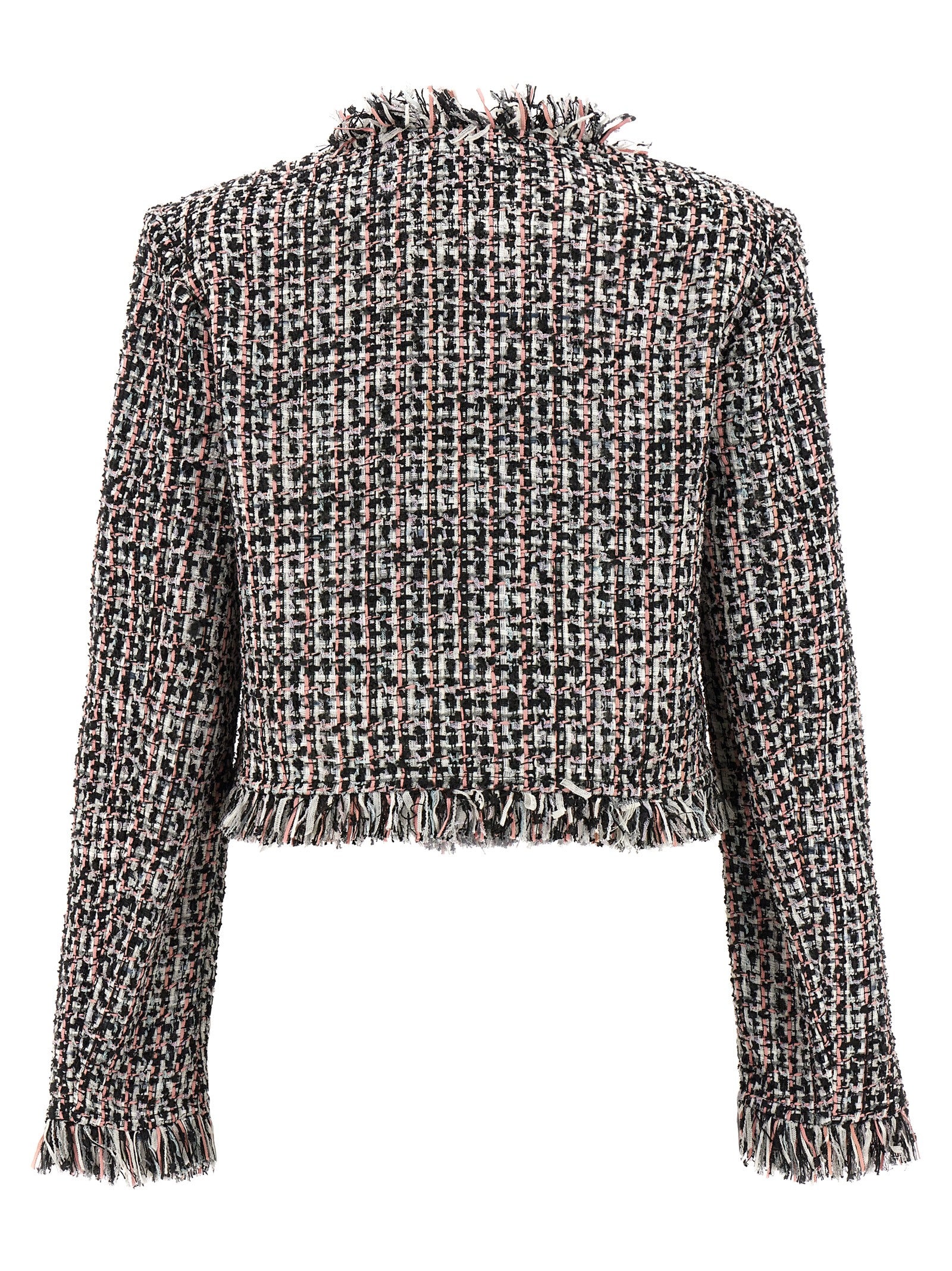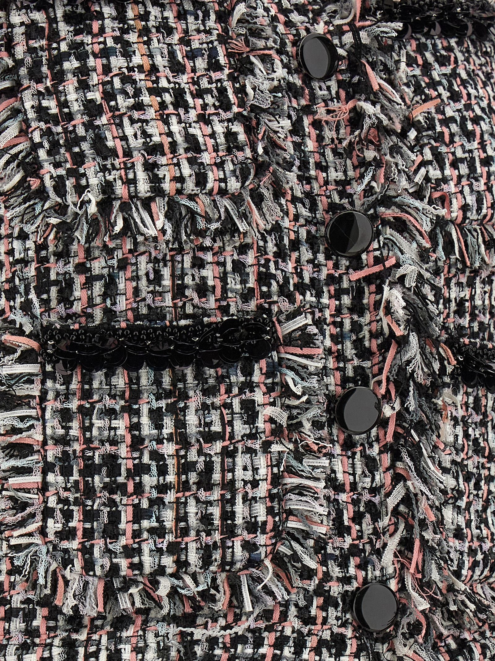 'Black Fringed Boucle' short jacket in frayed tweed, sequin patch pockets, button closure, long sleeves, padded shoulders.