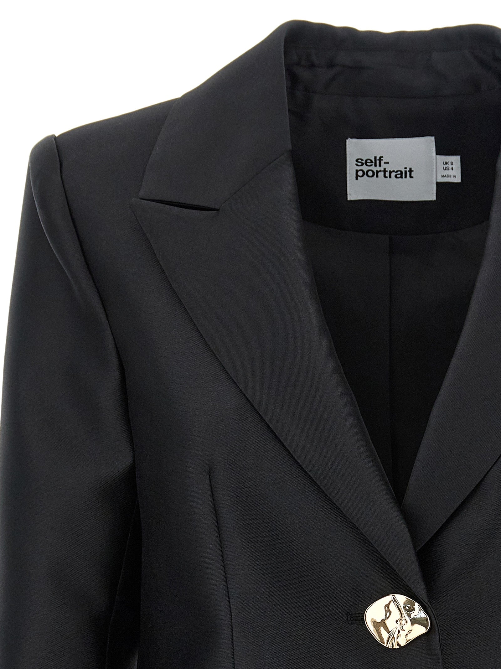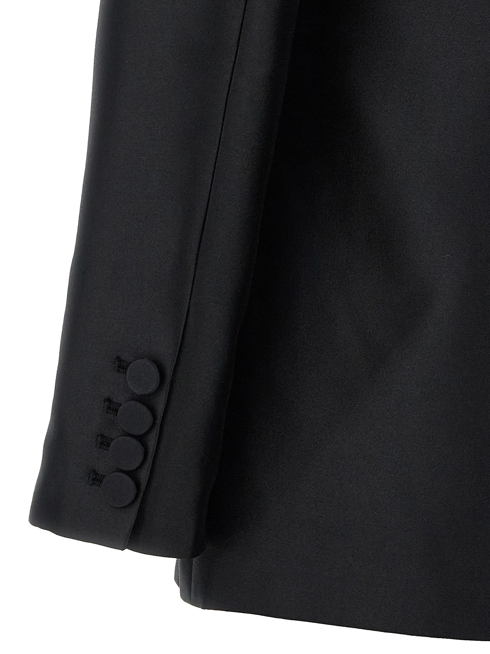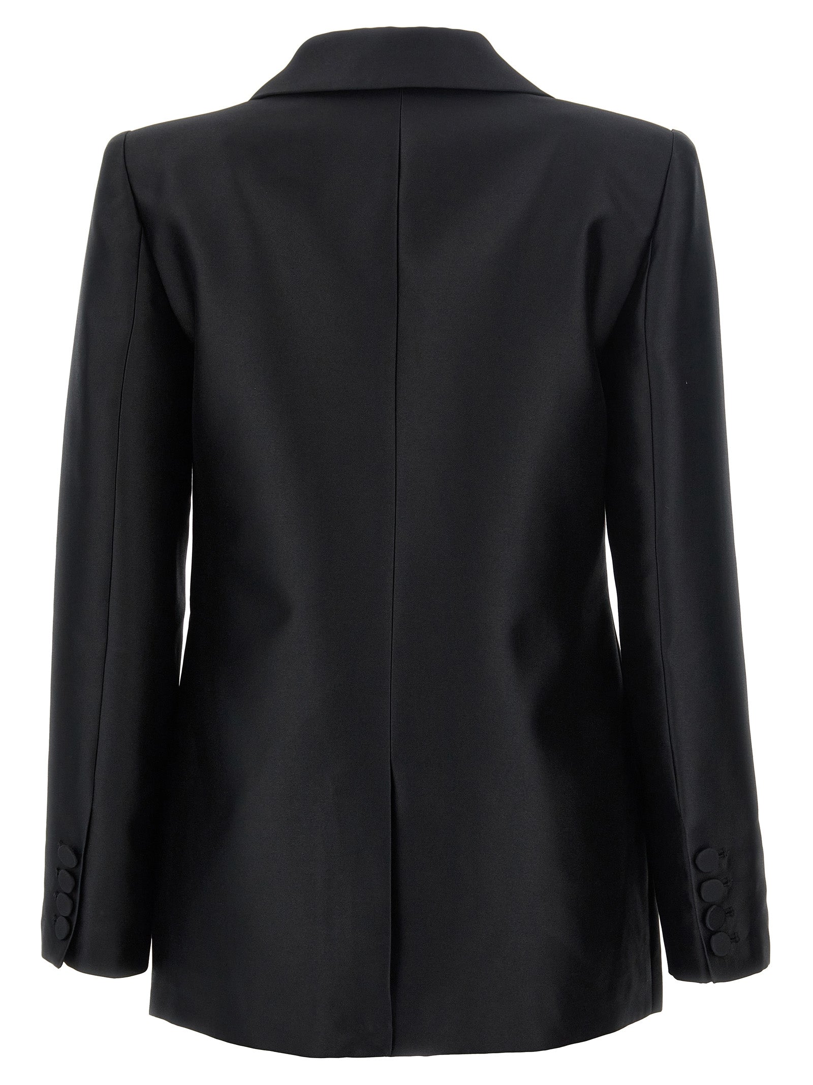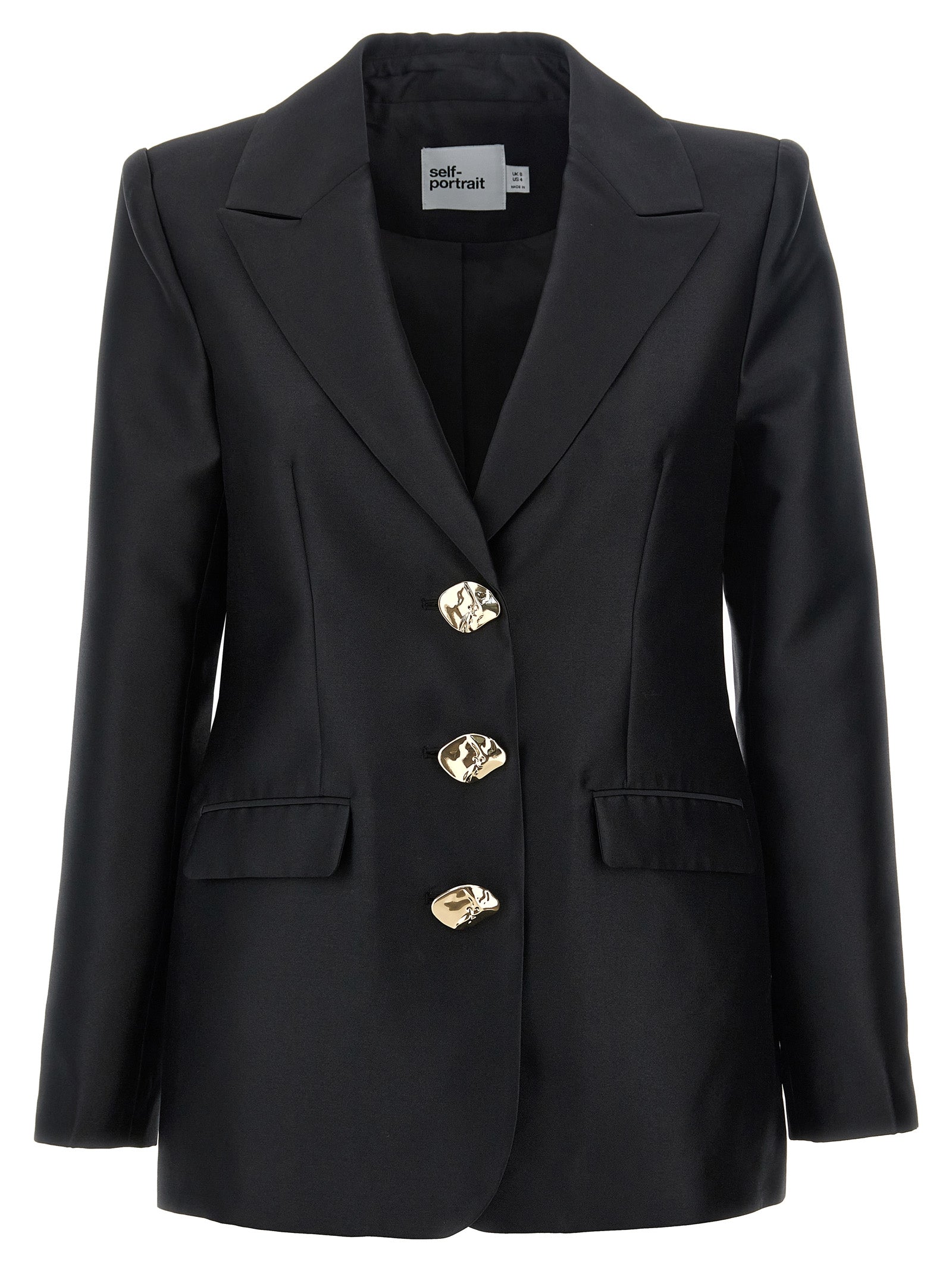 'Black Taffeta' single-breasted blazer with metal button closure, pockets, padded shoulders, long sleeves.