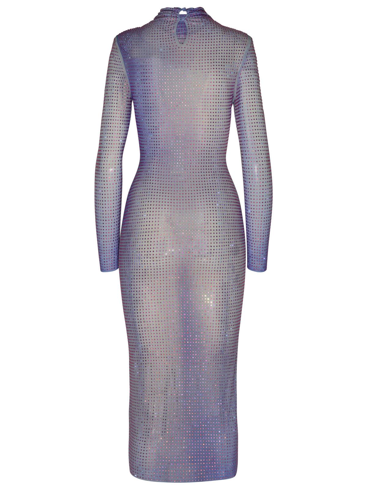 Tight long dress made of mesh knit with all-over rhinestones, soft turtleneck, padded shoulders, and double button closure at the back