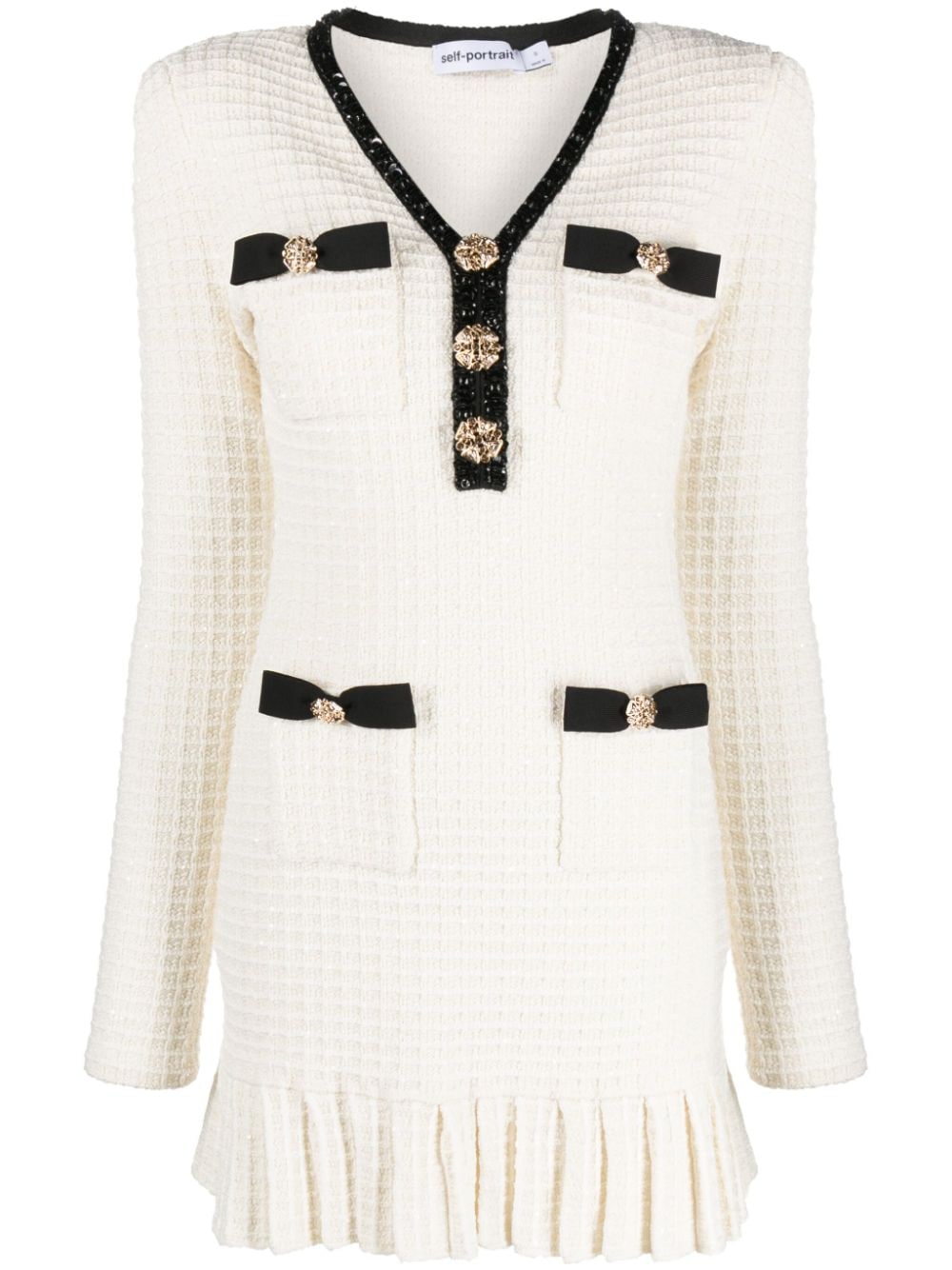 cream white/black waffle knit bow detailing crystal-embellished buttons bead embellishment crystal embellishment V-neck long sleeves four front patch pockets pleated edge thigh-length
