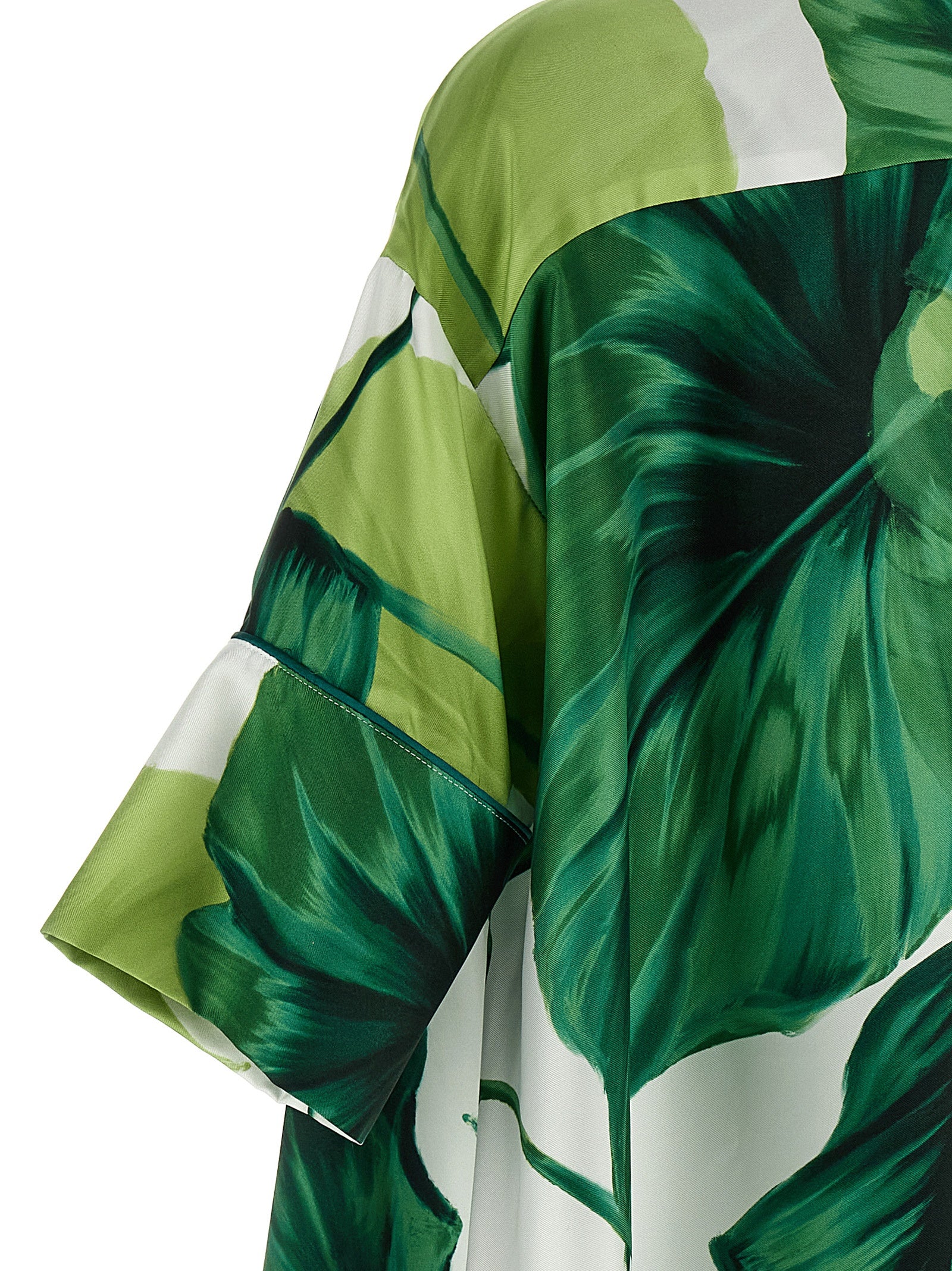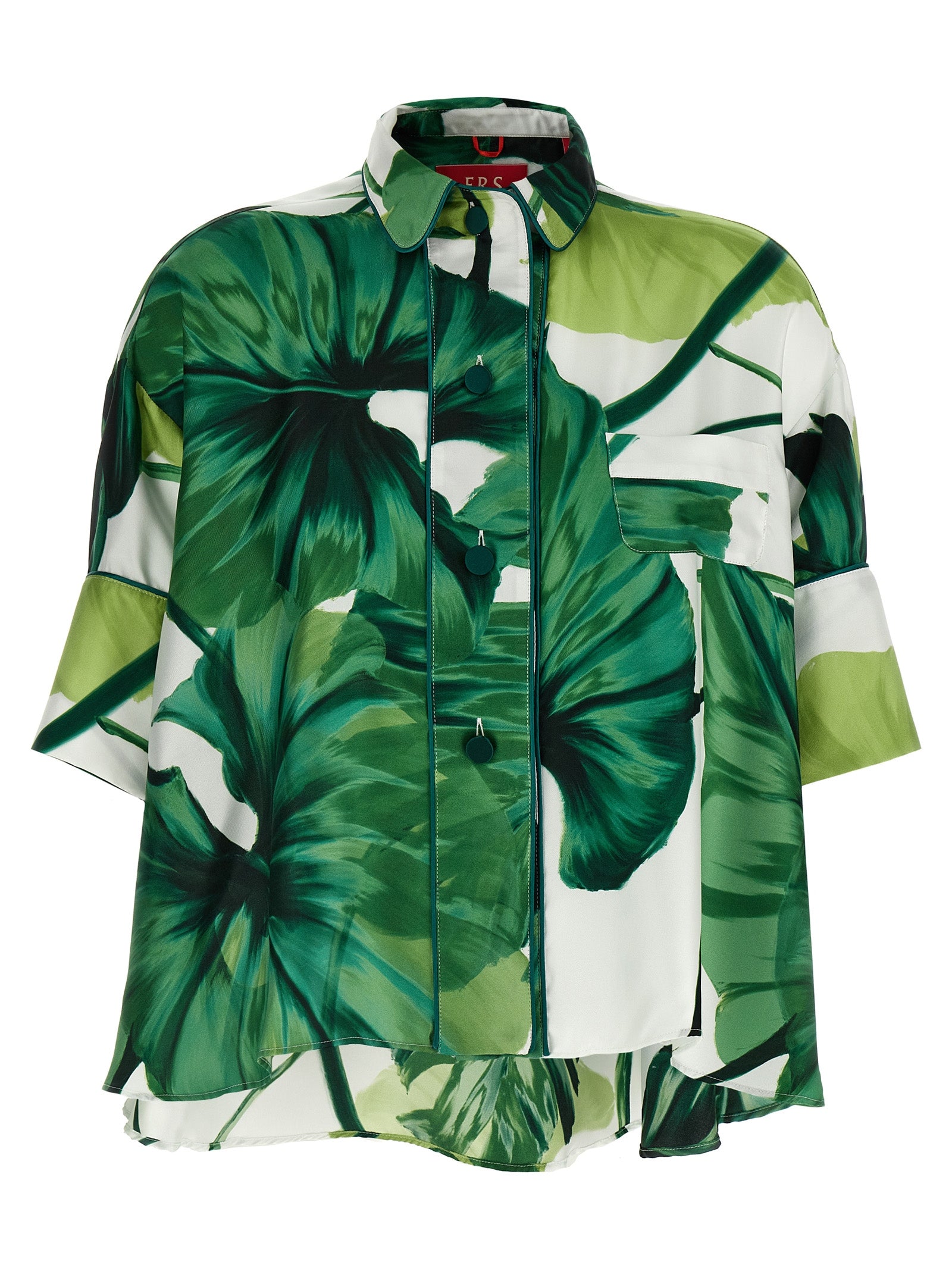 'Pistis' floral print silk twill shirt with solid satin details, male collar, button closure, 3/4 sleeves with dropped shoulders, asymmetric hem.