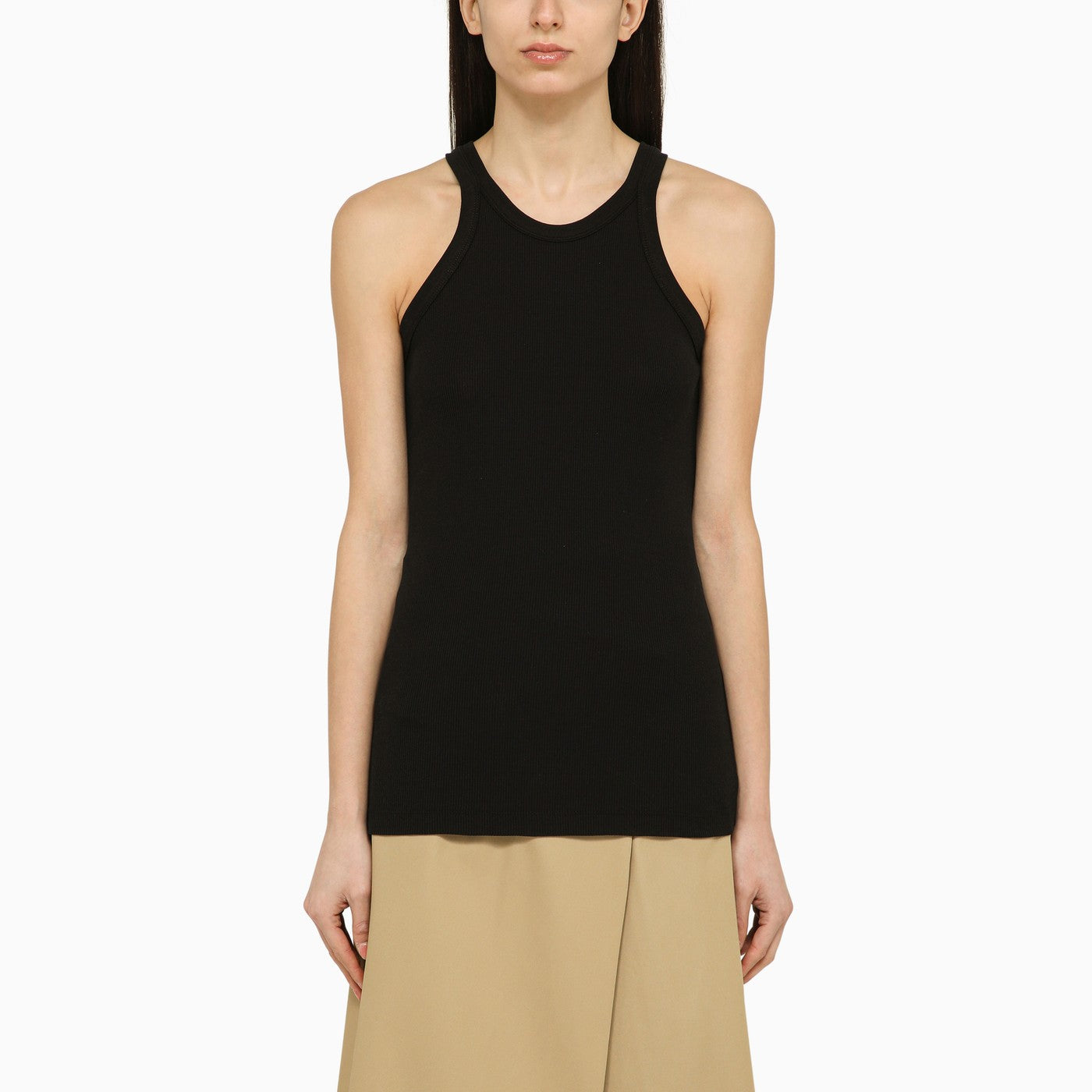Black cotton sleeveless crew-neck tank top by Sportmax features a ribbed design, a straight hem and a small bead detail sewn onto the back.