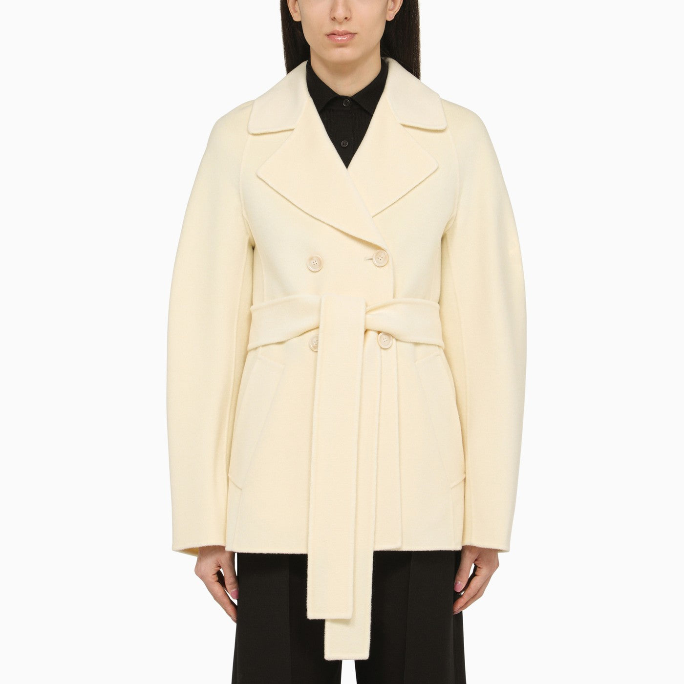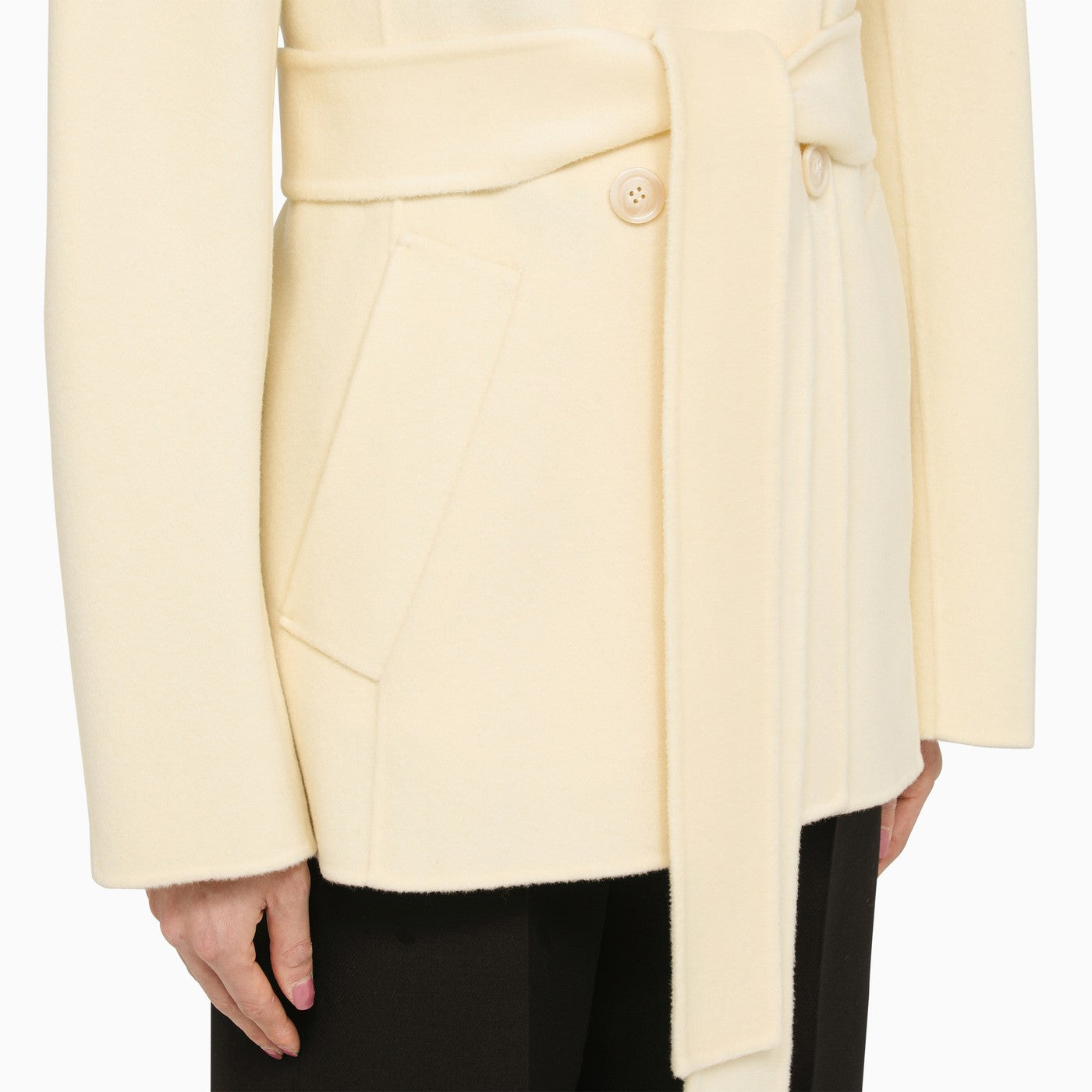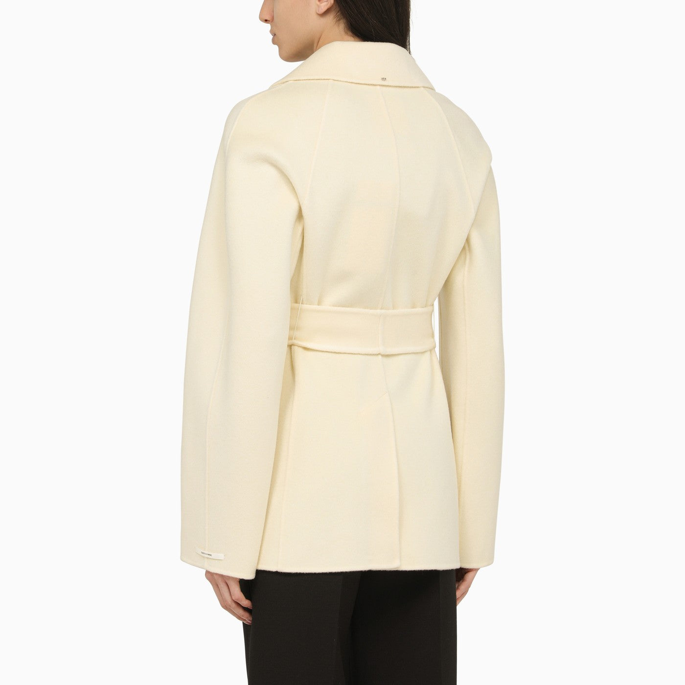 Short double-breasted coat made of vanilla-coloured wool and cashmere by Sportmax, featuring classic lapels, a front button fastening, a belted waist, two welt pockets on the front, a front slit and a small bead detail sewn on the back.
