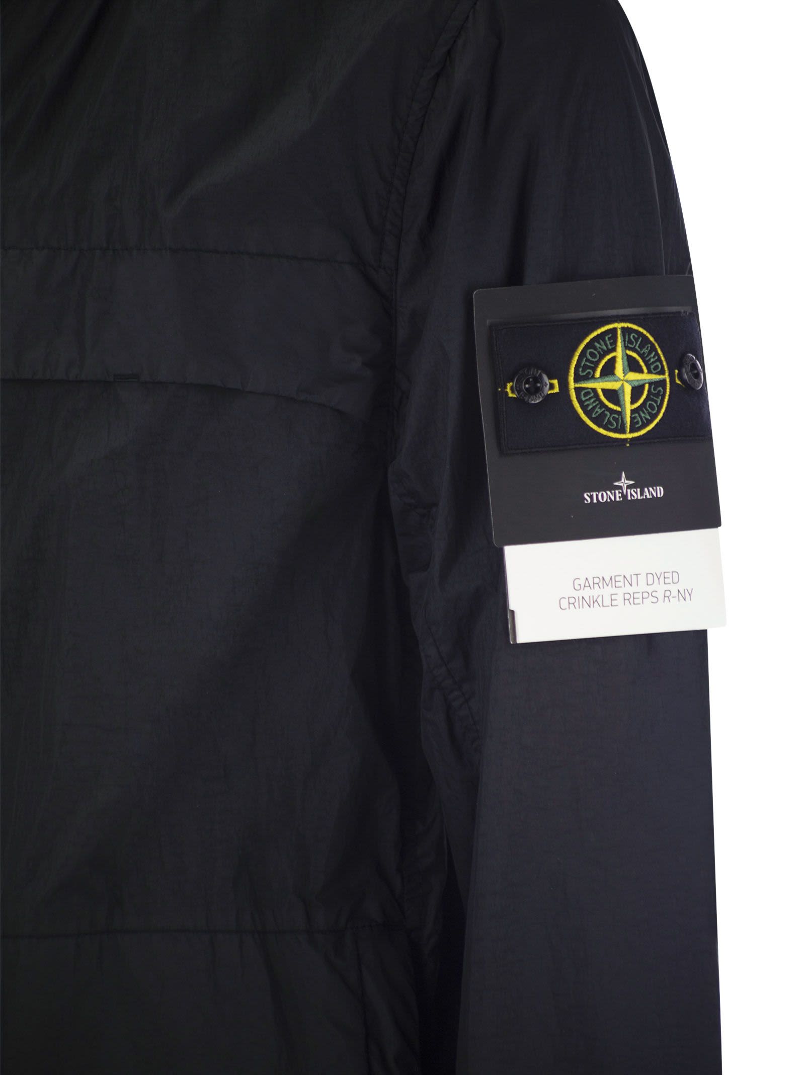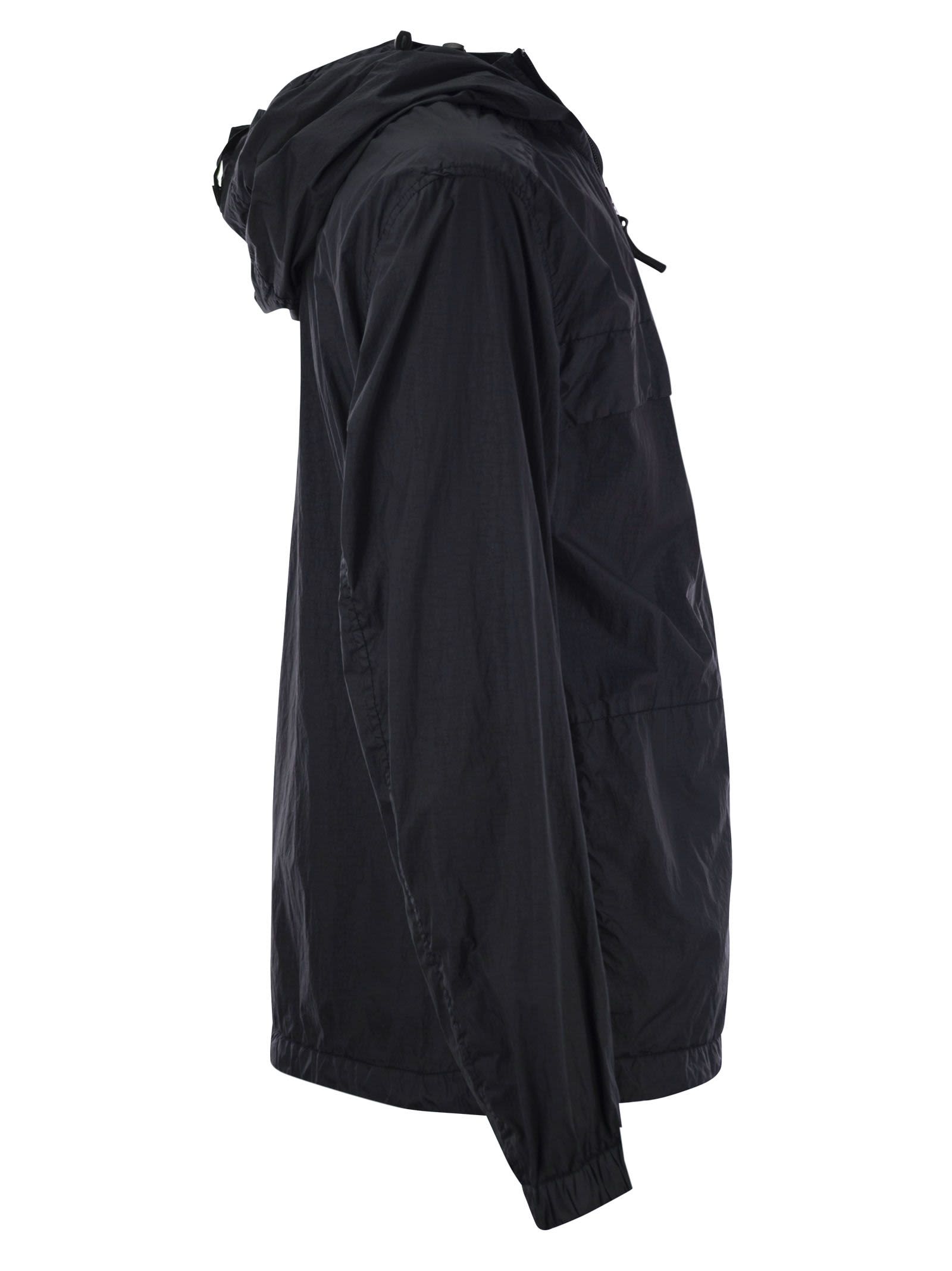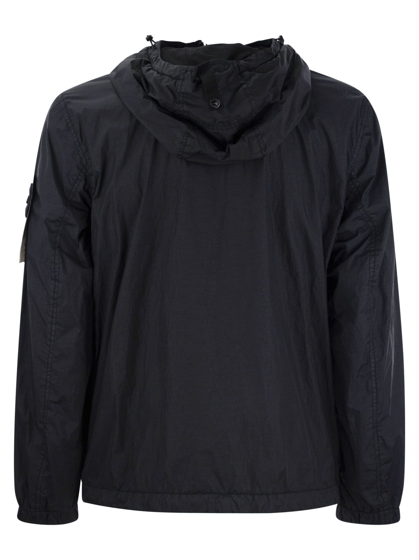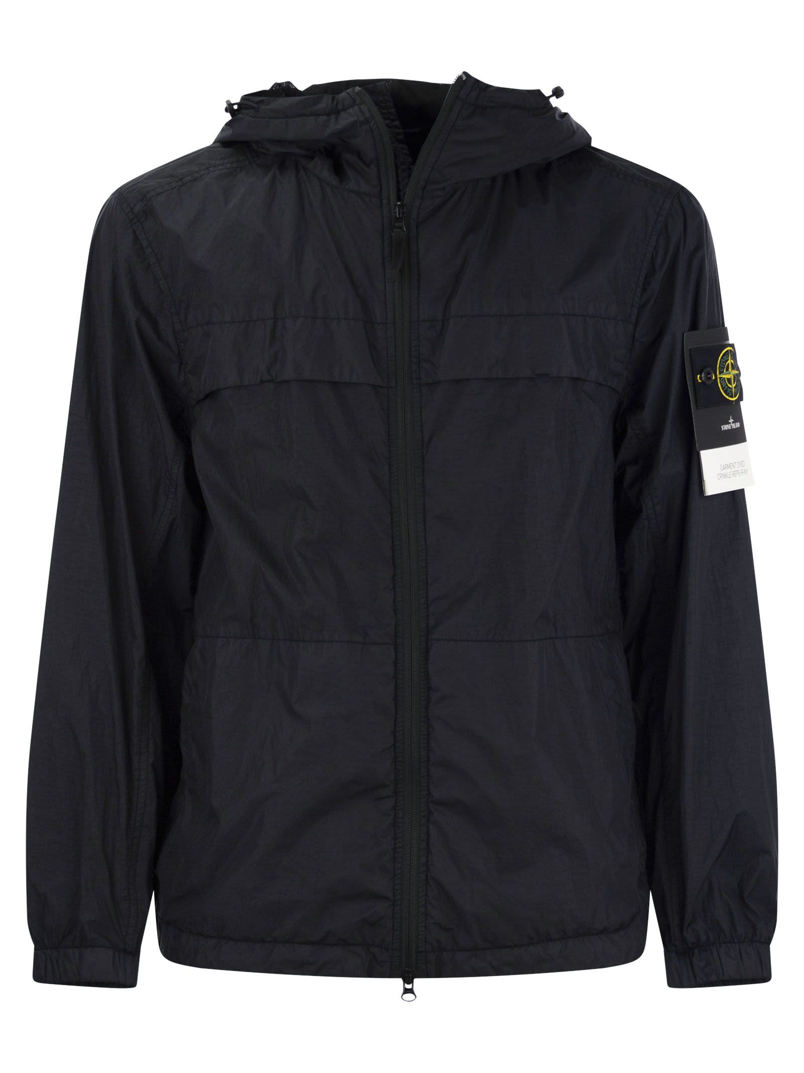 Lightweight hooded jacket in nylon with ripstop construction that undergoes an invisible soft touch reinforcing finish. The addition of a special resin gives the garment anti-drop characteristics. Hood with elasticated webbing on contour - Elastic drawstring at bottom hem - Two-way zip fastening - Stone Island badge on left sleeve DESIGNER ID: 801540922 V0020