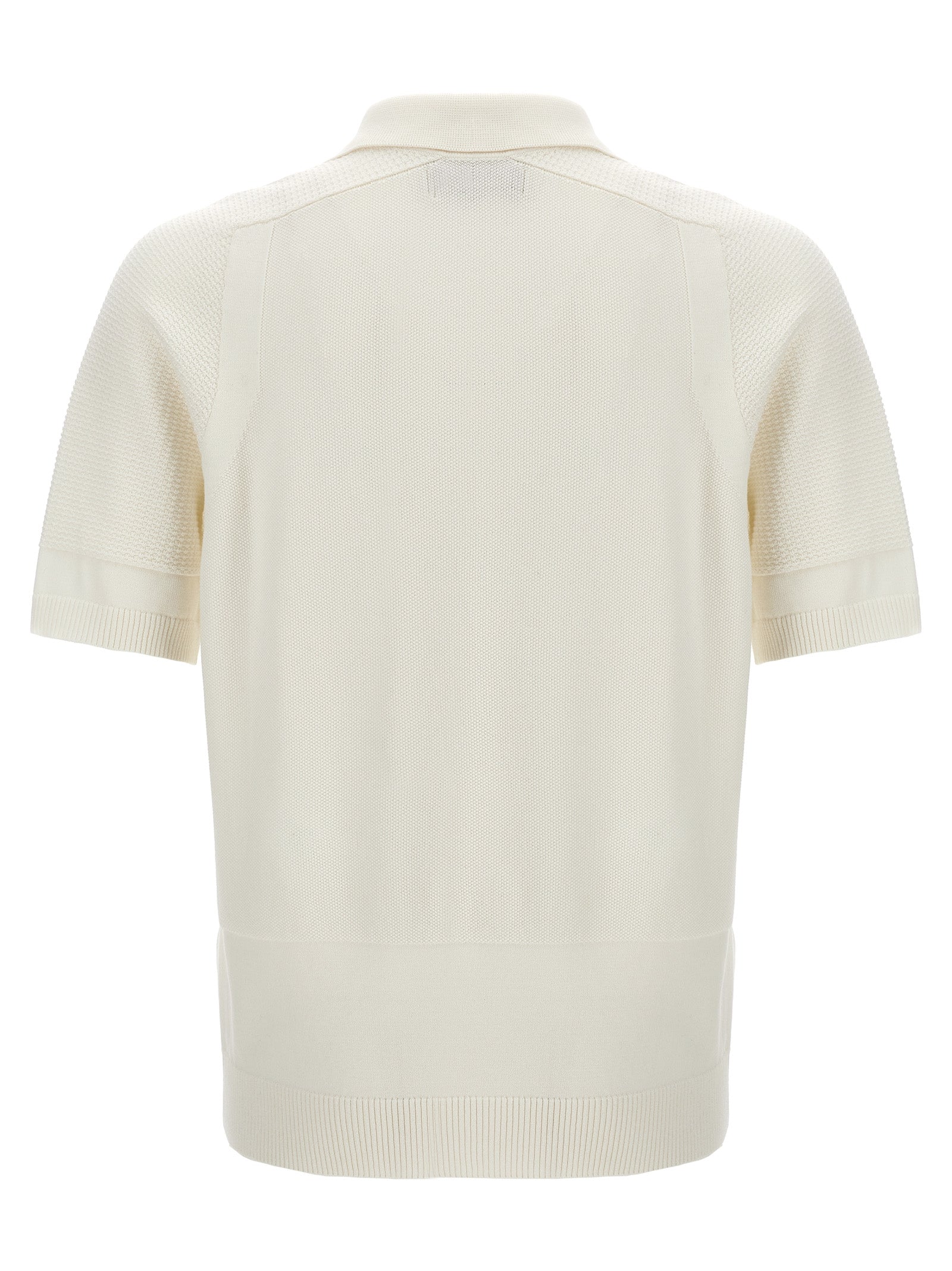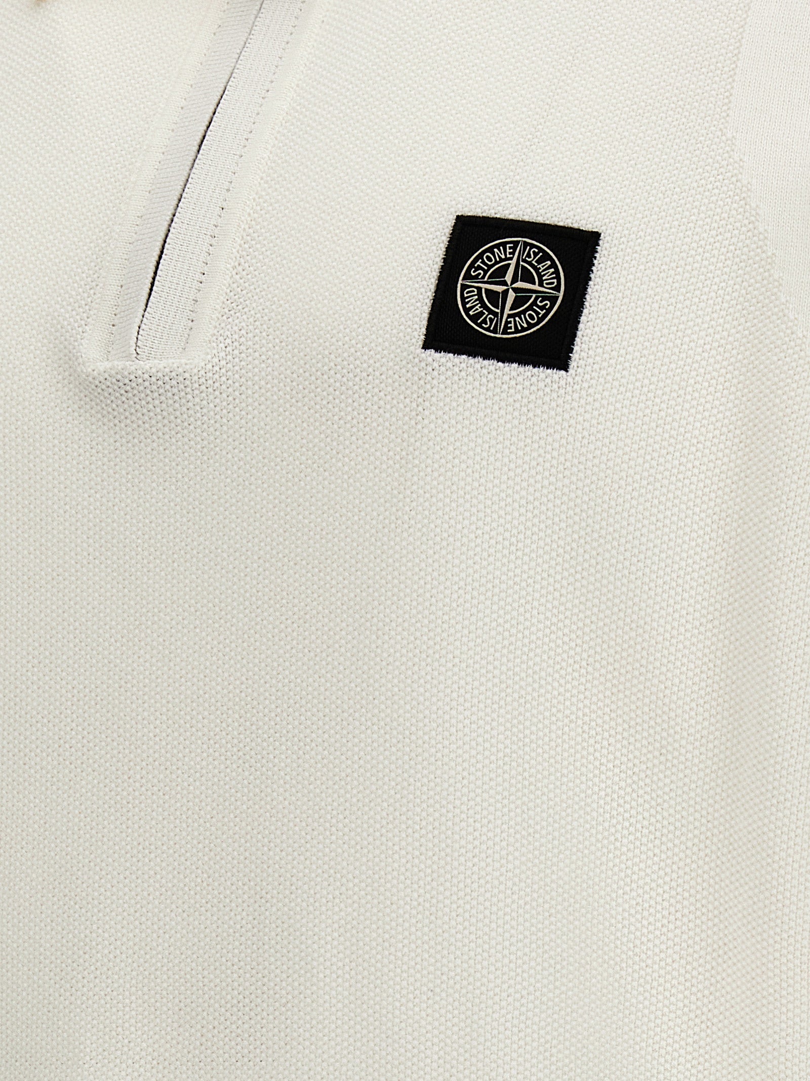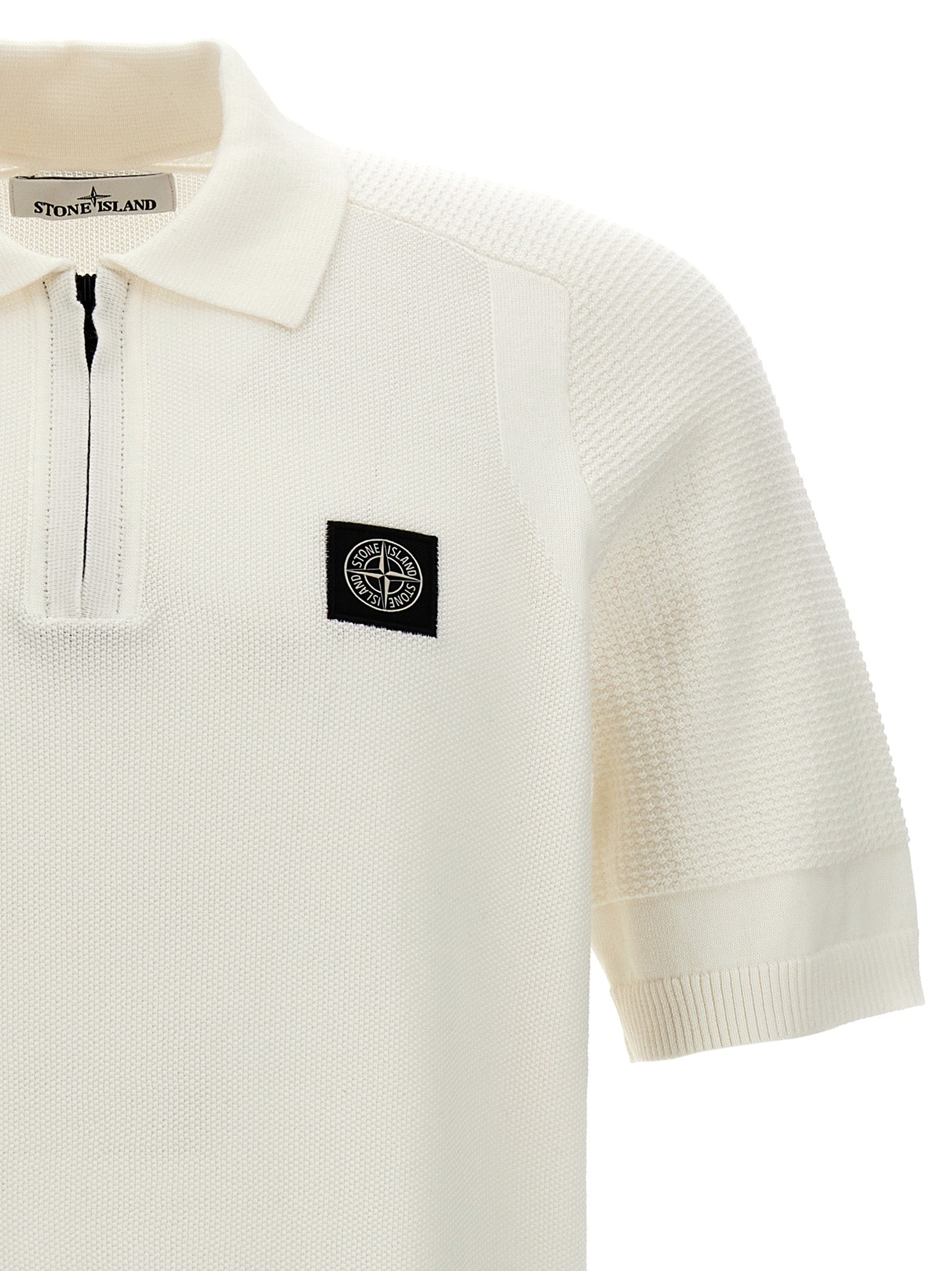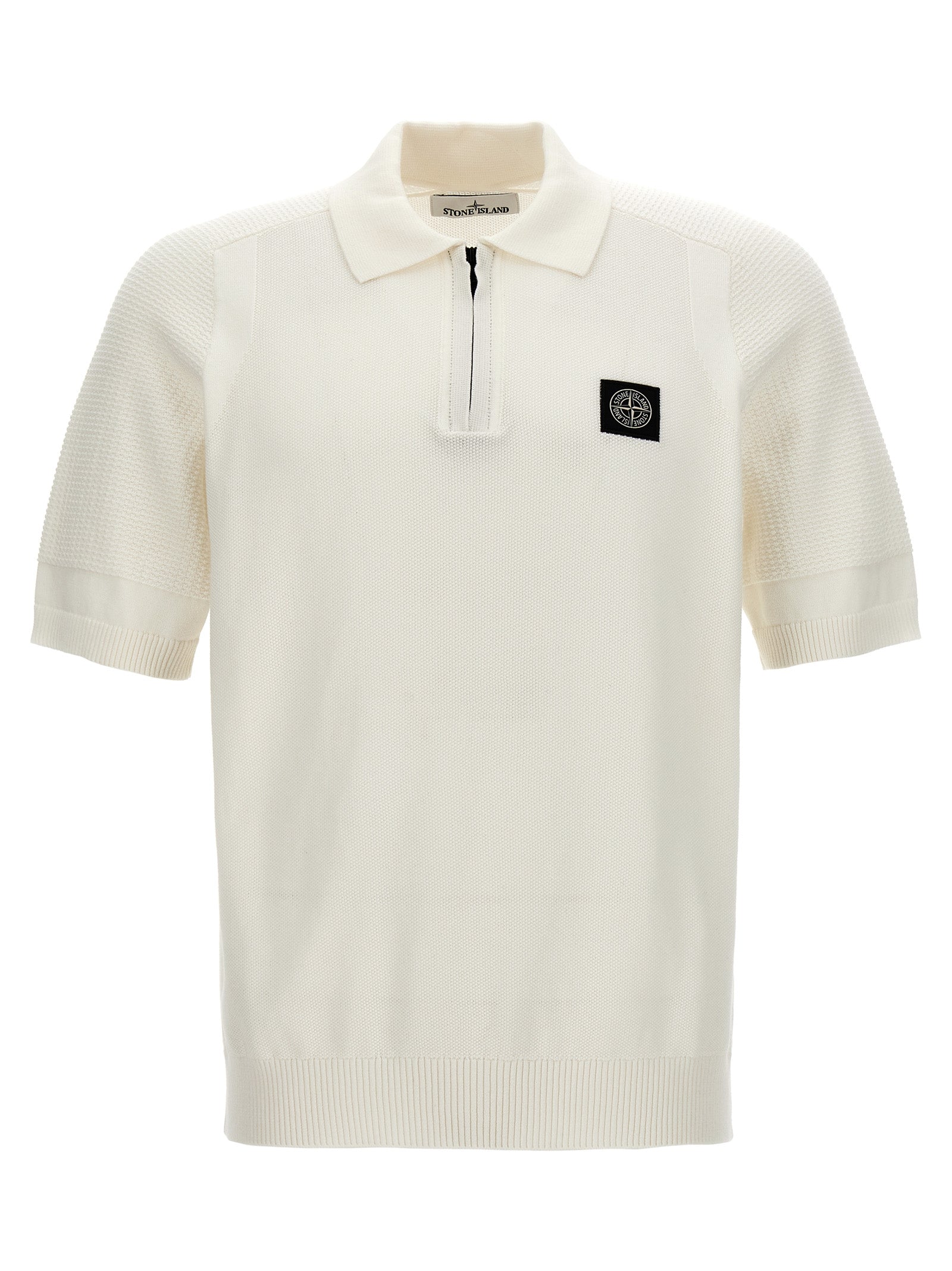 Cotton knit polo shirt with front logo patch, half zip style, short sleeves.