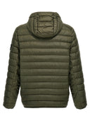 'Loom Woven Chambers R-Nylon Down-TC' quilted nylon down jacket 100 gr. Duck feather padding, hood, zip closure, pockets, logo patch, long sleeves.