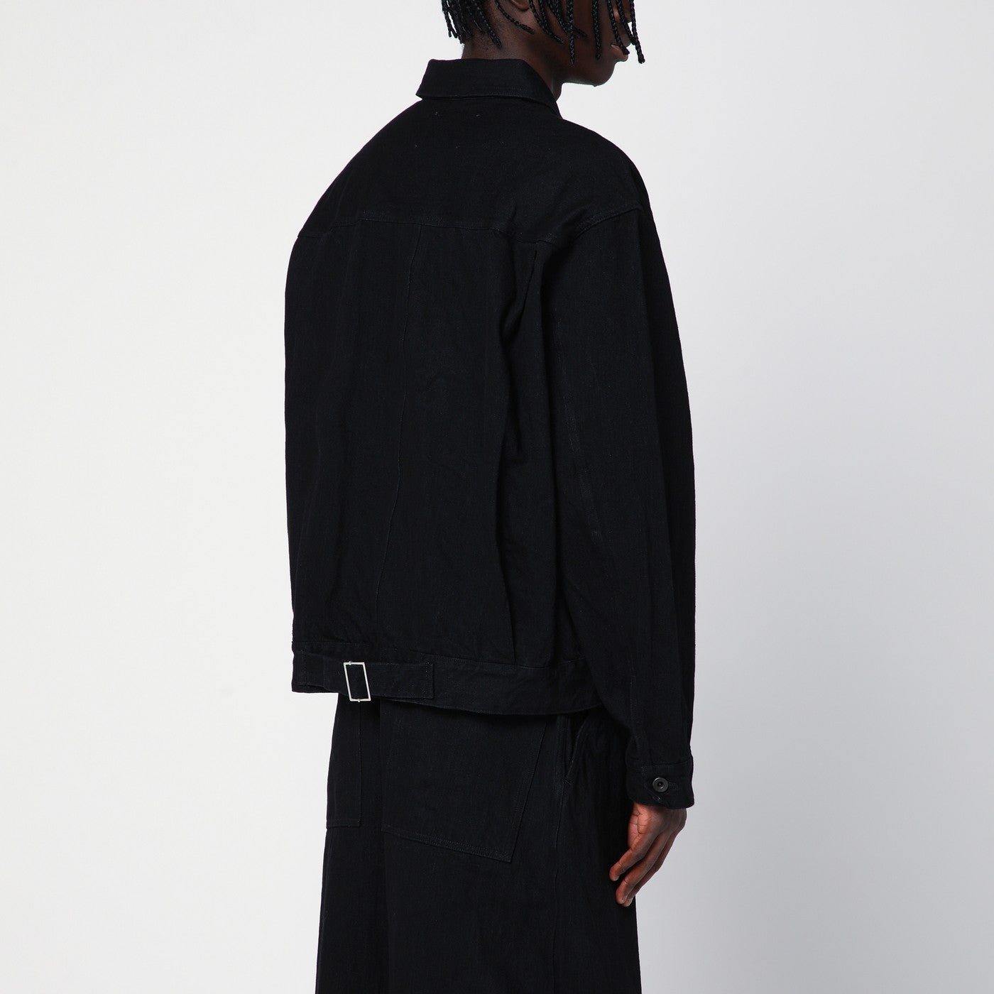 Black cotton denim jacket by Studio Nicholson, features a front button fastening, a classic collar, long sleeves with buttoned cuffs, two patch pockets on the front and adjustable tape on the back.
