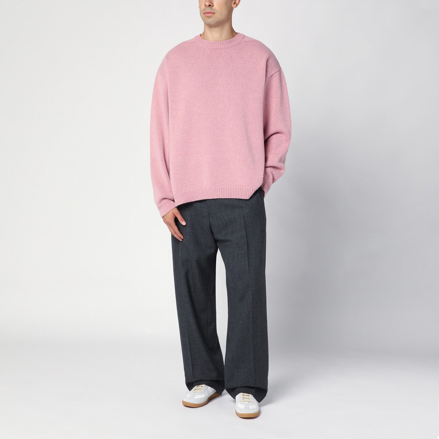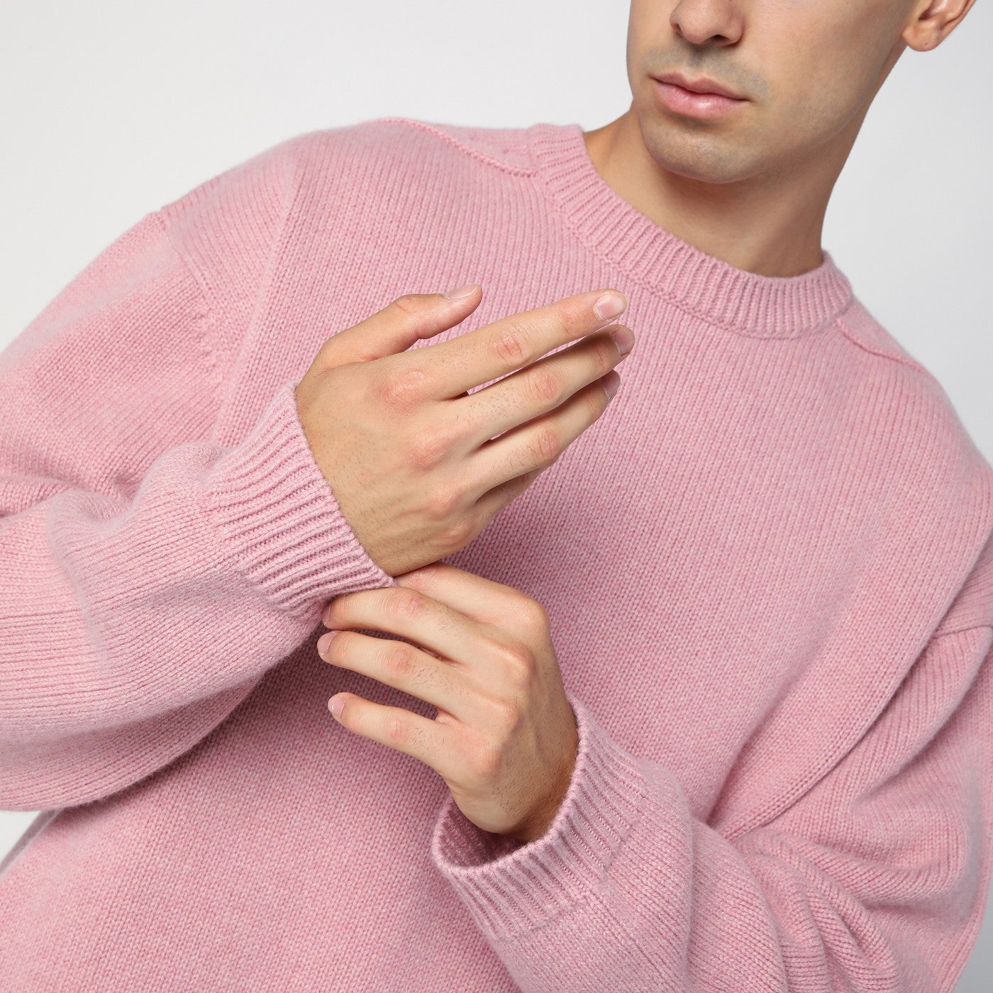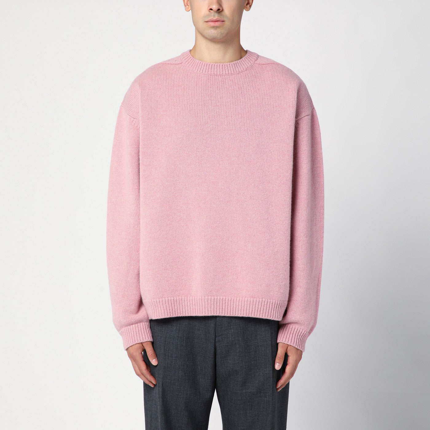 Studio Nicholson crew neck sweater in pink wool with a ribbed collar, cuffs and hem and a boxy fit.