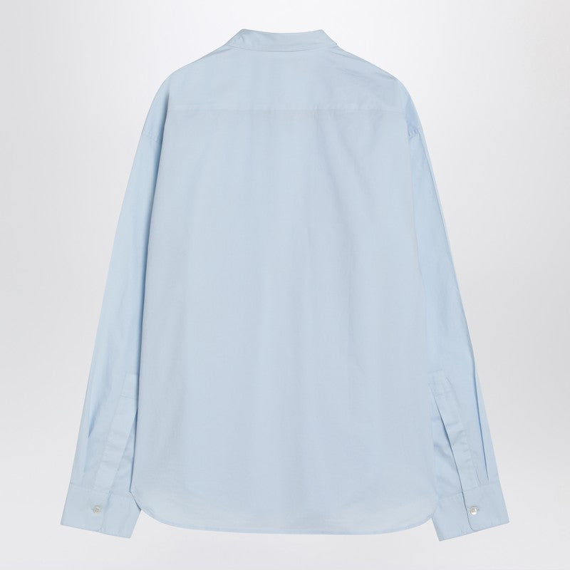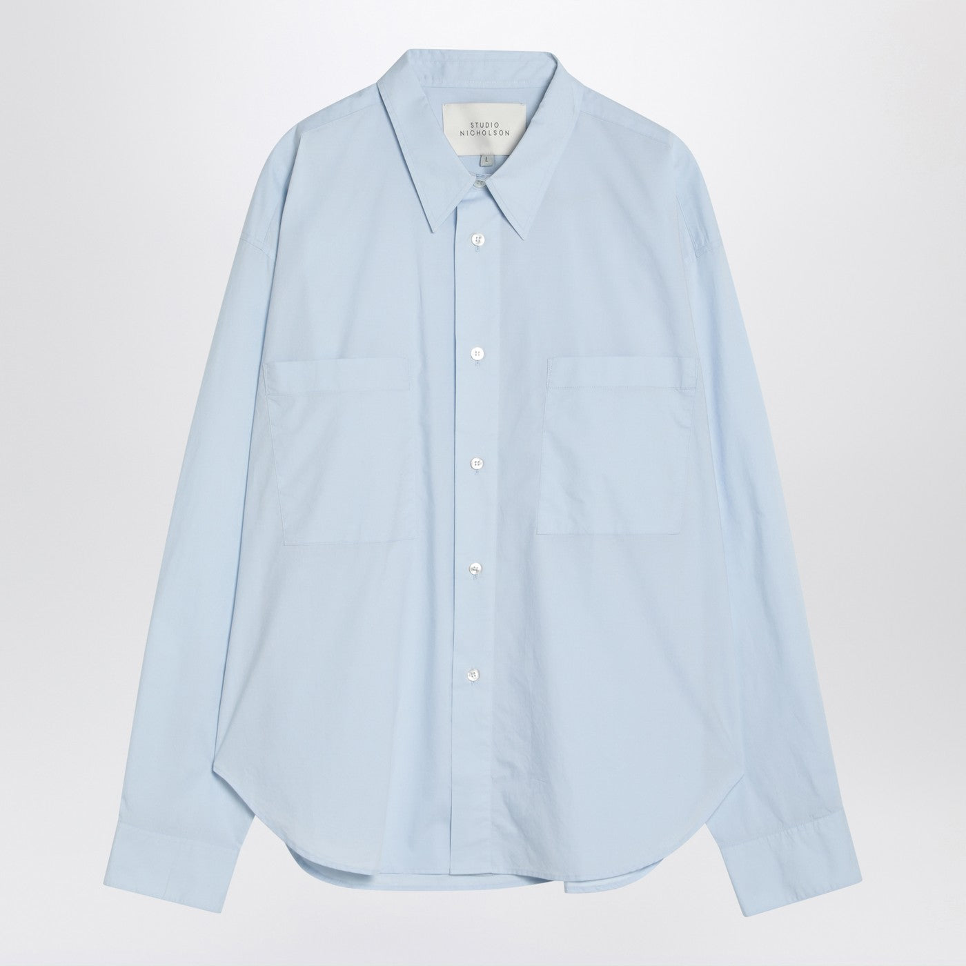 Studio Nicholson shirt in organic cotton blue, featuring a pointed collar, front buttoning, two patch pockets on the chest, long sleeves, buttoned cuffs, and a curved hem.