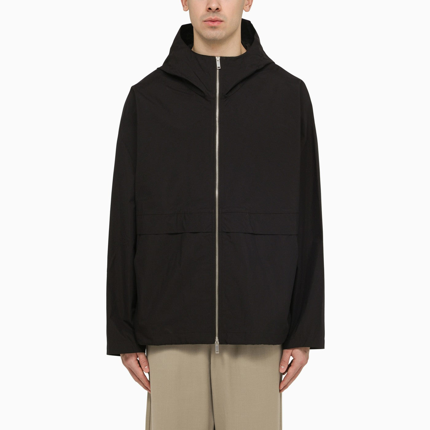 Dark navy blue cotton-blend jacket by Studio Nicholson features a fixed hood, a double-zip front fastening and two side welt pockets.