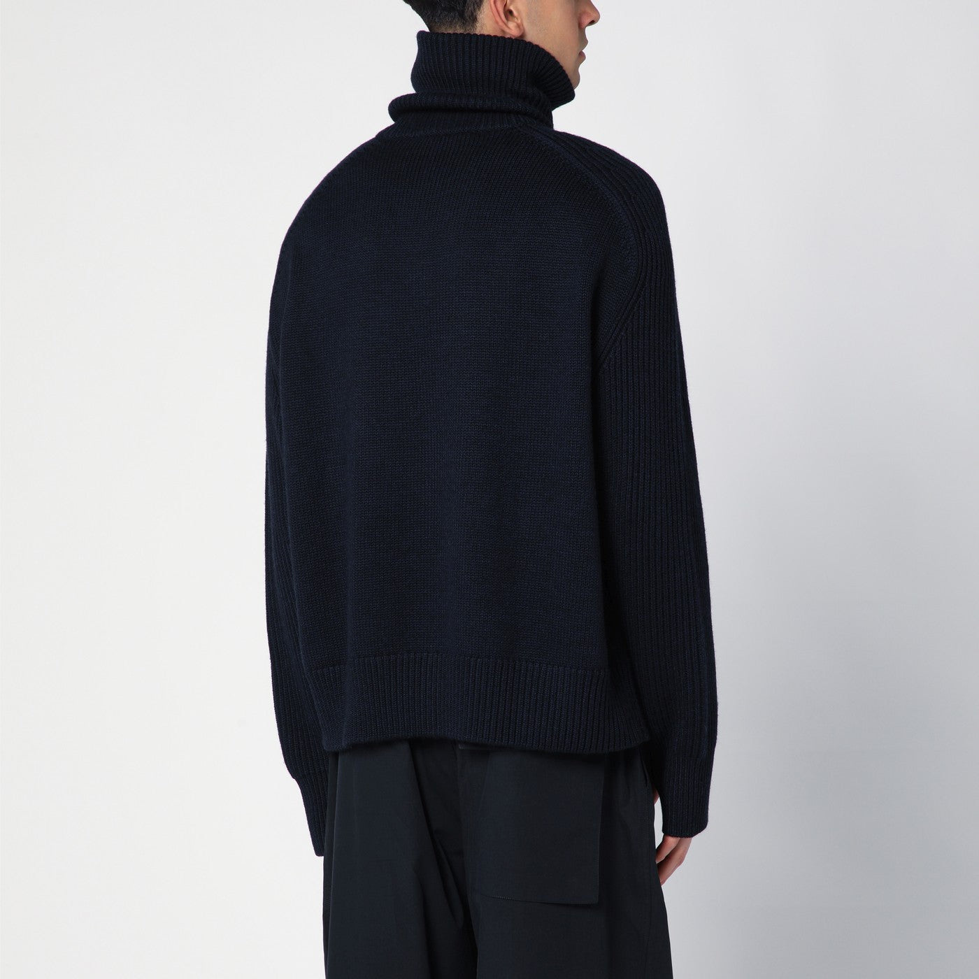 Merino wool jumper in navy blue by Studio Nicholson, featuring a high collar with zip fastening, long sleeves with a thumb loop cuff and ribbed edges.