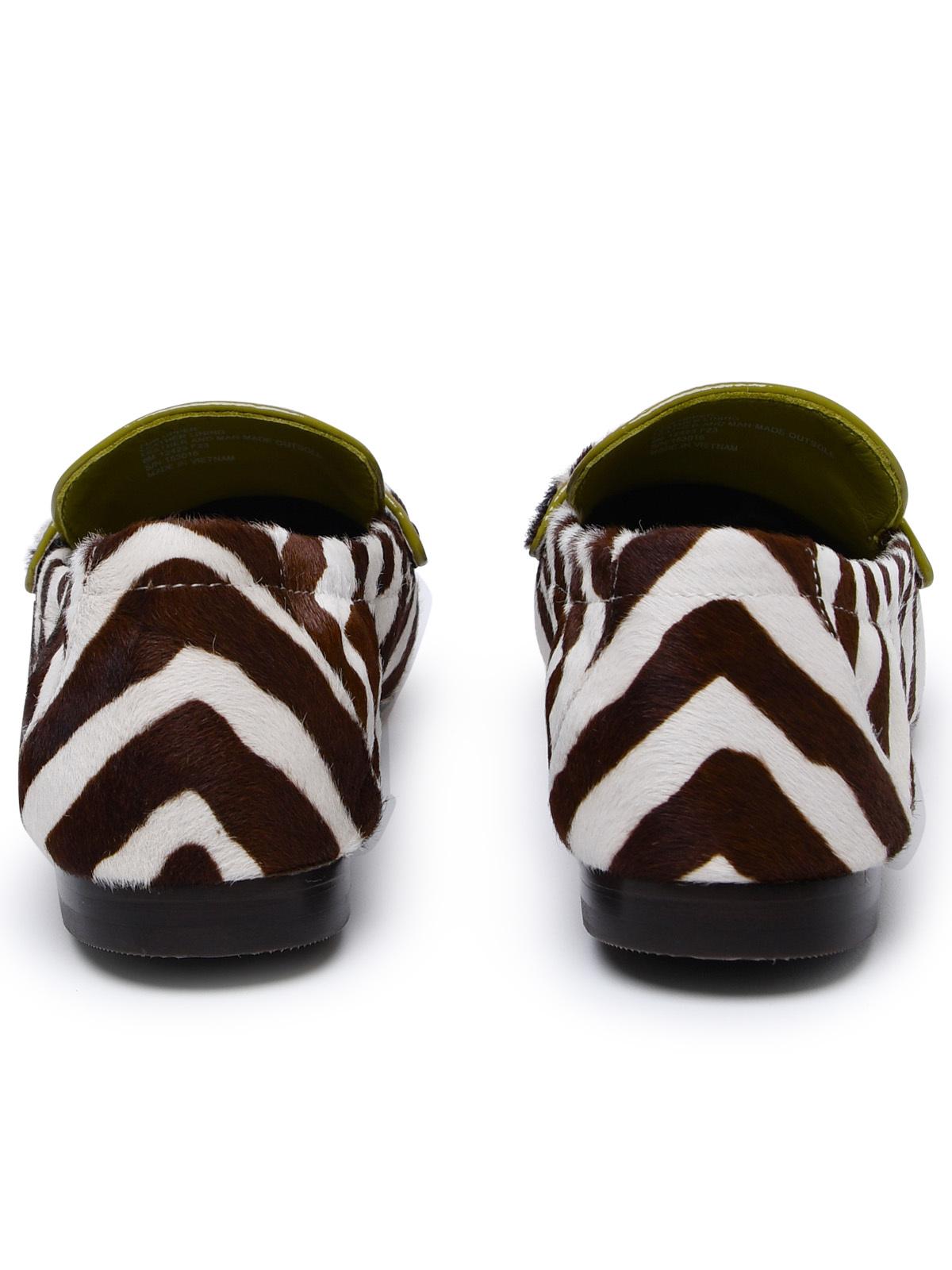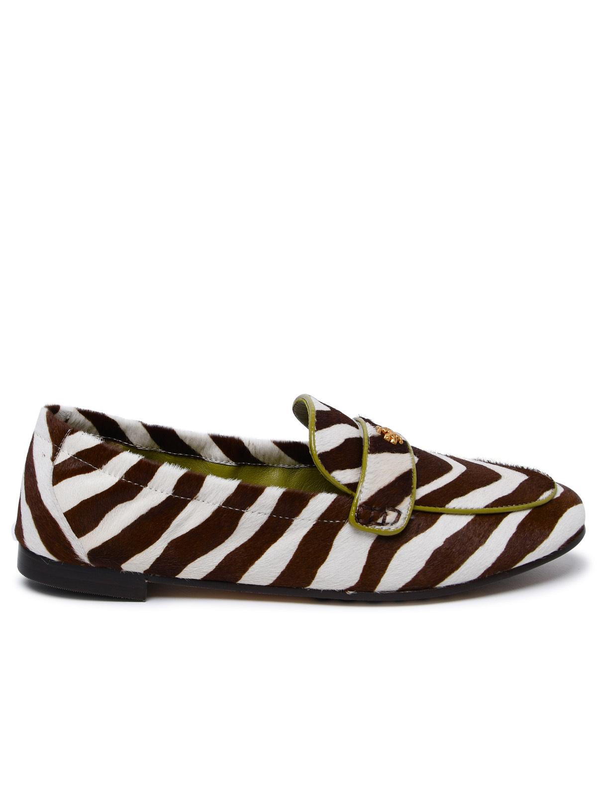 Made of soft calf leather with zebra print, almond toe, double gold 'T' logo applied on the front drawstring, hand-painted edges, polished leather sole and rubber pads \nHeel height 1 cm