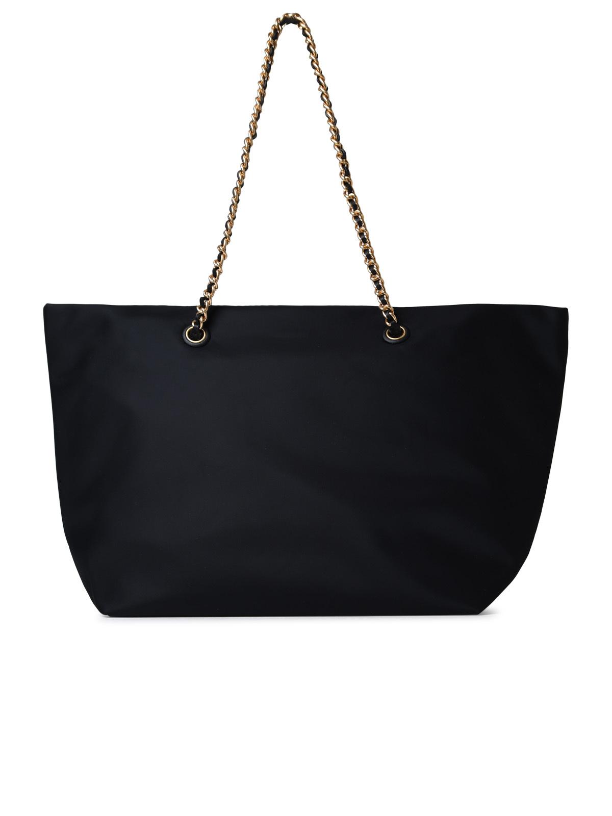 Front leather insert with snap button, chain shoulder strap, inner zip pocket, magnetic closure\n48 x 28 cm
