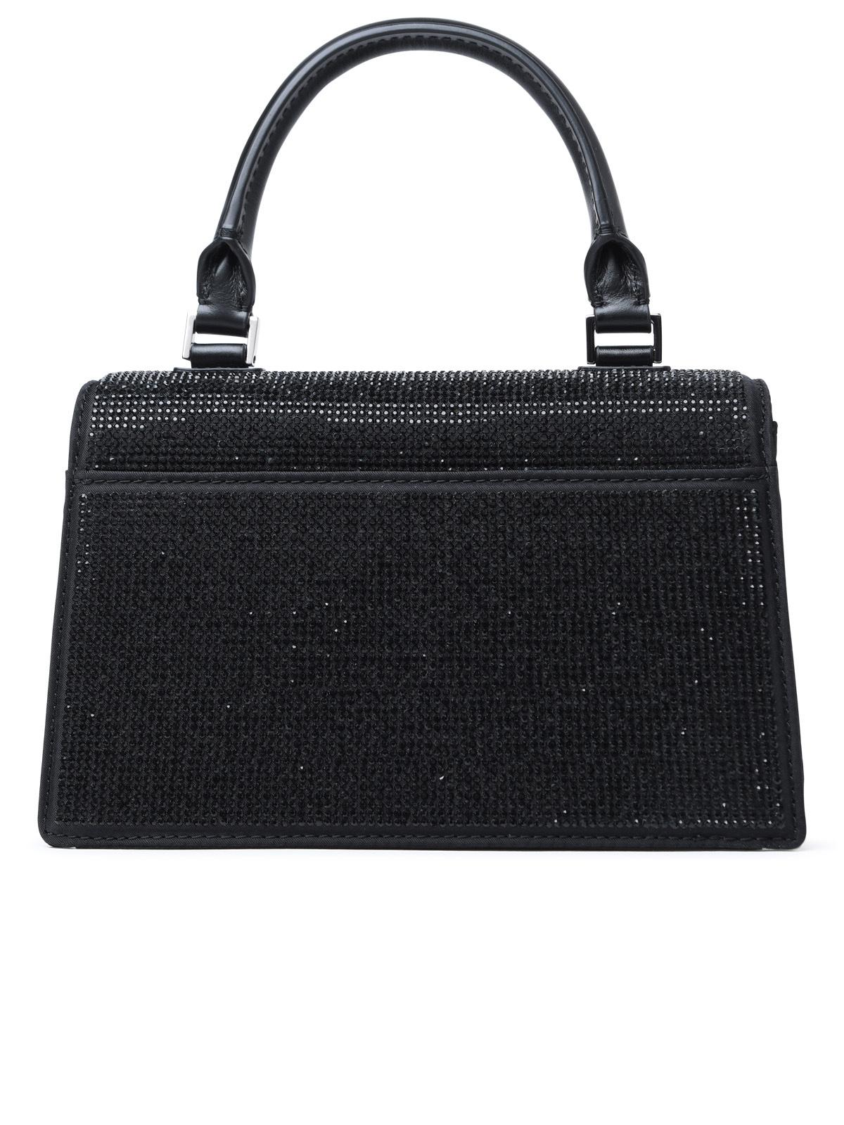 Mini bag in recycled nylon with hot-fixed stones and leather inserts, leather top handle, removable and adjustable shoulder strap, flap with magnetic closure, resin intarsia logo on the front, two card slots, welt pocket on the back.\n19.5 x 12 x 6.5 cm