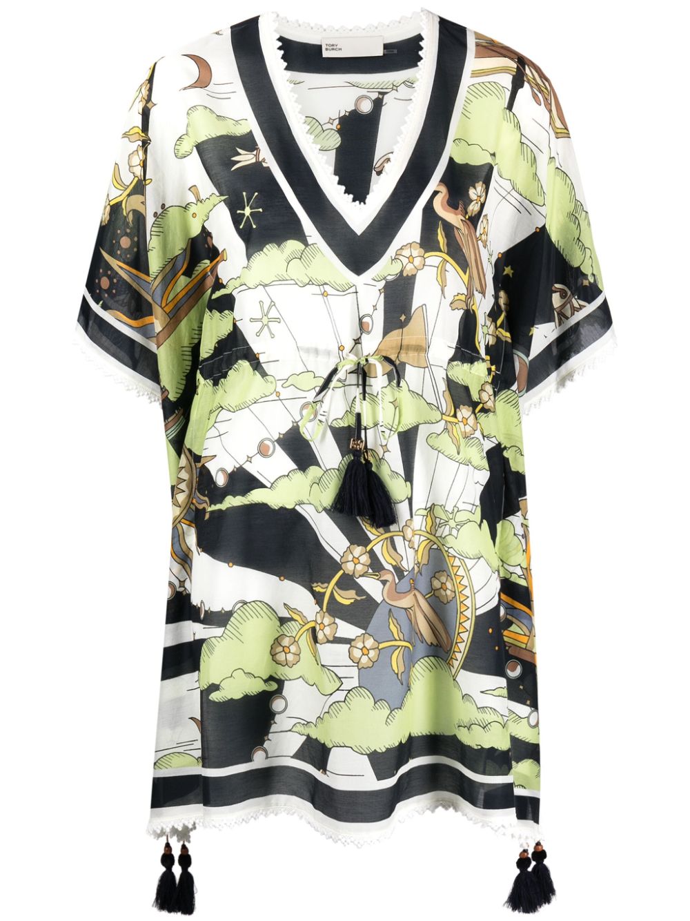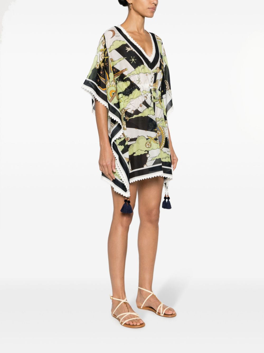multicolour cotton-silk blend semi-sheer panels crochet trim all-over graphic print V-neck internal drawstring fastening waist tassel detail short draped sleeves straight hem thigh-length