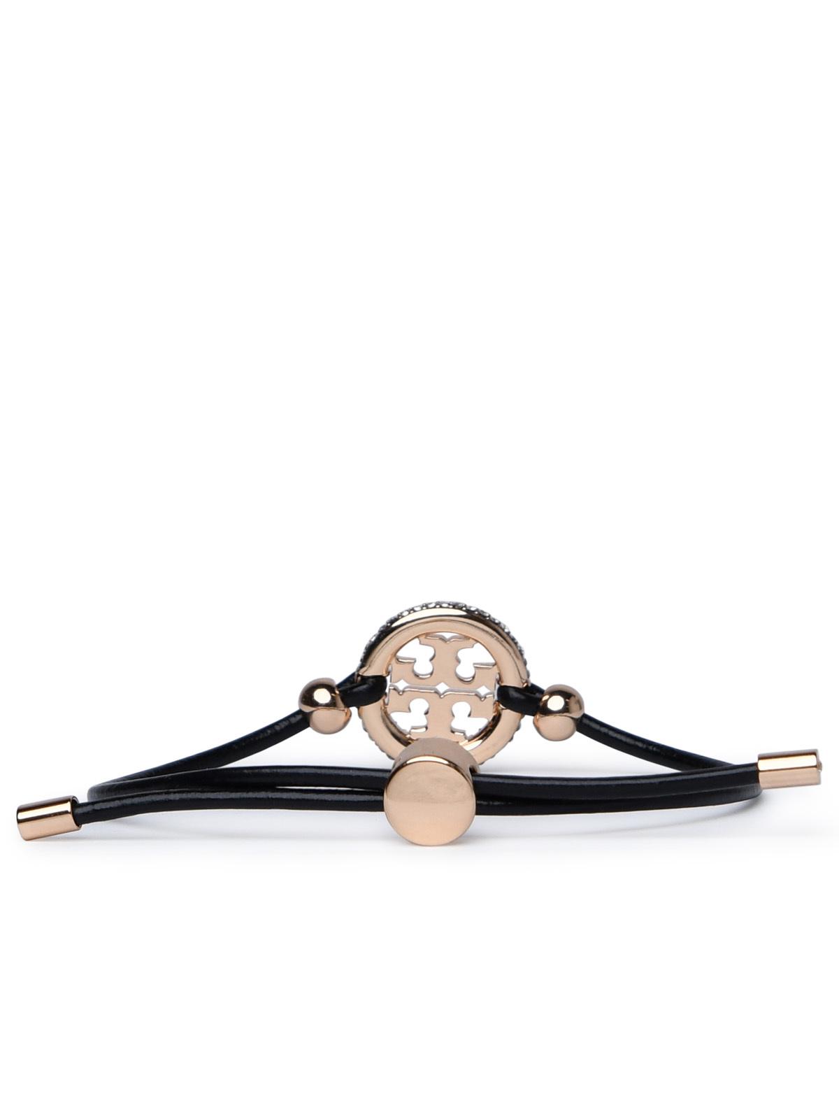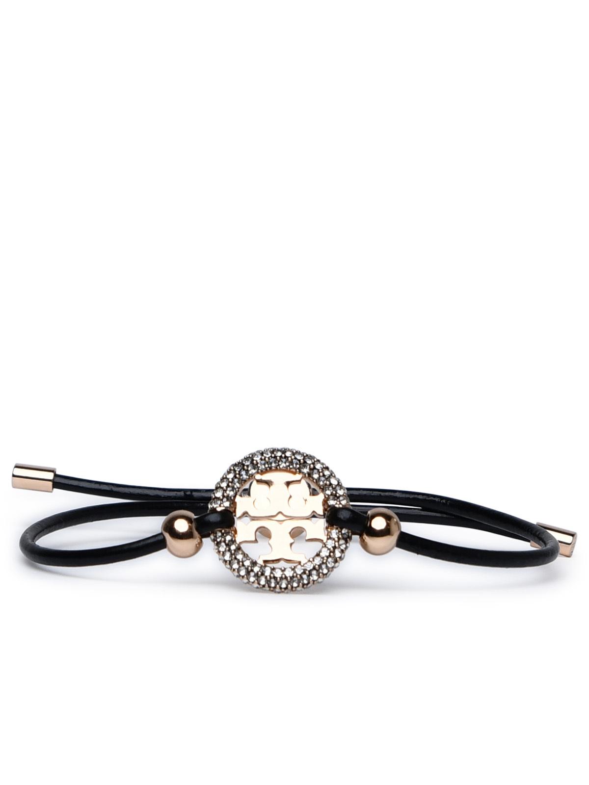 Bracelet in leather and gold-plated brass with jewel detail, sliding closure, double 'T' logo pendant with rhinestone detail, nickel free.