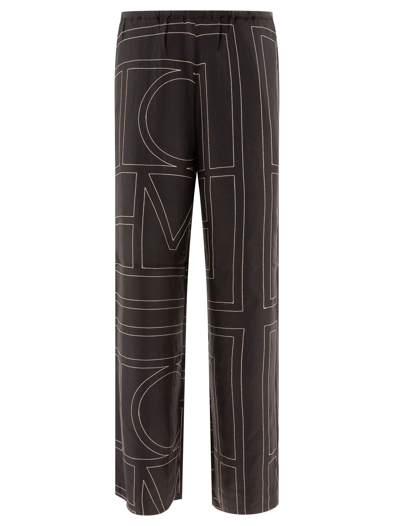 Discover Toteme's "Monogram" pajama-style pants, an authentic celebration of casual luxury. Made of fluid medium-weight silk twill, they feature a fine monogram motif embroidered in contrasting black thread. Their relaxed, straight silhouette, inspired by classic pajamas, makes them perfect for those seeking comfort and style for any occasion.