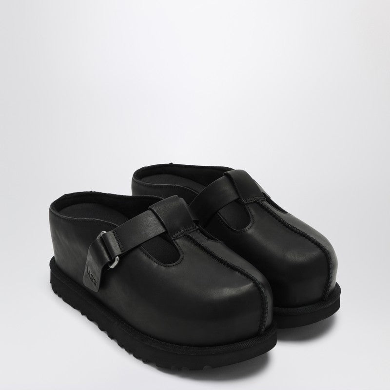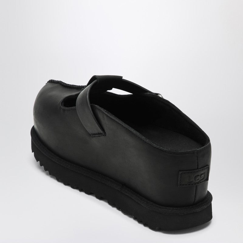 Ugg clogs in black leather, characterized by a round toe, internal platform sole, upper with strap with Velcro closure and logo lettering, rear logo patch and rubber sole.