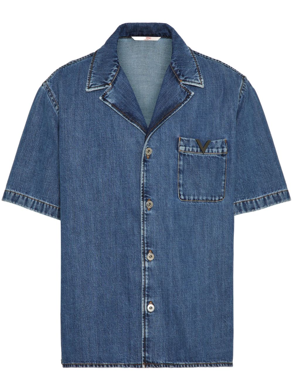 Valentino Ready To Wear blue cotton-lyocell blend silver-tone logo lettering Cuban collar front button fastening chest patch pocket short sleeves straight hem This item contains at least 50% materials which are certified or widely recognised as having a lower environmental impact through production and/or manufacturing processes that reduce water consumption and the use of harmful chemicals, or re-use by-products of the production process. Learn more about what makes a product Conscious on our Conscious Criteria page