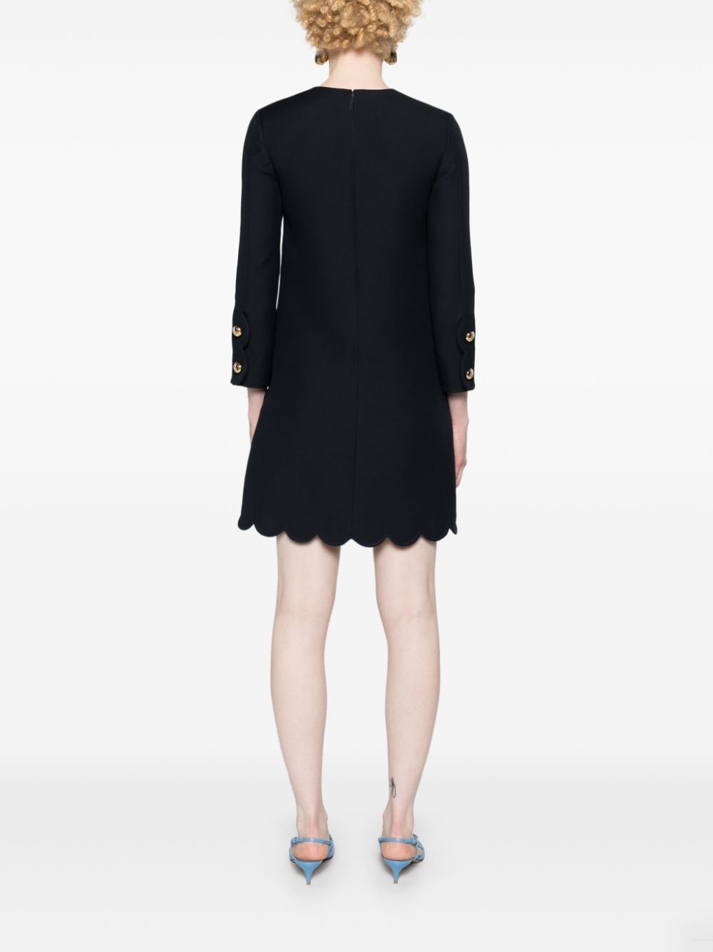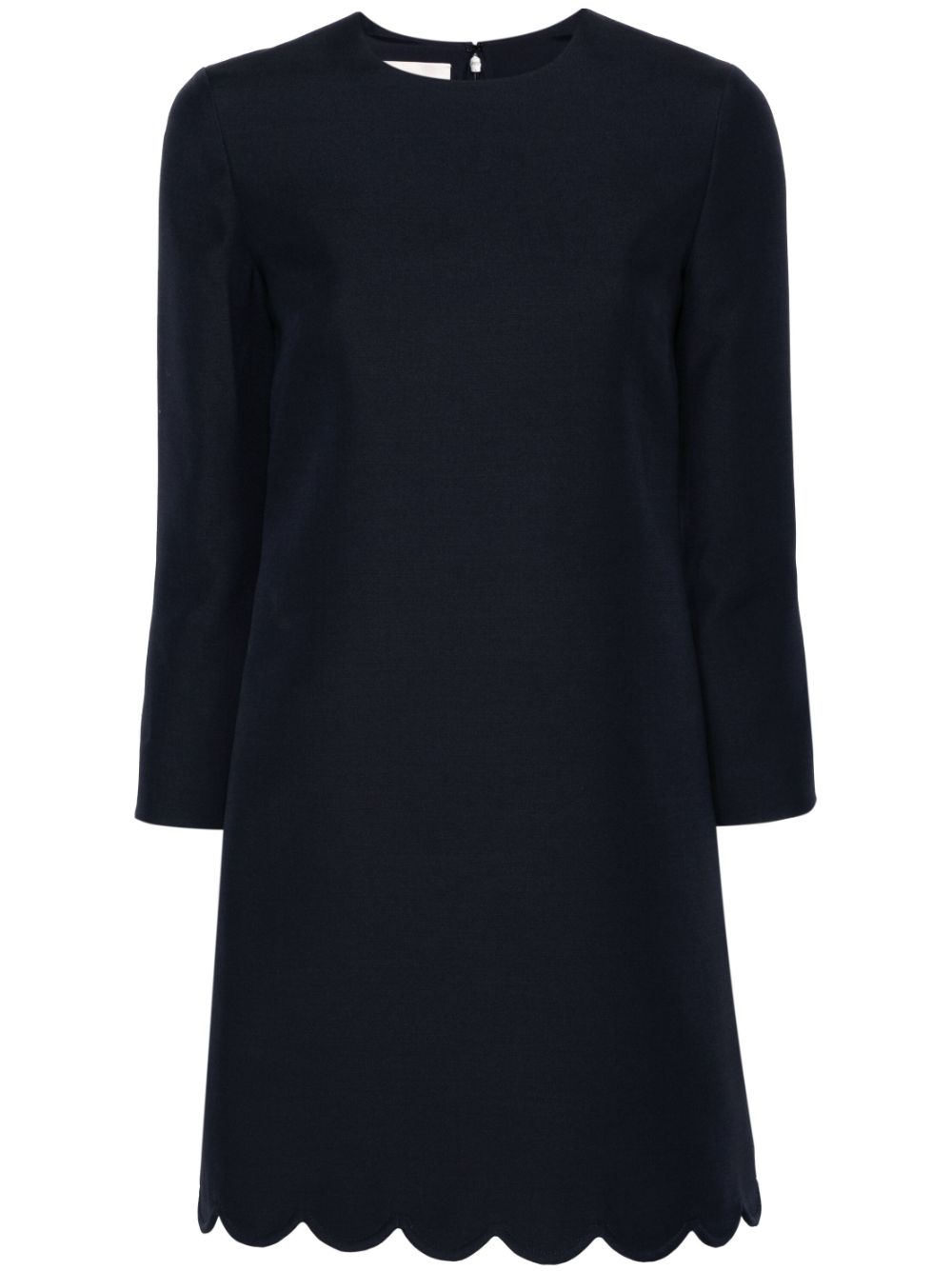 Valentino Ready To Wear navy blue virgin wool-silk blend round neck concealed rear hook and zip fastening long sleeves buttoned cuffs shift style scallop hem silk lining above-knee length