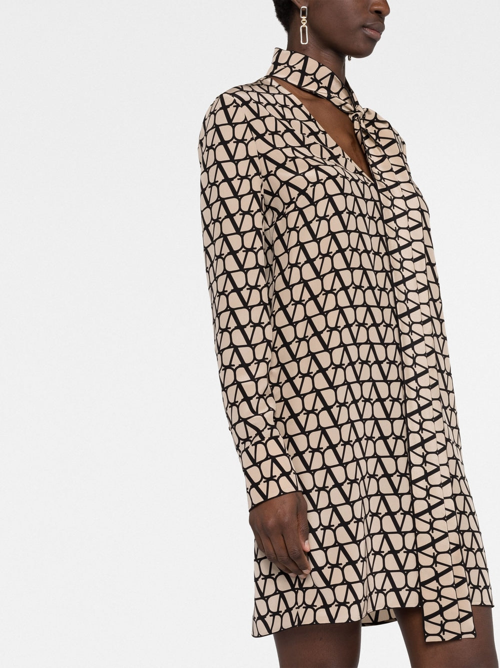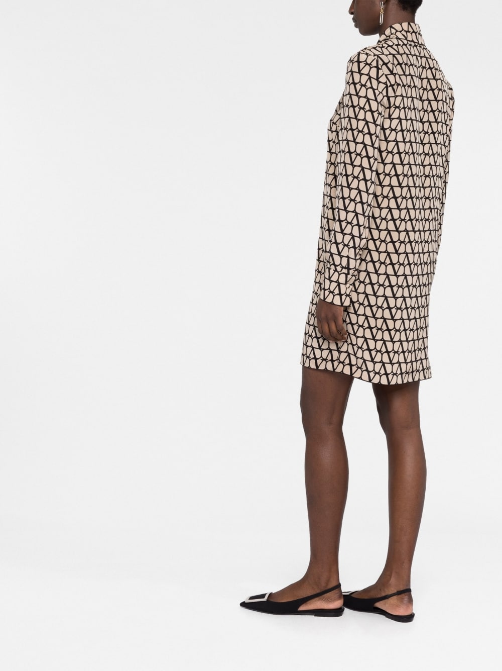Light beige/black silk shift style all-over logo print V-neck self-tie fastening long sleeves buttoned cuffs two side slit pockets straight hem thigh-length
