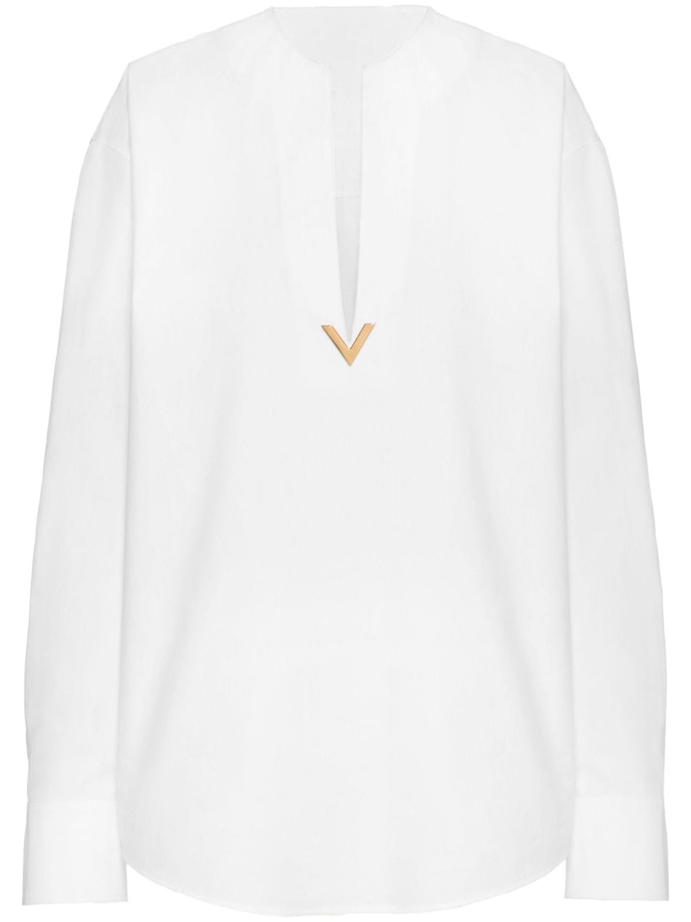 white cotton poplin texture gold-tone logo plaque plunging V-neck long sleeves buttoned cuffs curved hem