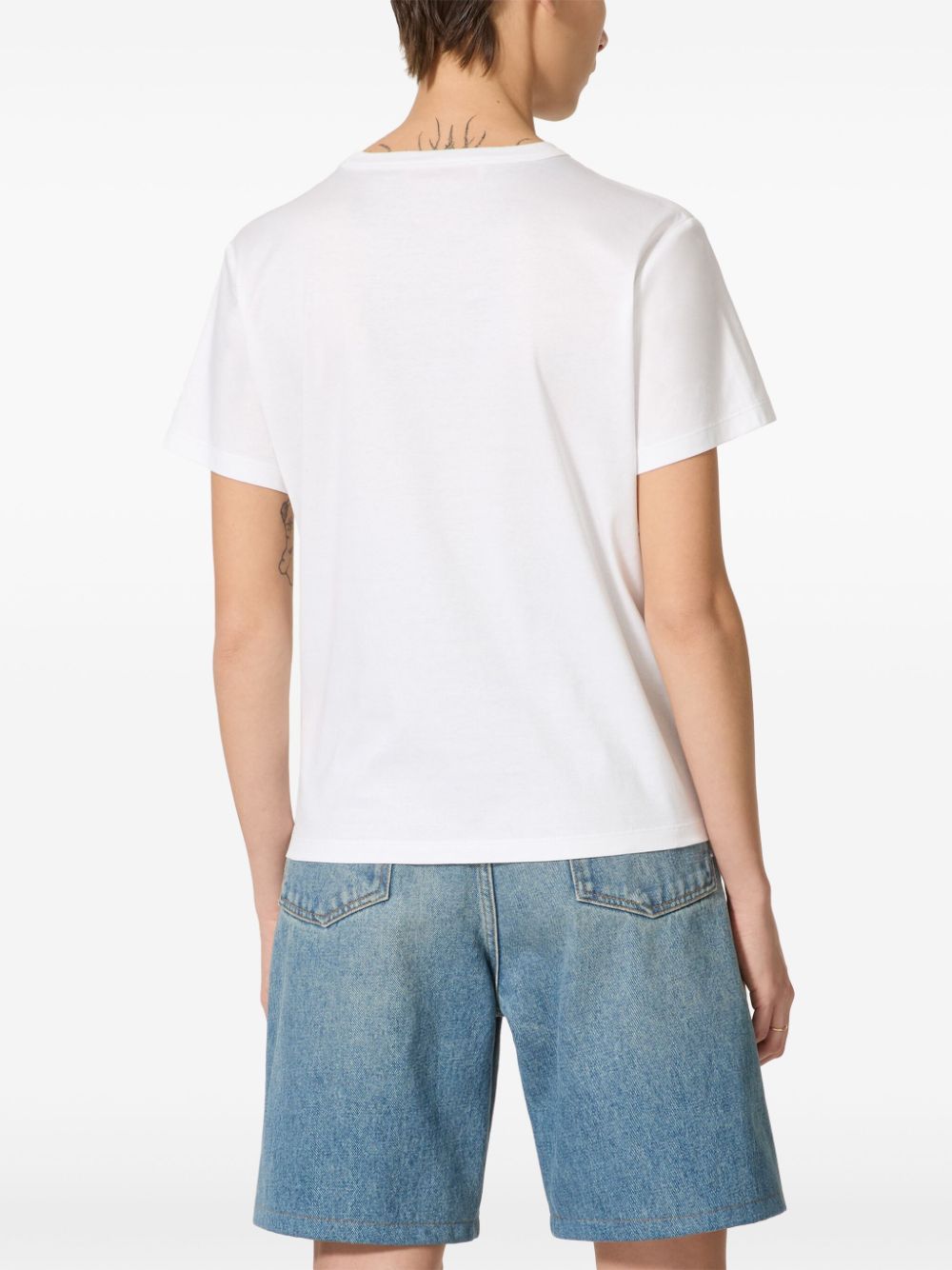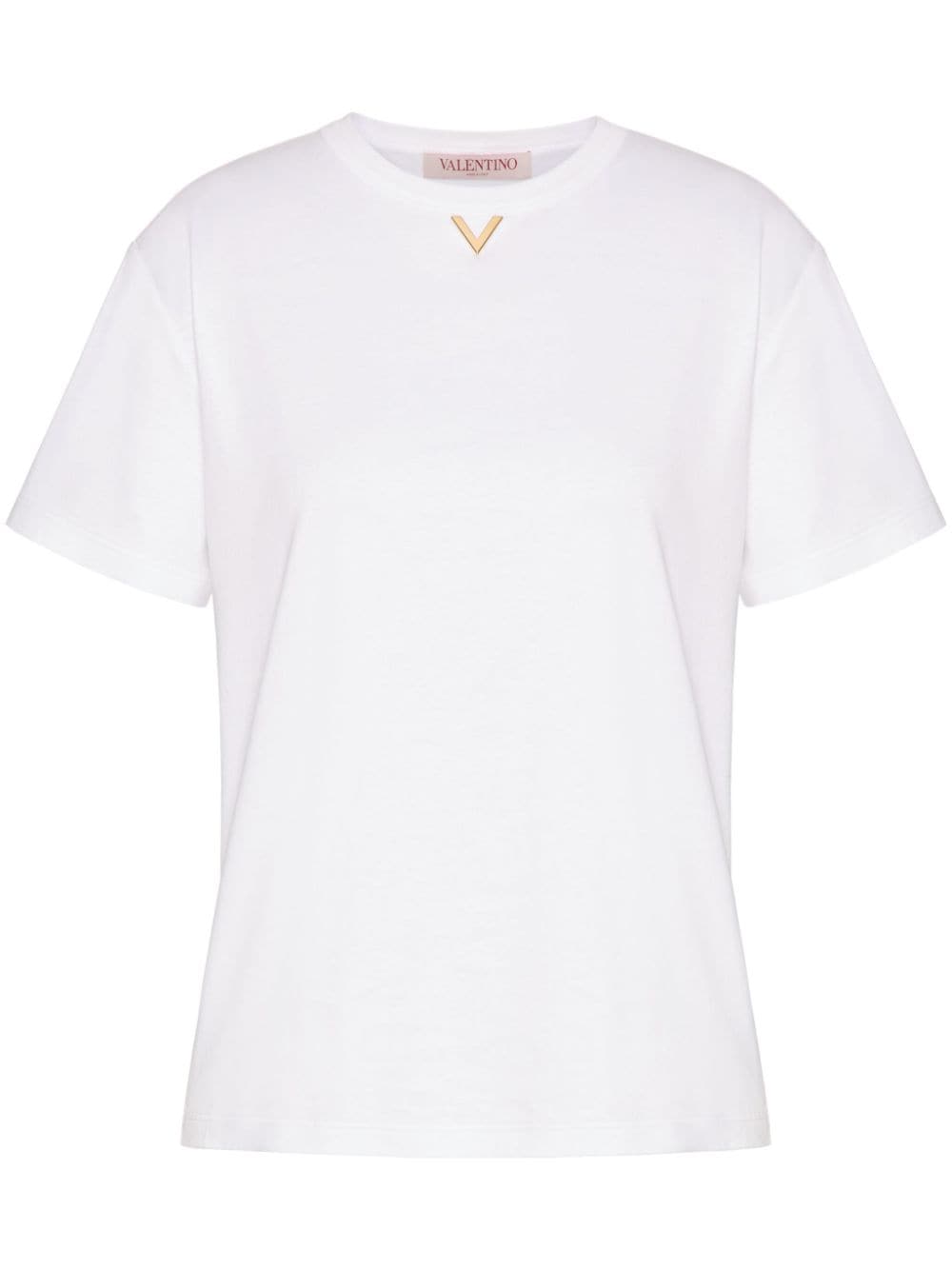 Valentino Ready To Wear white cotton jersey texture VGold detail crew neck short sleeves straight hem The full look includes Valentino Garavani accessories.