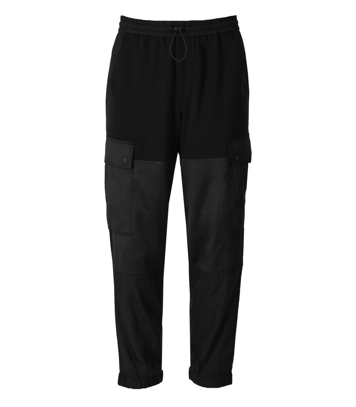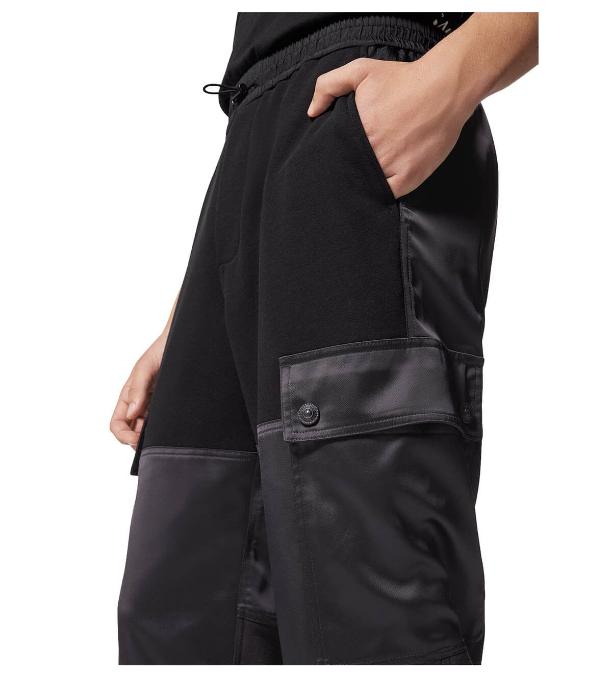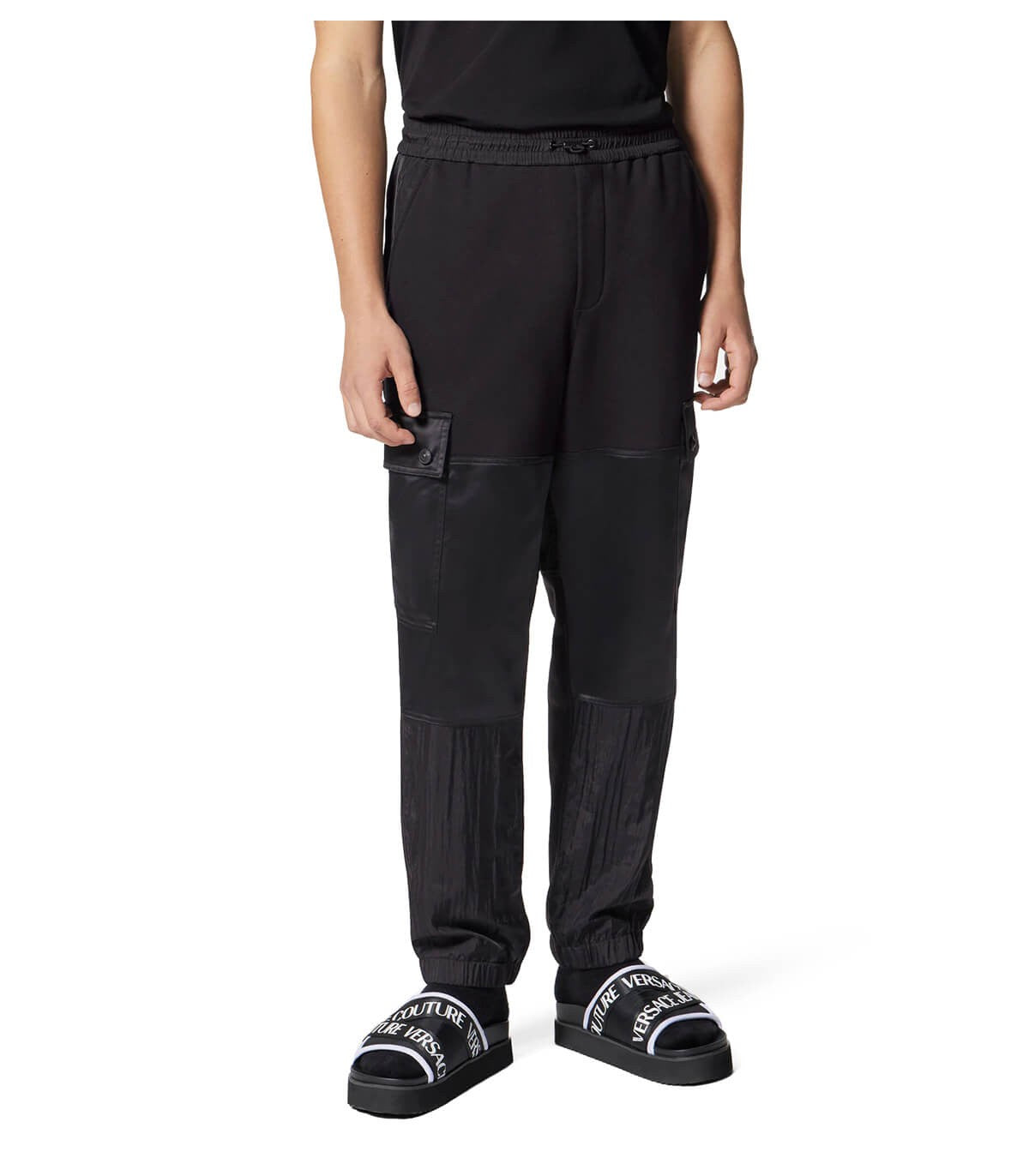 Versace Jeans Couture sweatpants made of cotton jersey, with satin and crinkled nylon inserts, in shades of black. Cargo pockets, elasticated waist with drawstring and contrasting logo print on the back. Breathable mesh lining. Fabric 1: 100% nylon. Fabric 2: 97% Polyester, 3% Elastane. Fabric 3: 100% Cotton. Lining: 100% polyester.