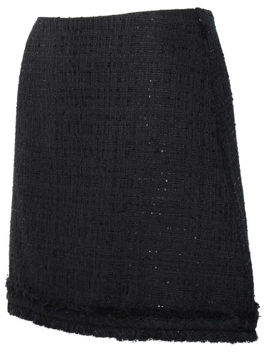 Trapeze mini skirt in cotton-blend tweed, beads and all-over crystal decoration, side zip closure, frayed hem