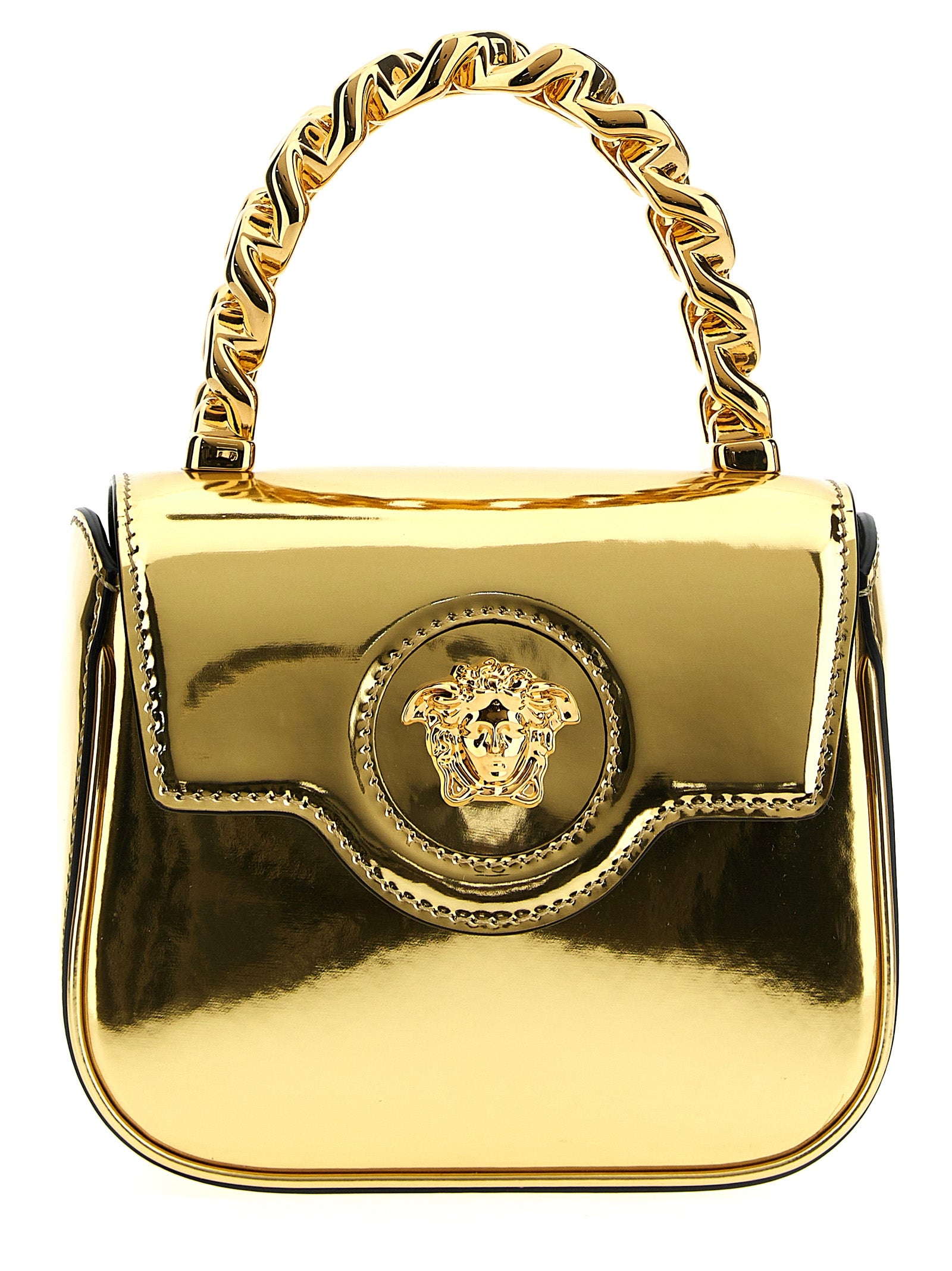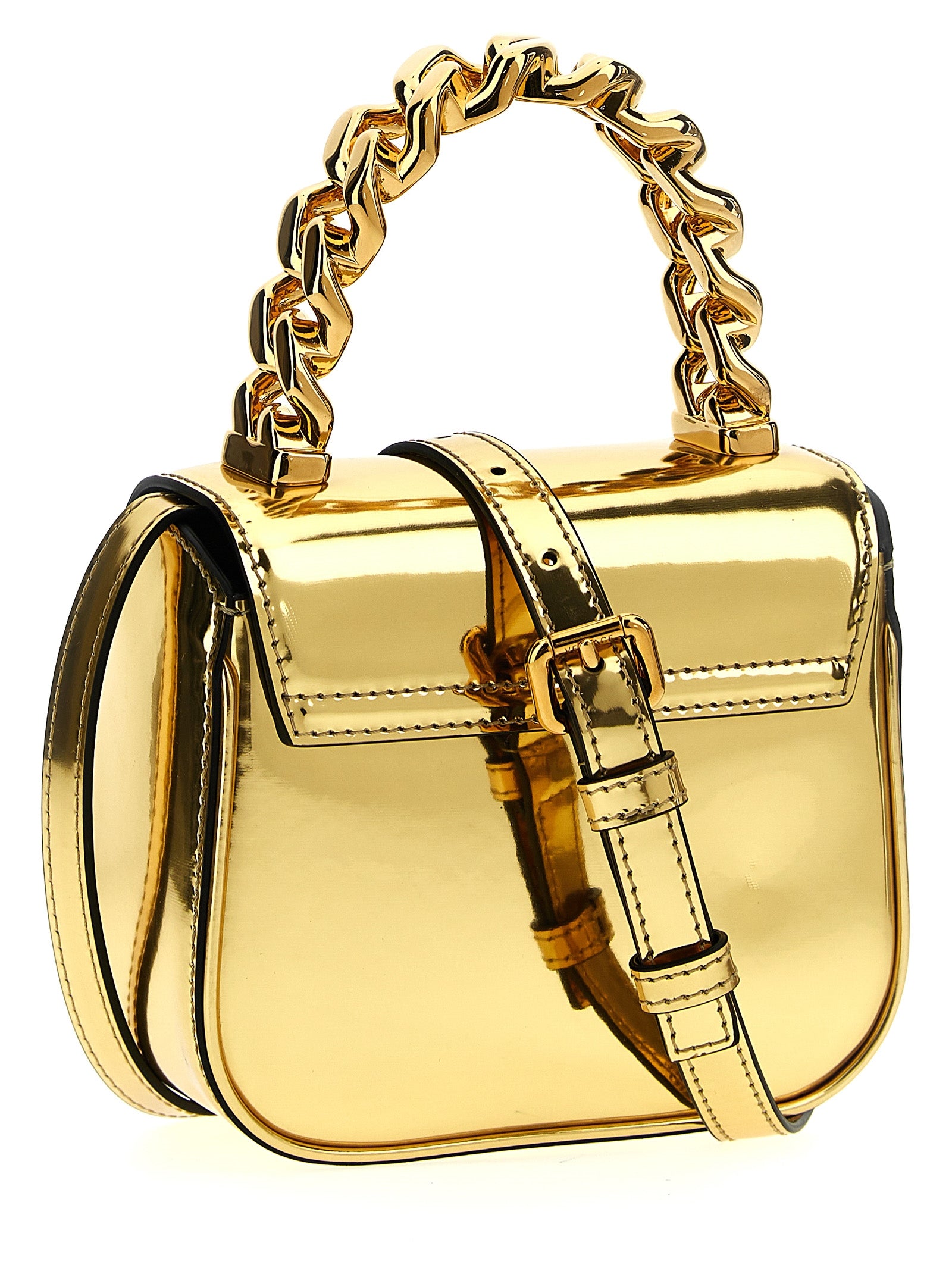 'La Medusa' laminated leather mini handbag with magnetic closure, front metal application, rigid chain handle, adjustable and removable shoulder strap.