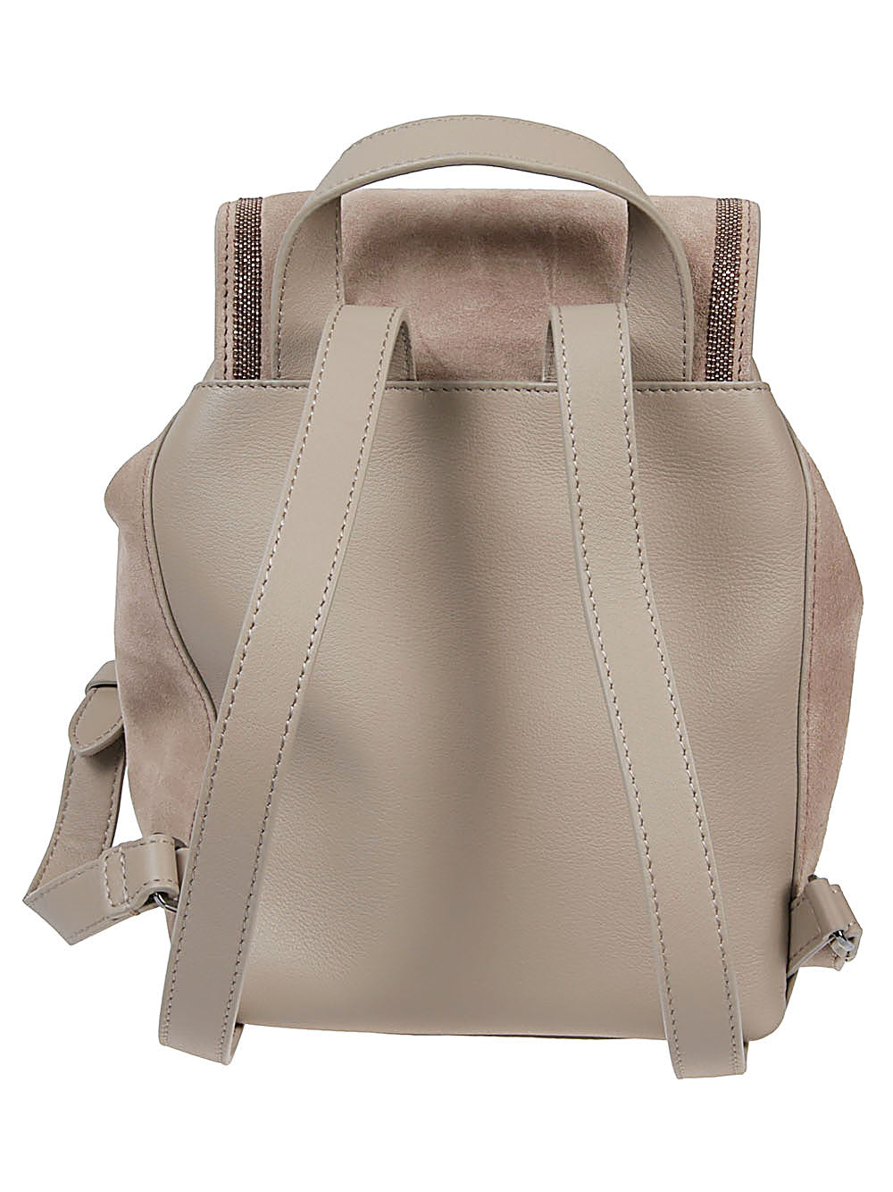 Backpack with flap edges are entirely embroidered with a line of brilliant monili, nappa trim, drawstring bag closure and adjustable shoulder straps.