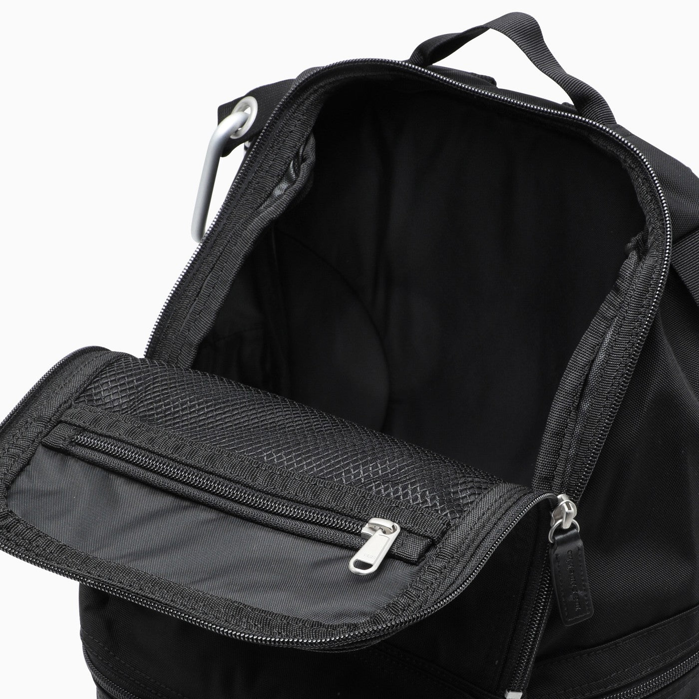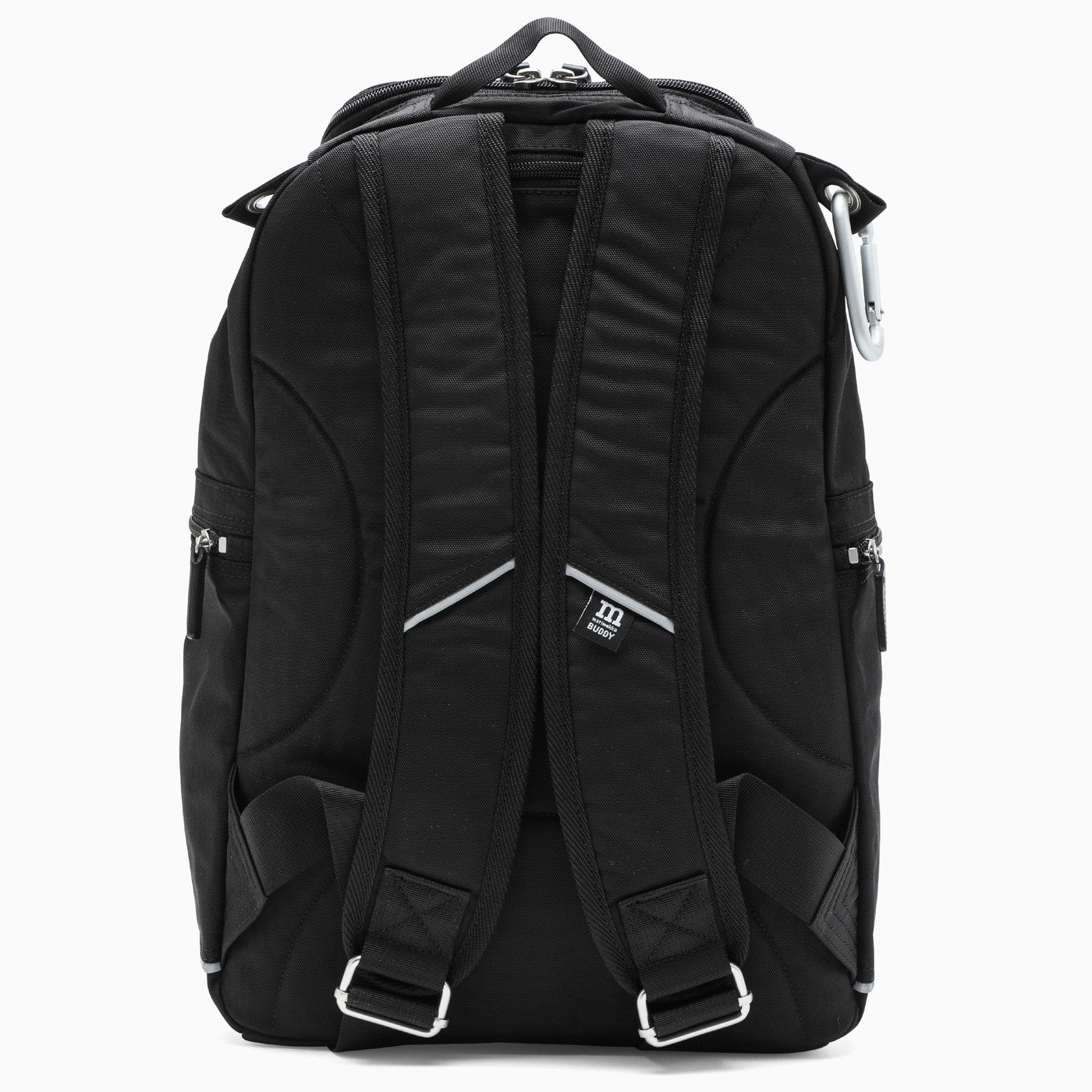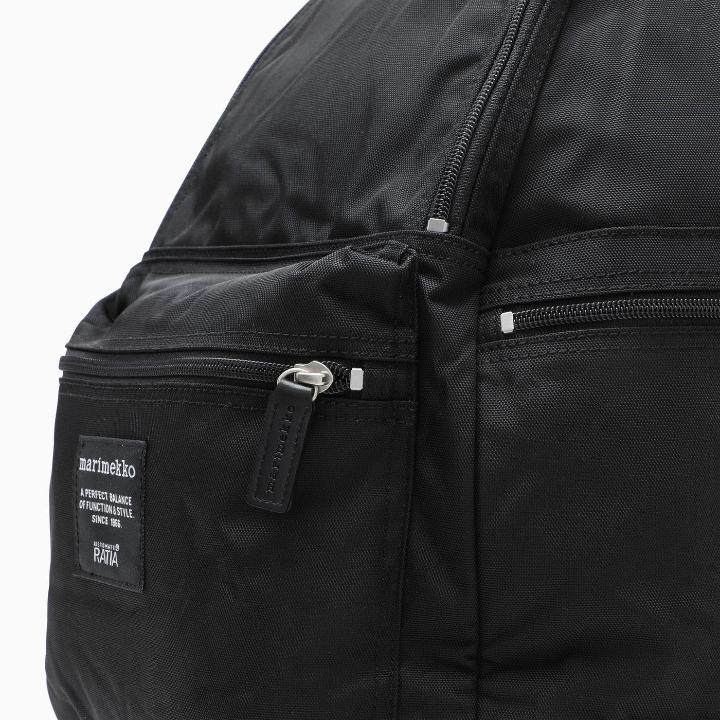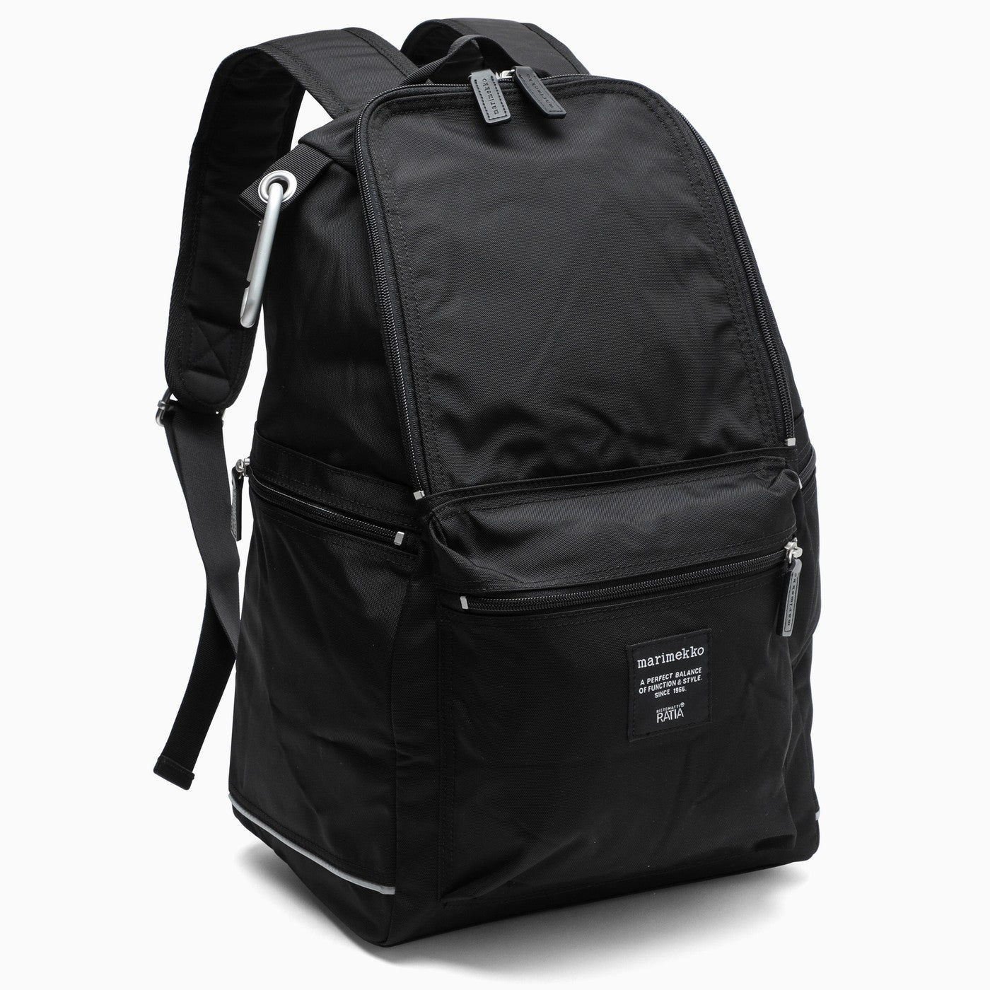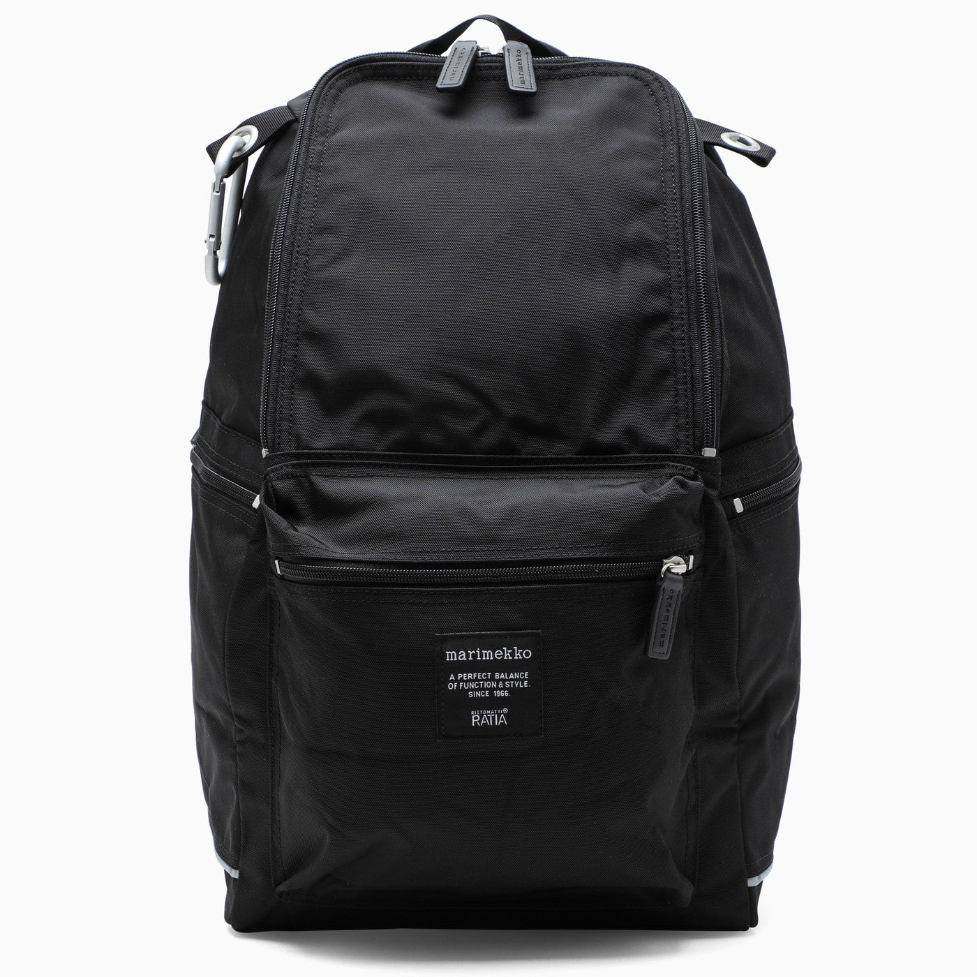 Black nylon backpack by Marimekko featuring double-zip closure, front zip pocket with logo patch, padded adjustable straps, two side zip pockets and side carabiner detailing.