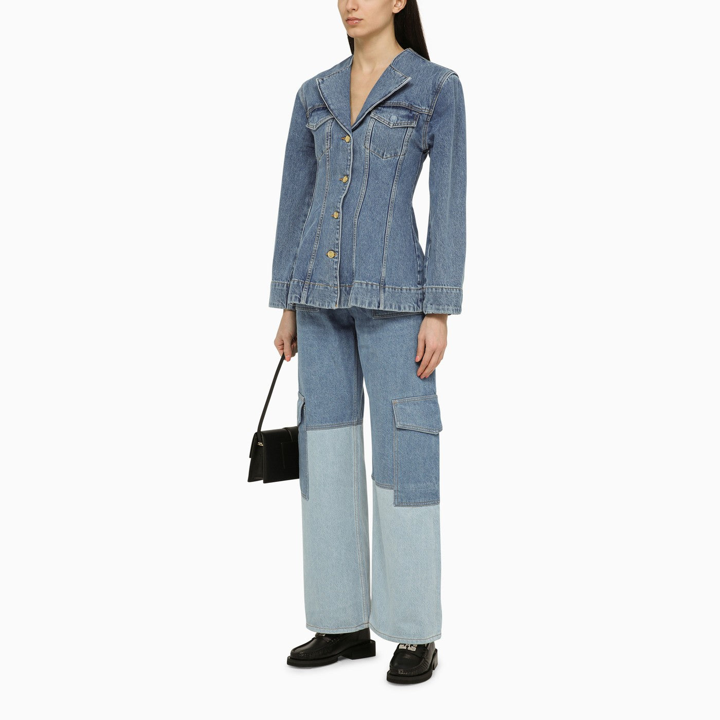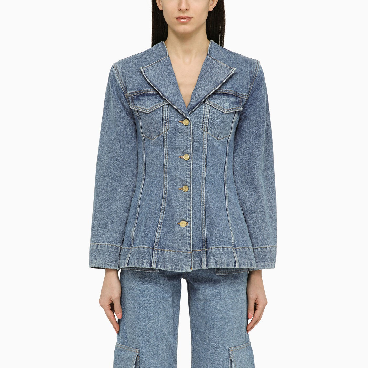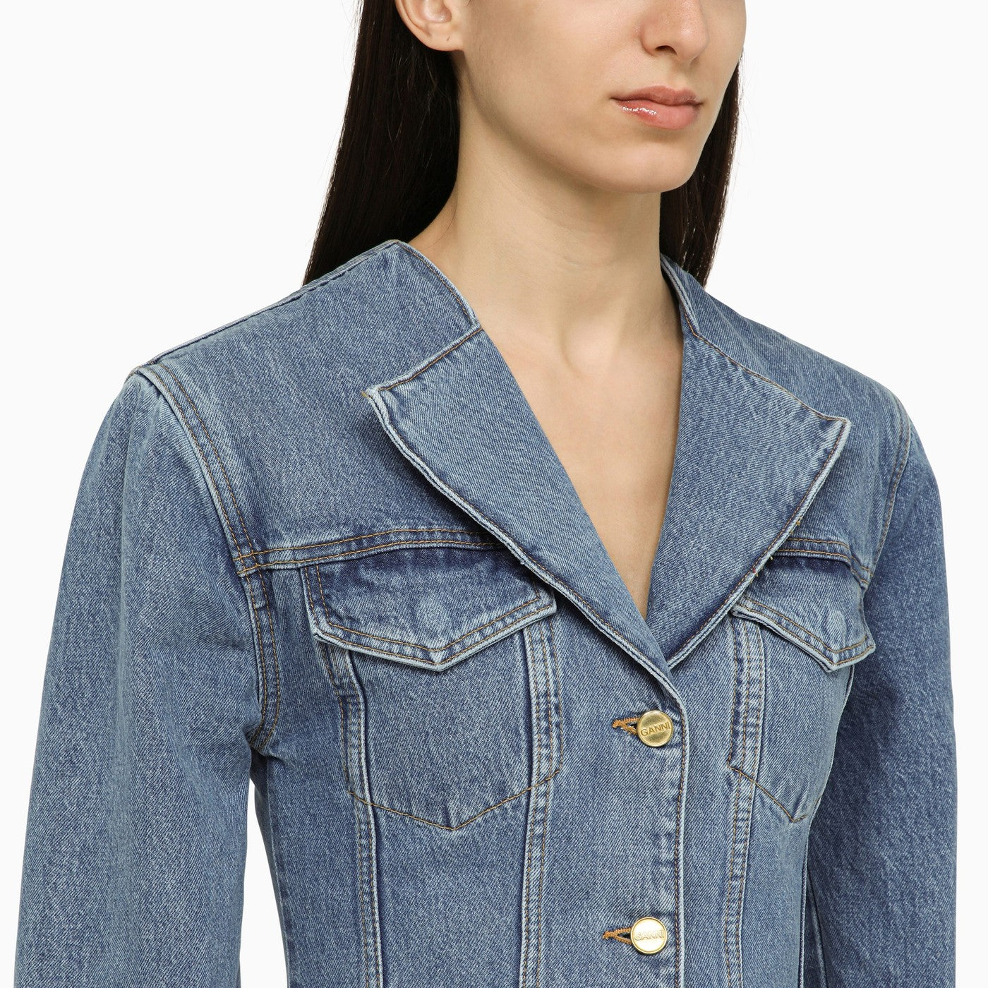 Vintage mid blue organic cotton denim jacket by Ganni, featuring front fastening with logo buttons, long sleeves and two chest pockets with flaps.